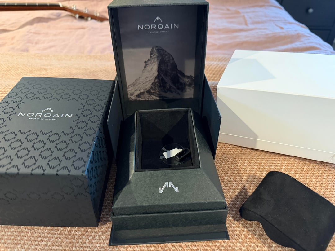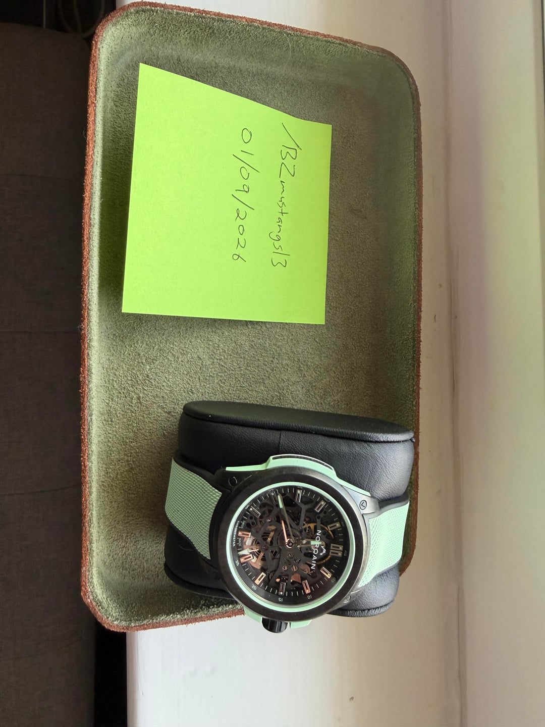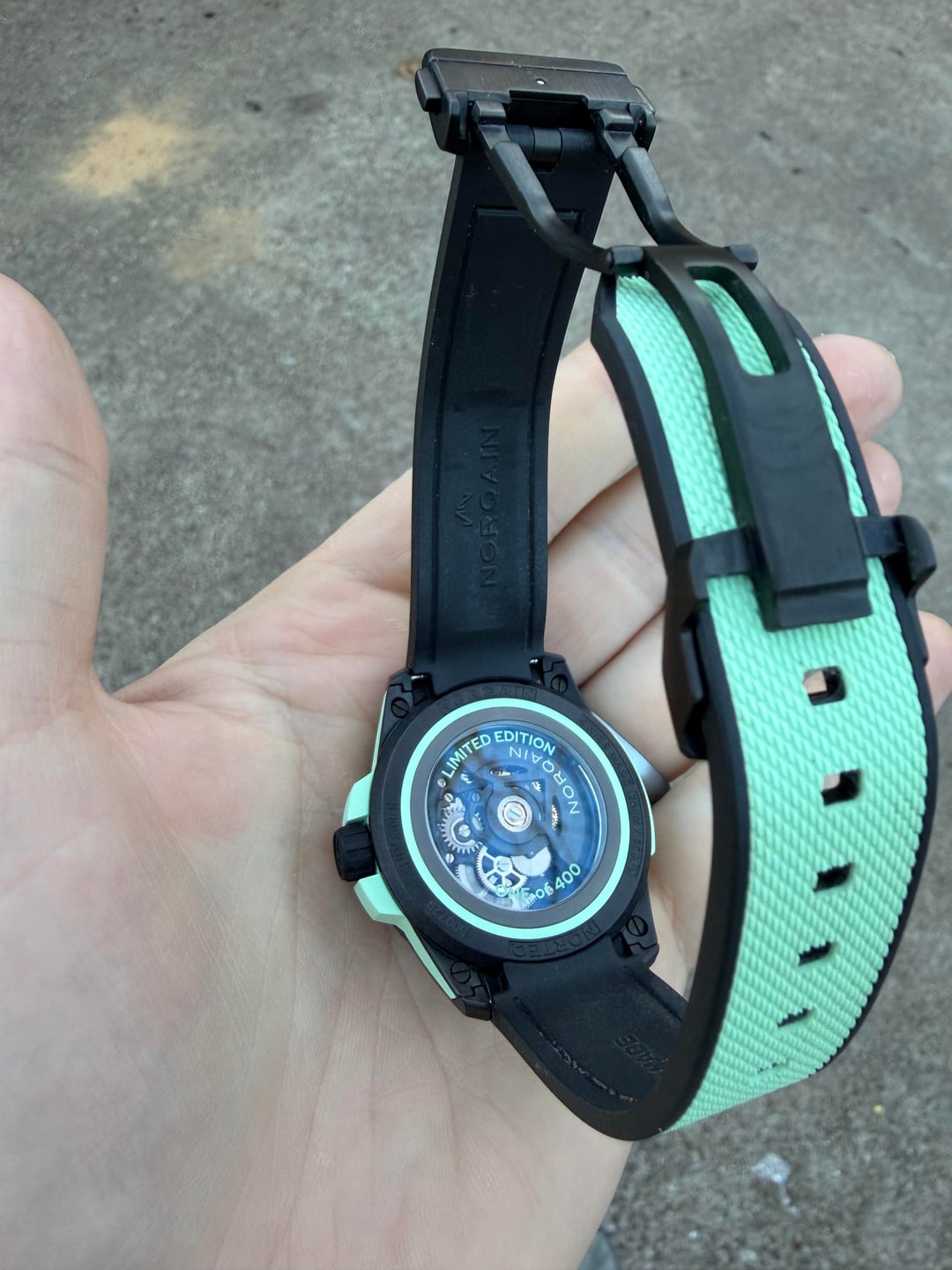 Selling my 39mm Norqain Wild One Mint special edition! Original owner purchased from an AD. Excellent condition. Owner less than 1 year. Very clean, runs great. Includes the quick adjust deployant clasp which is excellent. Full kit. Asking $4500 shipped & insured. Literally weighs less than my Gshock square, I measured them. Extremely comfortable and a super fun wear, especially in the summer. Selling to fund a non-watch need. Will miss this thing, it’s just a fun watch! Feel free to ping me for any questions, extra pics etc.
