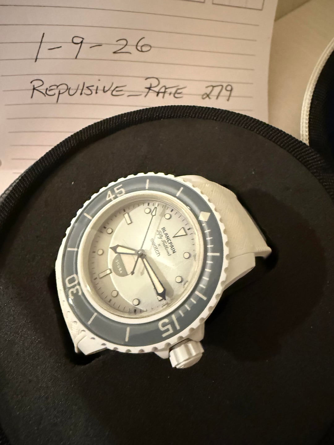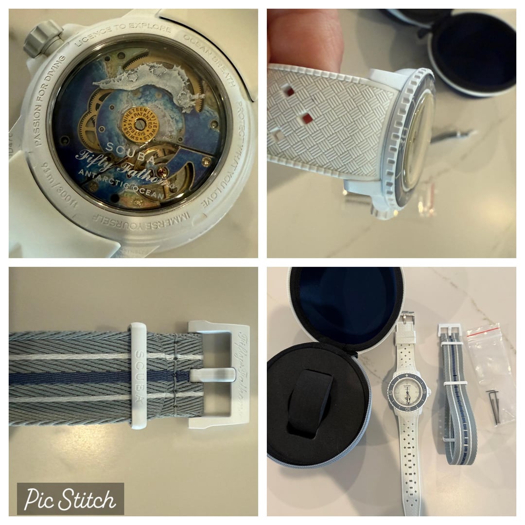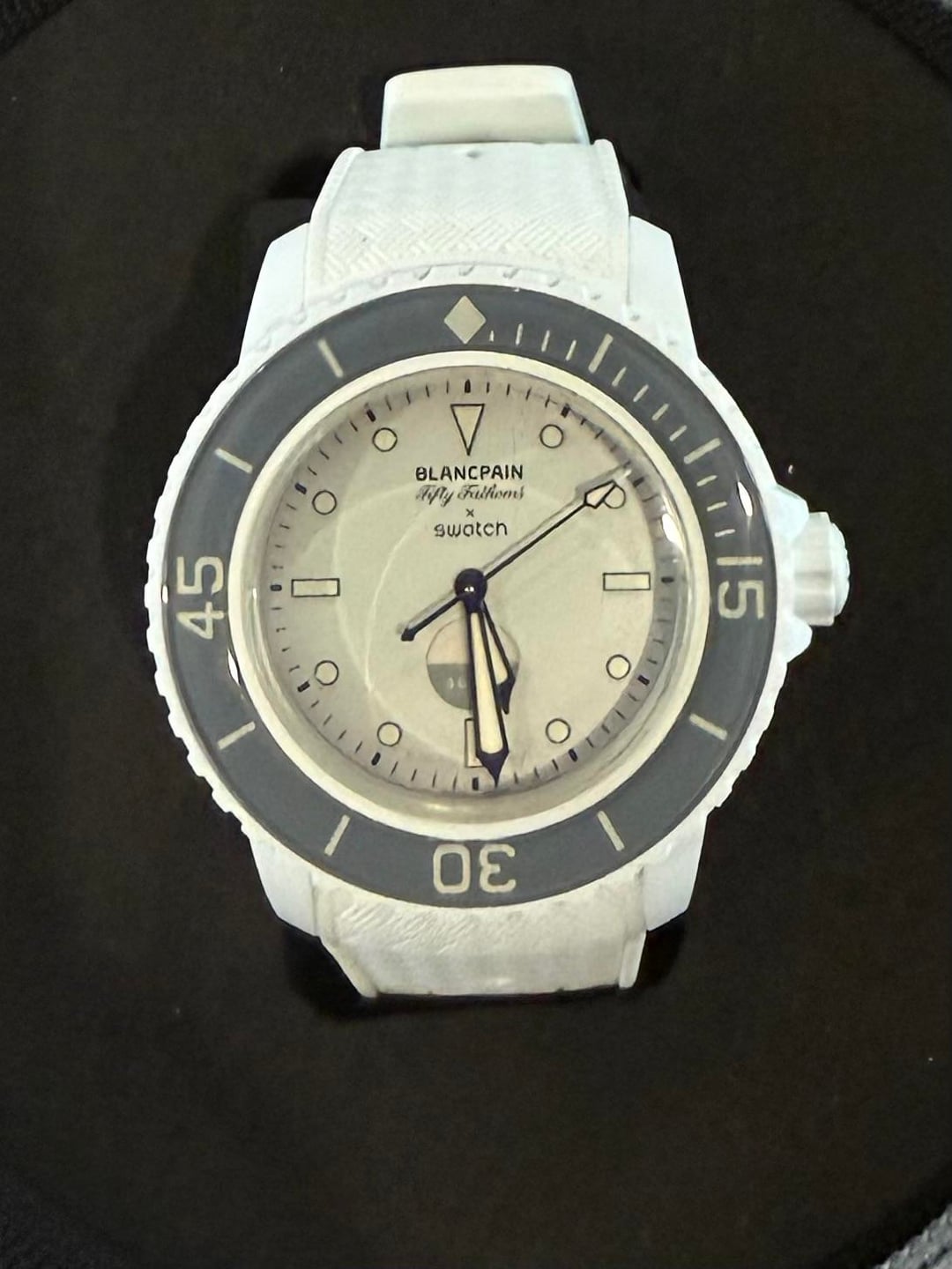 Up for sale or trade is one of my favorites **Blancpain x Swatch Fifty Fathoms – Antarctic Ocean**. Purchased directly from the Swatch store in Orlando. Comes with NATO band, rubber dive band, pins and tools, and the original case. **Timestamp:** Included in photos (taken today). **Details:** • **Model:** Blancpain x Swatch Fifty Fathoms – Antarctic Ocean • **Case:** 42.3mm Bioceramic • **Movement:** Sistem51 automatic • **Dial:** White / Gray • **Bezel:** Unidirectional dive bezel • **Crystal:** Domed bio-sourced glass • **Water Resistance:** 91m / 300ft • **Strap:** Original NATO-style strap plus vintage style strap • **Lume:** Super-LumiNova • **Caseback:** Exhibition caseback **Condition:** Beautiful lightweight watch — original NATO strap is in pristine unused condition. No issues; runs as it should have always worn with great care. **Price:** **$350 USD** or Trade preferably for Field Watch or 36mm-38mm dress watch **Payment:** PayPal F&F preferred. PayPal G&S accepted at buyer’s expense. Venmo accepted for established members. **Shipping:** CONUS only. Insured shipping included. Ships within 3 business days of payment. Please comment before PM or chat. I have over 590 positive buy/sell reviews on the Bay in addition to several watch sales on W\*S.