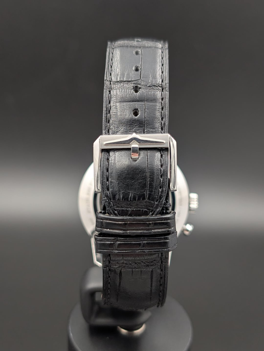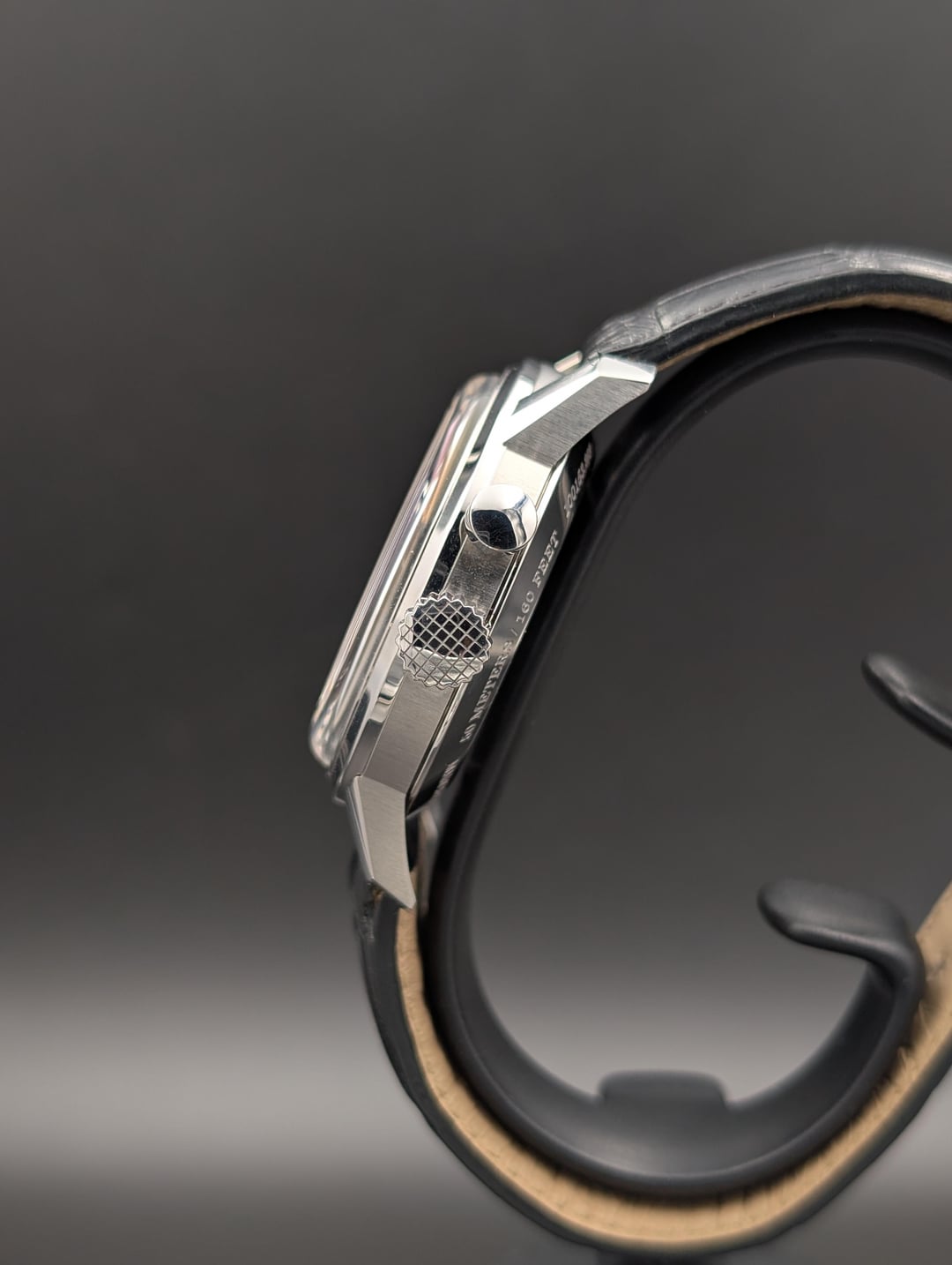 This model was Vulcain's entry into the 2011 Grand Prix d'Horlogerie de Genève (GPHG). Inspired by one of the finest hours in its history, Vulcain revives the original spirit of the alarm in The Heritage Presidents' Watch limited series. An identical re-edition of the 1950 model, it houses the famous hand-wound Cricket V-10 movement. Original MSRP was approx. $5,600 in 2011. The watch is in excellent condition. The watch winds, sets, and runs. The alarm function winds, sets, and buzzes. Comes with inner wooden box, outer box, and booklet. Model: Vulcain 'The Heritage Presidents' Watch' Cricket Limited Edition ref. 100153.289LF Note: identical re-issue of the 1950 model, GPHG 2011 entrant, limited to 500 numbered pieces Movement: Vulcain cal. V-10 double-barrel, manual-winding, 18,000 vph (2.5 hz) Dial: dark gray sunburst Case: 39mm stainless steel Thickness: 12.4mm Crown: pull (wind towards 6 for watch power, wind toward 12 for alarm power) Strap: original black leather with Vulcain pin buckle **Watch offered at $2,999 OBO shipped. USA shipping only. No trades.**