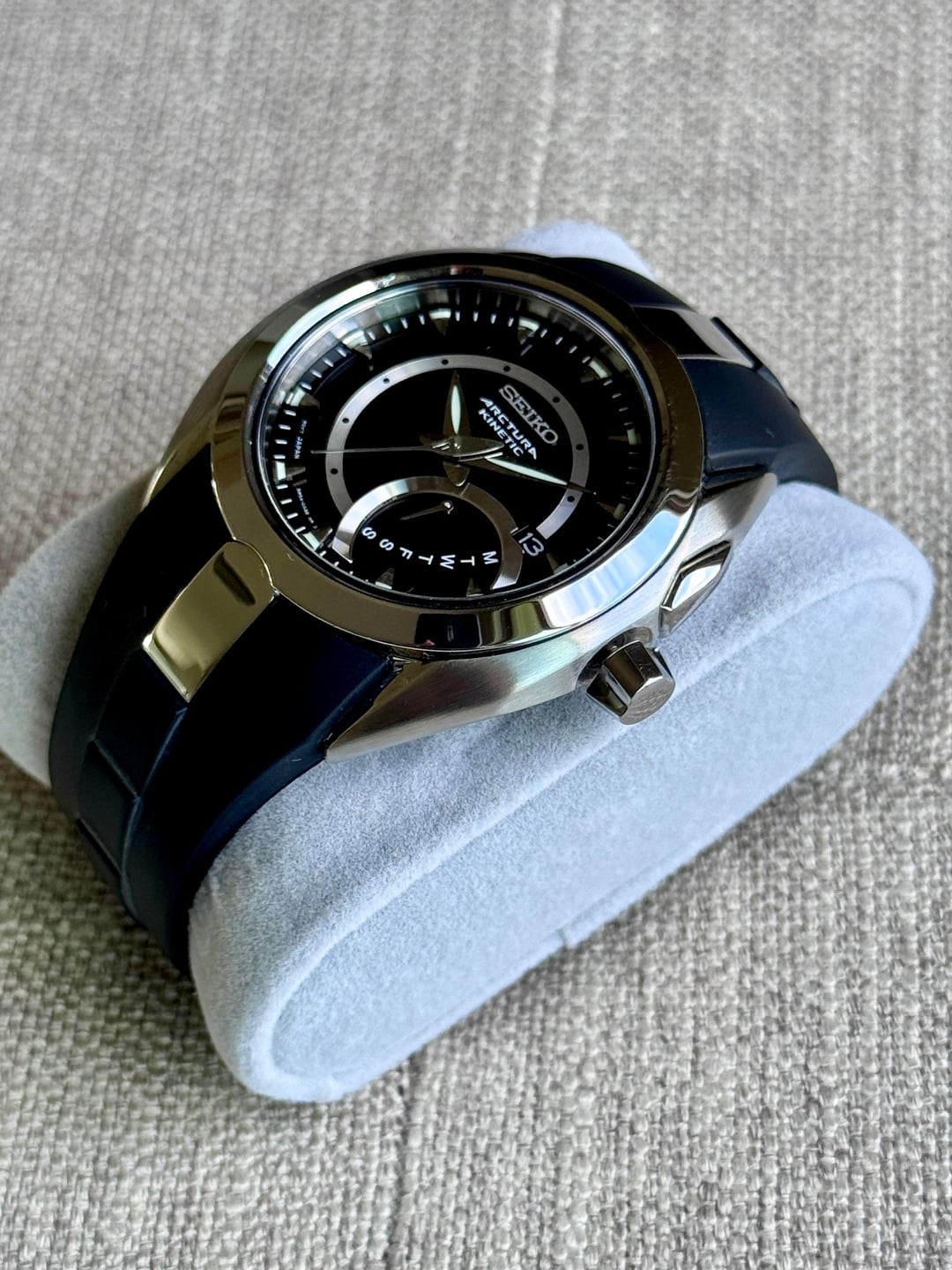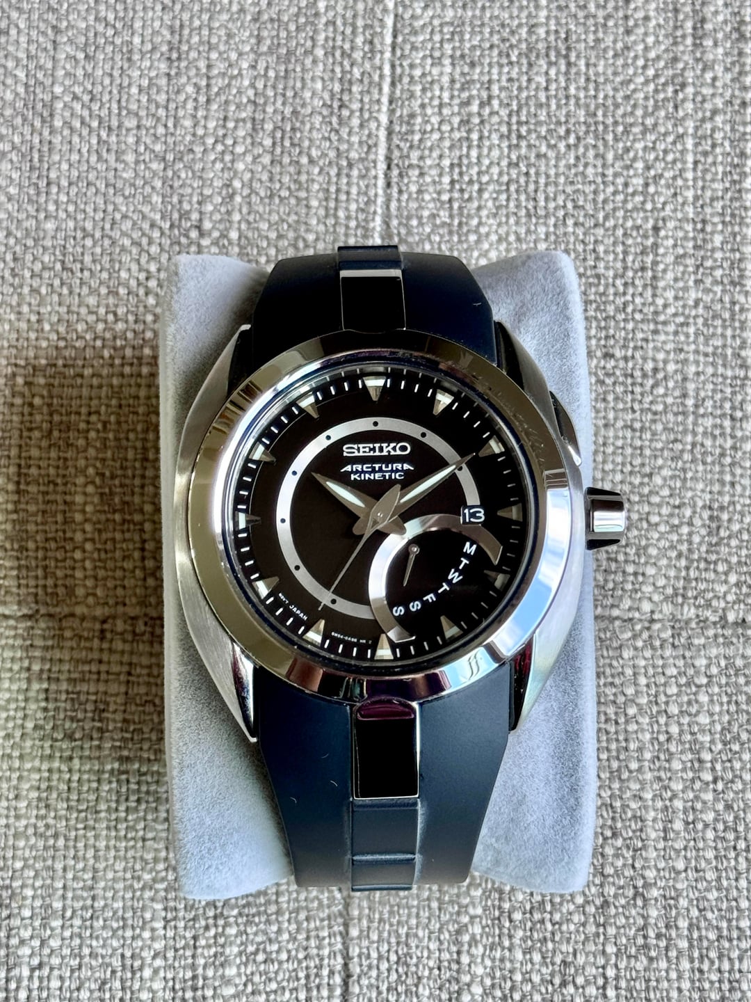 **Description**: This Seiko Arctura Kinetic Retrograde SRN013 (5M54-0AB0) is in excellent condition; please see the photos to verify. The OEM integrated rubber strap was fitted by a professional, Swiss-trained watchmaker (not me!). The power reserve on this Kinetic movement is insane; wearing the watch for less than one full day powers it for months. [Timestamp.](https://imgur.com/a/timestamp-u-wizard903-r-watchexchange-pfogl3z) Please excuse any light dust shown in the photos. **Price**: $200 shipped CONUS. Zelle/Venmo preferred, PayPal FF available for those with purchasing history. No trades at this time. Watches ship from California. **Miscellaneous**: I've sold many watches, including higher-end pieces, on Reddit with 100% positive feedback; please feel free to examine the details of my selling history. And feel free to send a chat with any questions! I currently have \~10 other watches for sale; please check my profile for details. All watches have been cleaned with a microfiber cloth and gentle solution.