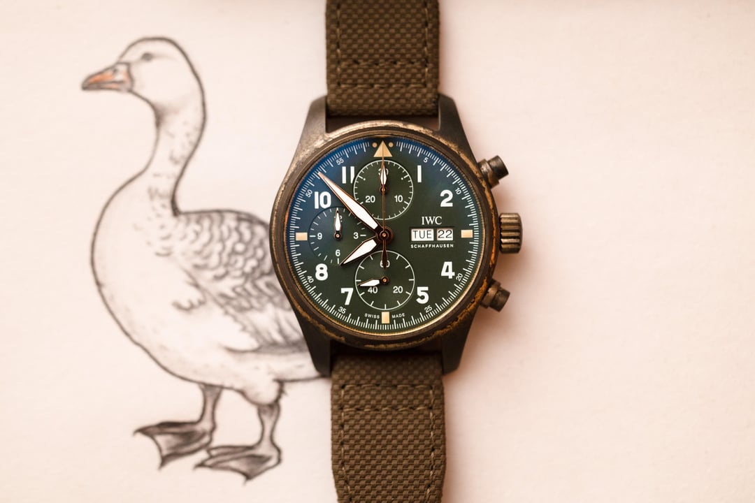 Hi Watchex, Here is an IWC Pilot’s Watch Chronograph Spitfire (IW387902), a standout piece in IWC’s aviation lineup featuring a 41 mm bronze case paired with a striking olive green dial and chronograph functionality powered by IWC’s in-house 69380 automatic movement. This watch gives you a reliable and well-finished automatic chronograph with a 46-hour power reserve, day/date display, and classic pilot watch legibility. The bronze case has developed a rich patina over time, which gives it a unique, antique-inspired look that really accentuates the green dial and strap. For those who prefer a fresh bronze finish, the patina can be easily cleaned off to restore the original shiny appearance, and I’m happy to do that for the buyer prior to shipping. The case measures about 41mm across and is comfortable on the wrist with a bold but not oversized presence. The condition is excellent with only very light signs of wear consistent with careful occasional use. The chronograph functions and timekeeping are running well, and it’s only a couple years old, so it still has several years of its extended warranty left for peace of mind. I’m including the extra OEM IWC strap it’s pictured on, along with its original brown leather strap. This comes as a full set, including original box, warranty card, manuals, and both straps. **Asking: $4,500,** shipped and insured. Photos: [https://imgur.com/a/euO8xa1](https://imgur.com/a/euO8xa1) Timestamp: [https://imgur.com/a/y87WkQc](https://imgur.com/a/y87WkQc) As always, thanks for looking and feel free to reach out with any questions!