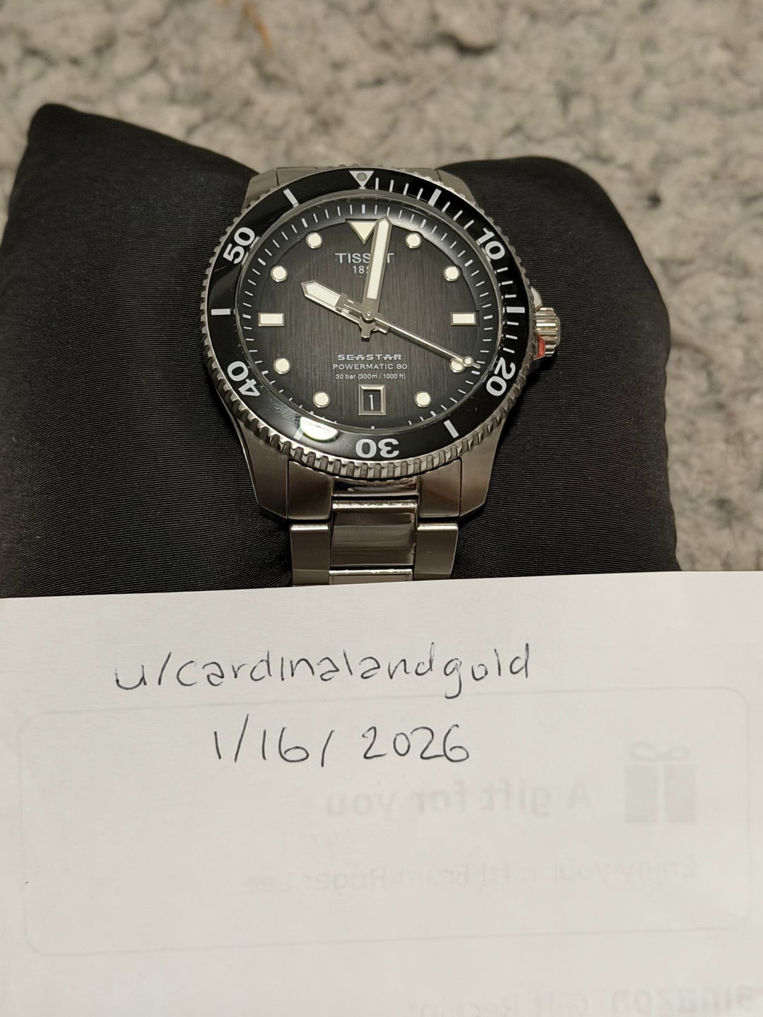Up for sale is my sporty and versatile Tissot Seastar 1000 Powermatic 80, reference T120.807.11.051.00, featuring a sleek 40mm stainless steel case and gorgeous textured grey dial. The watch also has an amazing 30 bar (300m/1000 ft) water resistance rating, so it can serve as your go anywhere, do anything watch. 🔥 Specs: * Model: Tissot Seastar 1000 Powermatic 80 * Reference: T120.807.11.051.00 * Case: 40mm stainless steel with rotating dive bezel and screw down crown * Dial: Texture grey with Super-Luminova * Movement: Powermatic 80 automatic movement with 80 hours power reserve * Crystal: Sapphire with anti-reflective coating * Bracelet: Brushed/polished stainless steel with quick release * Water Resistance: 300 meters 💬 Condition: The watch shows some signs of wear from normal daily use, as I’ve tried my best to show in the pictures. Watch is otherwise working great, with everything functioning as it should. 🎯 Why it's great: Perfect for those searching for a sporty daily watch with a reliable, work horse movement with robust water resistance. The textured grey dial is beautiful to look at and is very versatile. 💰 Price: Looking to get $425 OBO + shipping. I’m unlikely to consider a trade, but feel free to send me what you have. 📦 What’s Included: Watch only. Note that the watch is currently sized to a 6.5 inch wrist with only one additional link to spare. Please make sure your wrist will fit prior to purchase. 📬 Shipping and Payment Methods: Would prefer PayPal F&F (G&S only available for established members with many transactions and post history, with the buyer paying any fees). I’m also happy to take any additional pictures to show you the condition of the watch and do whatever you’d like to make you feel comfortable. I’ve also had many successful transactions on Watch Exchange and Photo Market, both as buyer and seller, all with great feedback, so you can deal with confidence!