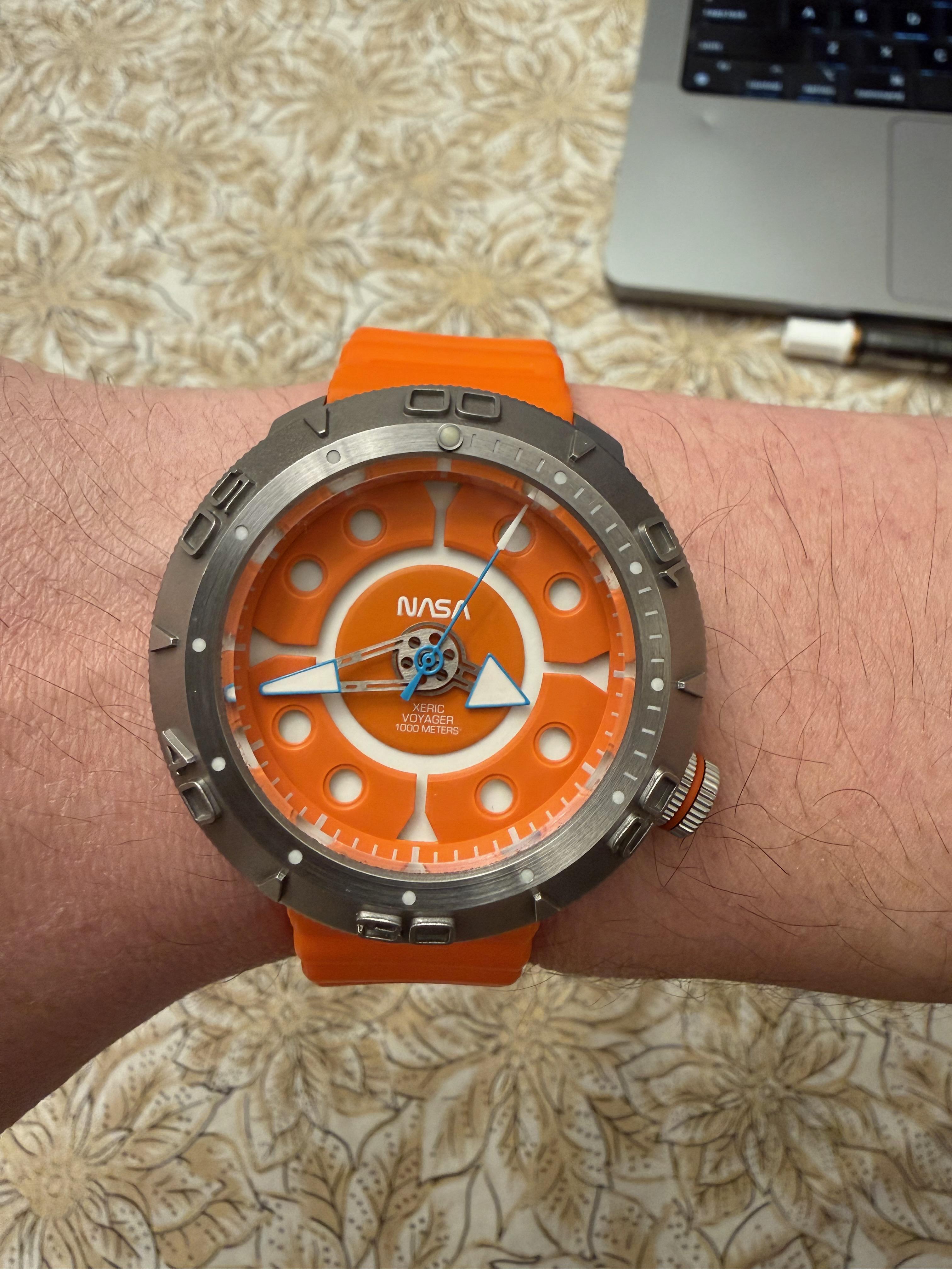 Up for sale is a Xeric Voyager NASA watch in orange, in excellent condition. This is a super-deep dive watch (1000m) with a helium escape valve. Movement is a Seiko NH38, it has crazy lume, and it's generally just a beast. On a very nice rubber strap. This thing is in excellent condition and I'm only selling it because I've worn it so rarely. Unfortunately I don't have any box, but I can share the confirmation email from me buying it from Xeric during the Kickstarter to any putative buyer. Price is $250 USD shipped, half of what they're selling them for. CONUS only please. I take payment through Paypal F&F (preferred) or Venmo. Album of lots of angles and timestamp (first image): [https://imgur.com/a/kWcgDha](https://imgur.com/a/kWcgDha) Thanks for considering!