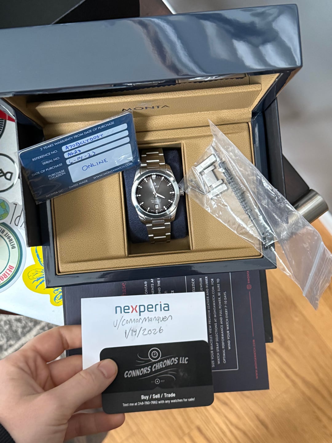 Hey Watch Exchange, Up for sale is a wonderful Monta Noble, purchased in june of 2023. It’s in excellent condition, with minor desk rash on the bracelet. It keeps wonderful time and wears comfortably with the super nice clasp. Super unique and versatile dial, amazing piece. 38mm diameter, 9.7mm thin, 47mm lug to lug. Sale comes with everything pictured in timestamp including all links. Double box, links, watch, card etc. Price: $995 shipped to the CONUS. Zelle or wire preferably, but can also take paypal f&f for buyers with strong transaction history on the sub. This is one of the cheapest prices i’ve seen for this dial, so scoop it up while you can. Any questions, please let me know. Thanks for looking.