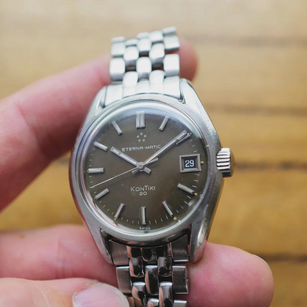 Vintage Eterna watches, in particular the Kontiki 20 consistently offer exceptional value, often outperforming their price point. Brand: Eterna Model: KonTiki Movement: Eterna self winding Reference: 130FTT Case: Stainless steel Size: 37mm Lug to lug: 44mm Strap: Eterna Kontiki signed Gay Frères manufactured, stainless steel, beads-of-rice style bracelet with KH endlinks Box/papers: No Location: Los Angeles Price: ONLY $1,250! PICTURES/TIMESTAMP: [https://imgur.com/a/4cUEfrs](https://imgur.com/a/4cUEfrs) CONDITION & SERVICING \-The beautiful light chocolate colored dial is in very good condition. \-The minute hand is missing lume. \-The case has been lightly polished and is in good condition. \-Service history is unknown.