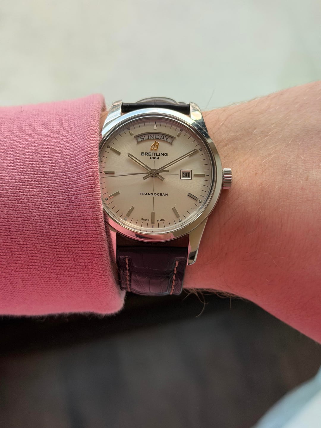 Breitling Transocean Day Date A45310. 43mm. Watch only. AM strap/Original buckle. **$2499** / Zelle, Venmo, or WU accepted. Timestamp: https://imgur.com/a/1sZ5JPt I have tons of references on multiple platforms including WatchExchange. I am more than happy to show these.
