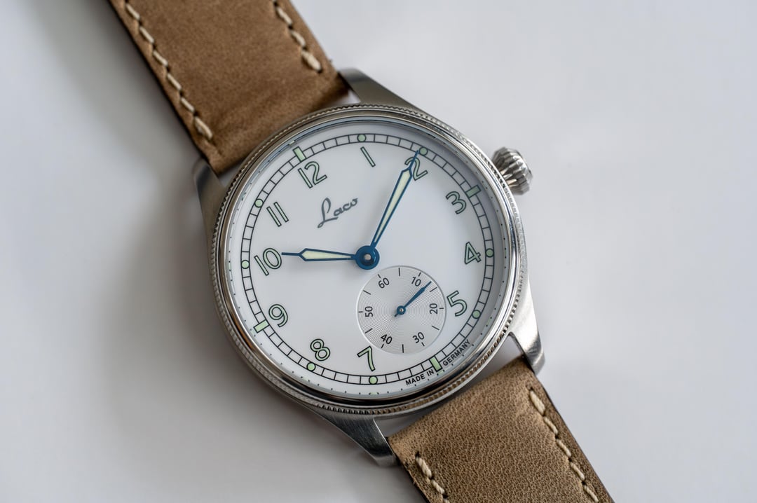 Up for sale today is my Laco Cuxhaven 39mm with an enamel like dial. This watch has a very nice white dial is remarkably close to enamel. The induces are lumed and have a very pleasing lime color. It has real tempered blue hands (all three) and center hand stack is capped. The movement is manual wound Sellita SW 260-1 and it's very well decorated with blued screws and nice brushing on the wheels. Watch is in excellent condition except a single scratch on the case back which can be seen in the pictures. It comes with an unused original strap. I purchased this in Sep' 2024 and warranty is valid until Sep' 2026. Warranty card and all accessories are included. No trades please More info: [https://www.laco-watches.com/en/watches/navy-watches/cuxhaven-39](https://www.laco-watches.com/en/watches/navy-watches/cuxhaven-39) Timestamp and Album: [https://imgur.com/a/3CUIItq](https://imgur.com/a/3CUIItq) Price: 1100 including shipping within the US Payment: Paypal (Buyer pays the fee) Shipping: USPS/UPS/FEDEX within CONUS I am open to FaceTime calls to show the watch