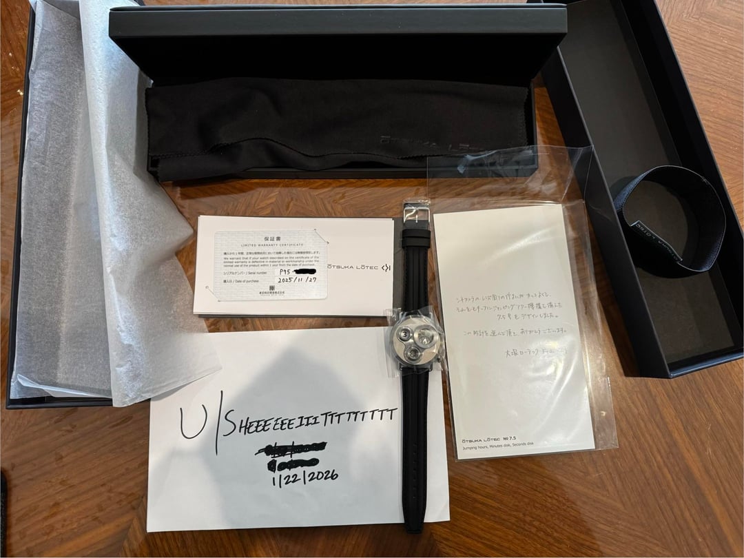 Hey All, This watch needs no introduction. From the brilliant mind of Jiro Katayama, the ŌTSUKA LŌTEC № 7.5, featuring a fantastically unique layout, with a fish-eye camera lens style jump hour and separate minutes and seconds. Made of steel and running perfectly. Comes with all original items: box, papers, warranty card. This is sadly a catch and release for me. Absolutely love the dial, layout and mesmerizing jump-hour feature, but just doesn’t sit right on my wrist so I’ve got to let it go. It is in perfect unworn, brand new condition. [Video](https://imgur.com/a/rh6usWj) **$6,500** via Zelle. No trades, please. Will ship CONUS - FedEx. Happy to do a video chat so you can see everything and I can answer your questions live. Have lots of positive feedback on this sub and eBay. Not a dealer, just a collector. All sales final unless watch does not arrive, or arrives in condition not represented in this post. Edit: added video link/formatting