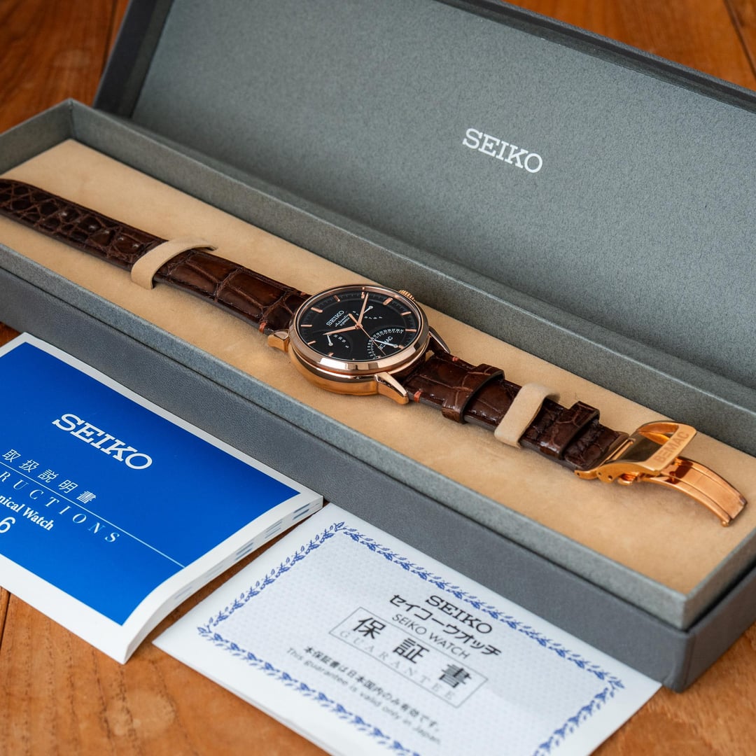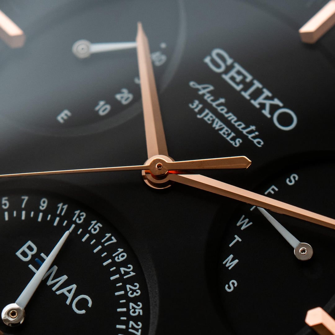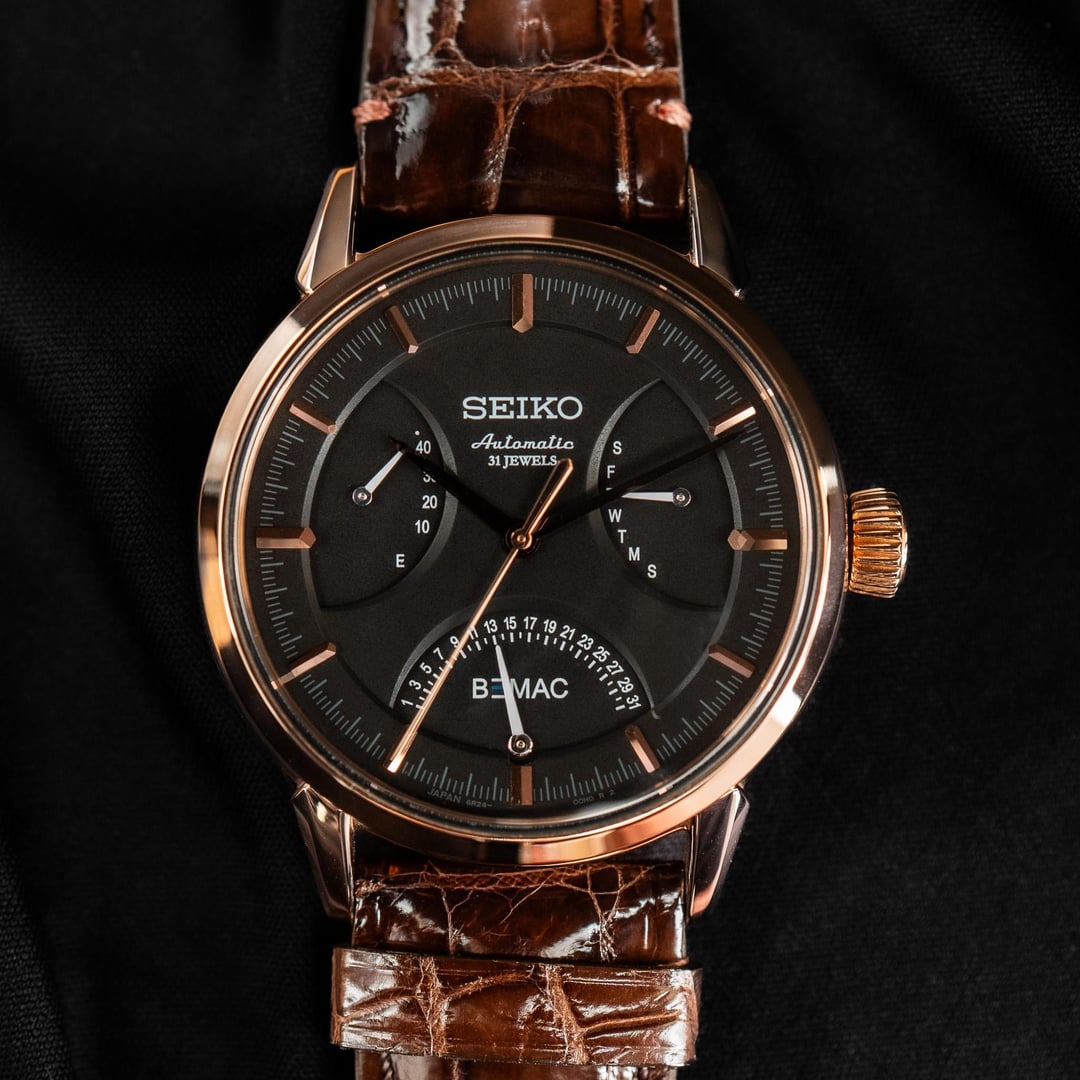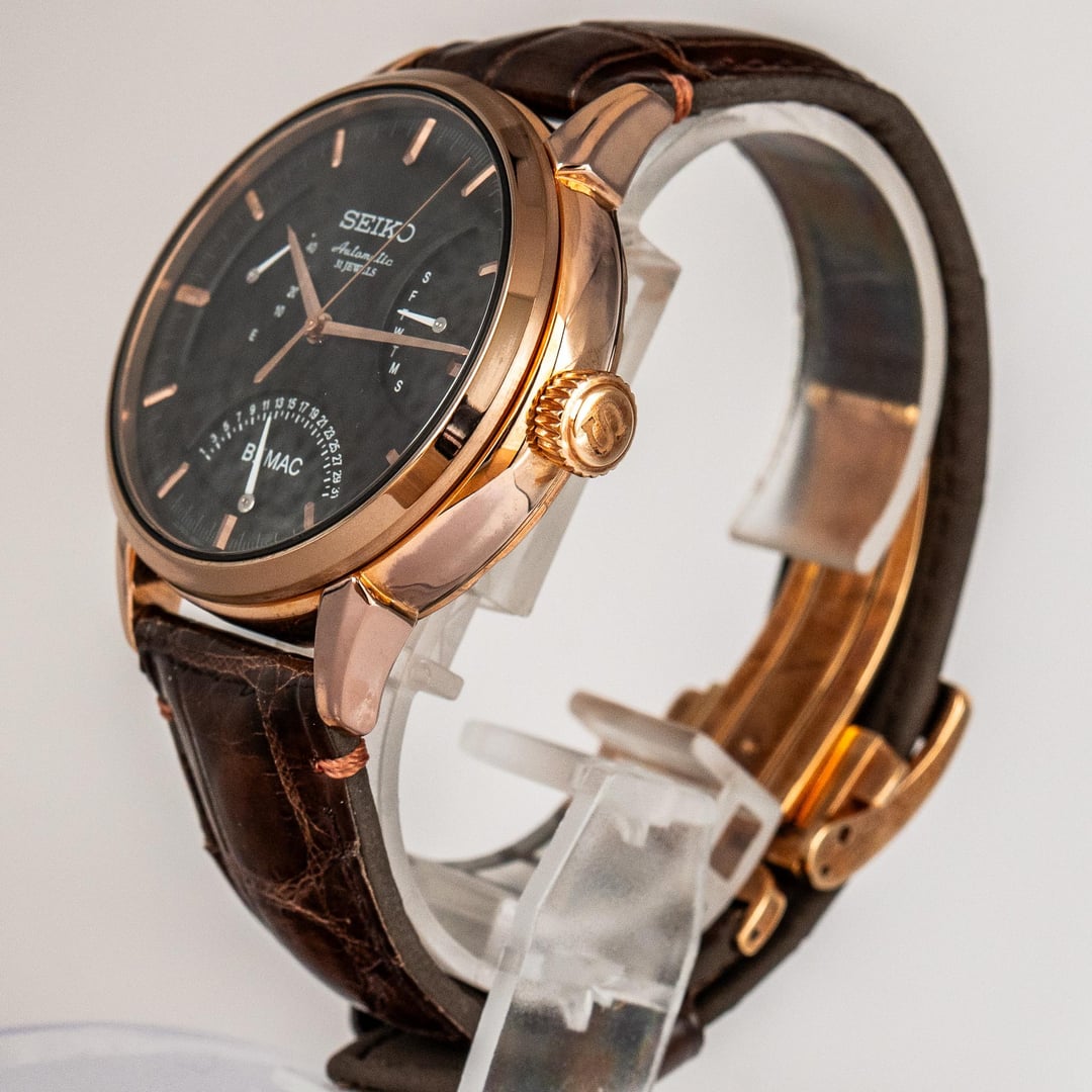 # Reference: **Model:** SZSD001 “BEMAC Anniversary” Double Retrograde **Production Date:** 2016 **Timestamp:** [https://imgur.com/a/uXjJYAM](https://imgur.com/a/uXjJYAM) **Album:** [https://imgur.com/a/oN2QPRq](https://imgur.com/a/oN2QPRq) # Features: **The Occasion.** This rare watch was commissioned by BEMAC, a Japanese electronics company, to celebrate their 70th anniversary in 2016. During the celebrations, BEMAC gifted these watches to select employees as a token of appreciation for their hard work. There are actually two BEMAC designs - the Retrograde and the Whirlpool - but neither watch was made available to the public, so official details are scarce. **The Rarity.** Judging by how infrequently either has appeared for sale in Japan, I suspect the Retrograde BEMAC is the rarer of the two - perhaps reserved for senior company figures? That’s not to say either version is common. I’ve seen just four examples of the Whirlpool for sale, and only one of the Retrograde**.** **The Complication.** To add weight to my theory, normal Seikos powered by the three-handed 6R15 movement are typically much more affordable than those powered by the six-handed 6R24 movement. So the SZSD001, fitted with the latter, was likely intended as the more prestigious gift. **The Design.** There’s no whirlpool on this dial, but the colourway alone makes it special. Black with rose gold accents - one of Seiko’s least used and most elegant combinations. It definitely stands out from the crowd, and feels exactly like something middle-upper management at a Japanese electronics company might wear... because that's exactly what it is! # Details: **Condition:** In great condition. No marks of any significance. Original cow leather strap and BEMAC signed buckle. **Scope**: Full box and papers **Movement**: 6R15 Automatic **Dimensions:** \- Case width: 40.5mm \- Case Thickness: 11.5mm \- Lug width: 20.0mm **Price:** Priced at **$1540 + shipping**. Various payment methods accepted. Not accepting trades. Transaction Fees paid by the buyer. **Of note:** Nothing to report.