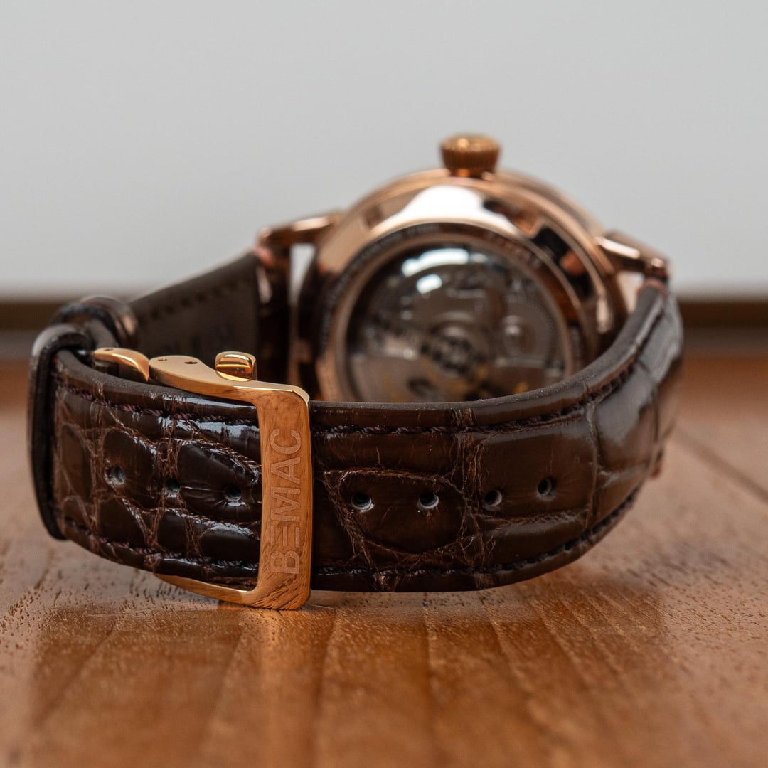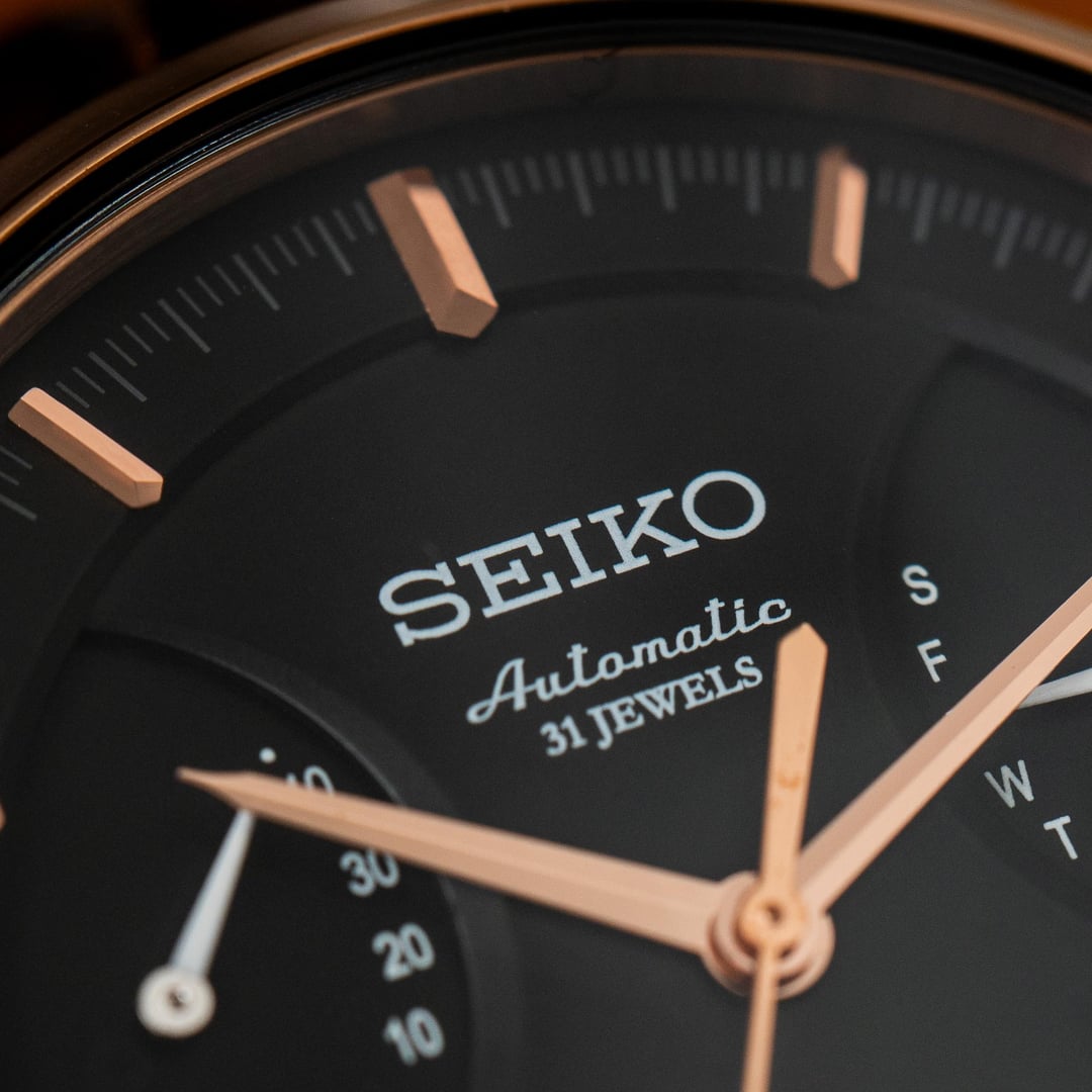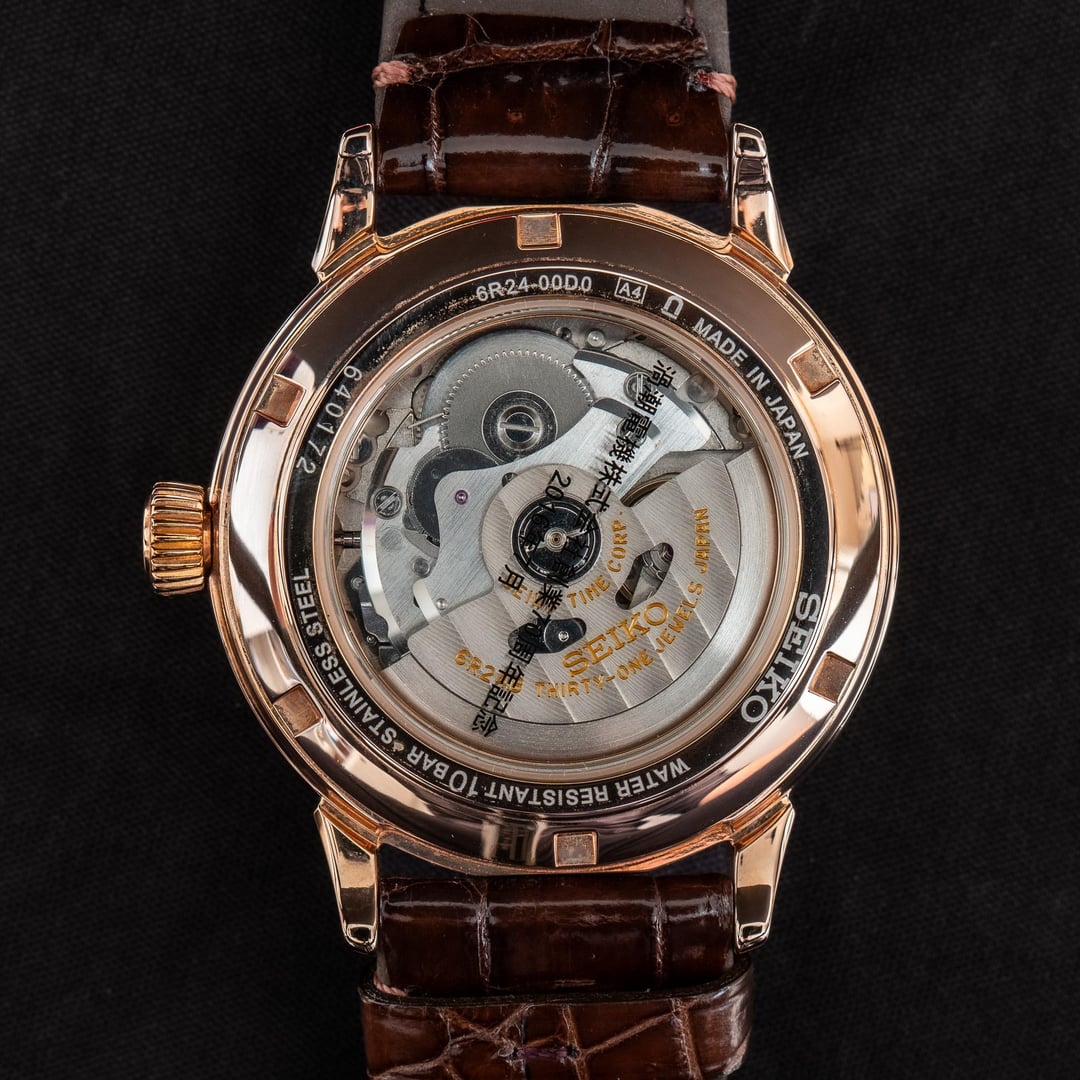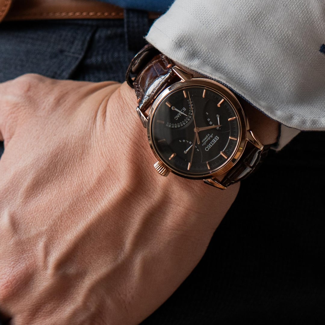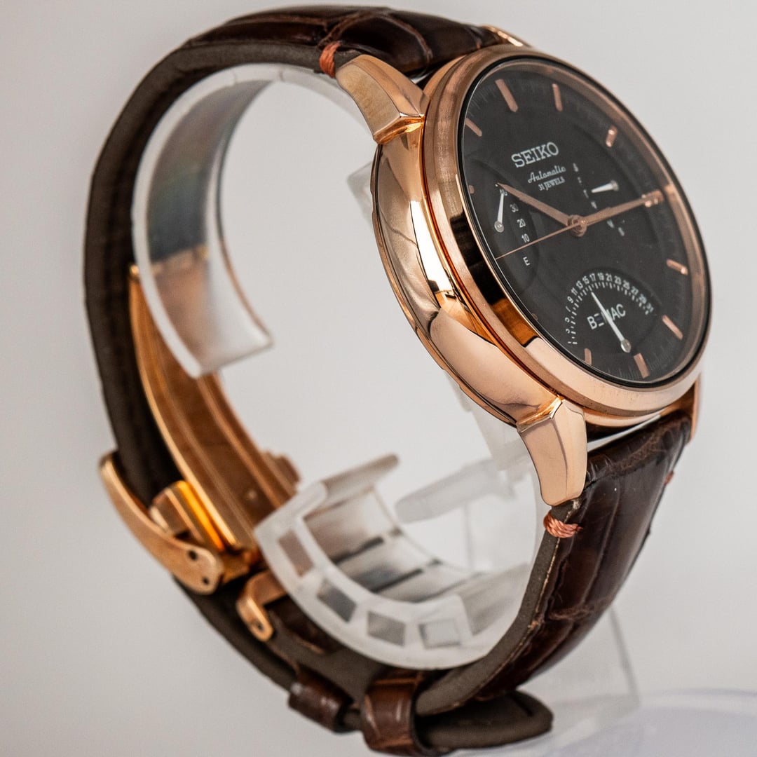 # Reference: **Model:** SZSD001 “BEMAC Anniversary” Double Retrograde **Production Date:** 2016 **Timestamp:** [https://imgur.com/a/uXjJYAM](https://imgur.com/a/uXjJYAM) **Album:** [https://imgur.com/a/oN2QPRq](https://imgur.com/a/oN2QPRq) # Features: **The Occasion.** This rare watch was commissioned by BEMAC, a Japanese electronics company, to celebrate their 70th anniversary in 2016. During the celebrations, BEMAC gifted these watches to select employees as a token of appreciation for their hard work. There are actually two BEMAC designs - the Retrograde and the Whirlpool - but neither watch was made available to the public, so official details are scarce. **The Rarity.** Judging by how infrequently either has appeared for sale in Japan, I suspect the Retrograde BEMAC is the rarer of the two - perhaps reserved for senior company figures? That’s not to say either version is common. I’ve seen just four examples of the Whirlpool for sale, and only one of the Retrograde**.** **The Complication.** To add weight to my theory, normal Seikos powered by the three-handed 6R15 movement are typically much more affordable than those powered by the six-handed 6R24 movement. So the SZSD001, fitted with the latter, was likely intended as the more prestigious gift. **The Design.** There’s no whirlpool on this dial, but the colourway alone makes it special. Black with rose gold accents - one of Seiko’s least used and most elegant combinations. It definitely stands out from the crowd, and feels exactly like something middle-upper management at a Japanese electronics company might wear... because that's exactly what it is! # Details: **Condition:** In great condition. No marks of any significance. Original cow leather strap and BEMAC signed buckle. **Scope**: Full box and papers **Movement**: 6R15 Automatic **Dimensions:** \- Case width: 40.5mm \- Case Thickness: 11.5mm \- Lug width: 20.0mm **Price:** Priced at **$1540 + shipping**. Various payment methods accepted. Not accepting trades. Transaction Fees paid by the buyer. **Of note:** Nothing to report.