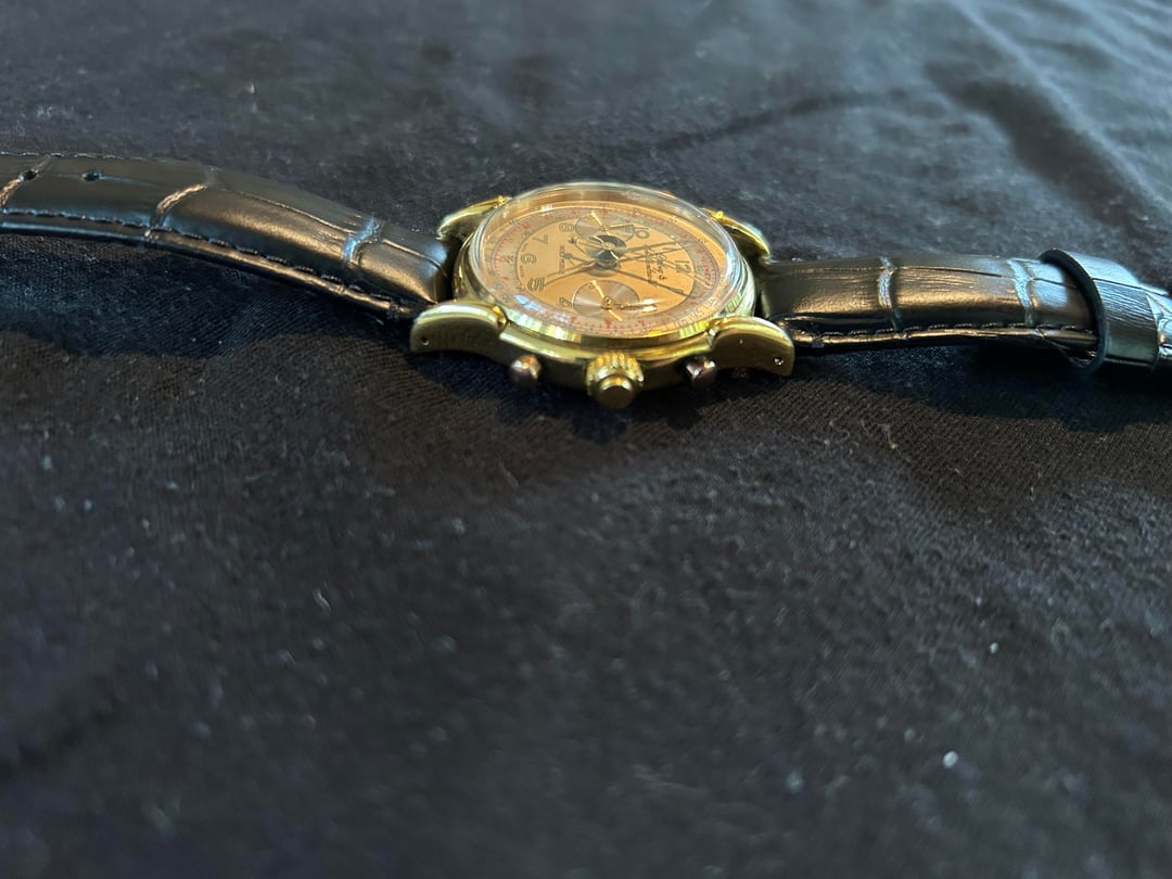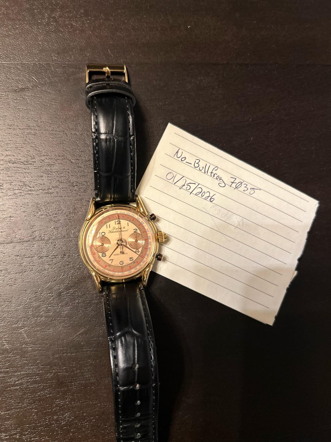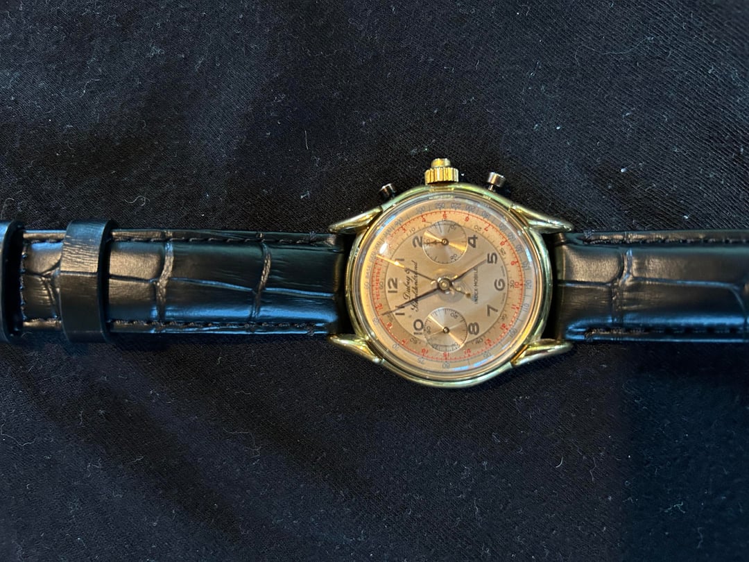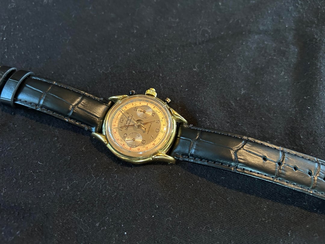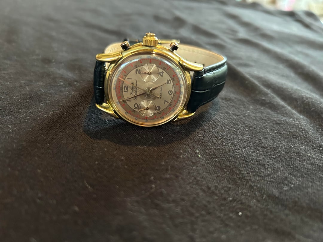 PayPal G&S, Venmo agreeable payments Watch Details • Brand: Dubey & Schaldenbrand • Model: Index Mobile • Movement: Landeron 54 mechanical chronograph (split-seconds) • Functions: Rattrapante / Split Second Chronograph • Case Material: Gold plated • Case Size: ~37mm case-to-case (without crown) • Lug Width: 19mm • Dial: Champagne dial with telemeter scale and twin subdials • Crystal: Acrylic (appears clean) • Strap: Aftermarket black leather strap with aftermarket buckle (black alligator) ⸻ Condition Vintage piece in very attractive cosmetic condition for its age. Case shows light wear consistent with vintage gold plate. Dial is clean with great patina and crisp printing. Chronograph pushers and crown present and functioning (see notes below). Aftermarket strap in excellent condition. Mechanical Notes: • Winds and sets smoothly • Chronograph starts/stops/resets • Split-seconds function engages (buyer encouraged to service for long-term use given age) FWIW: Dubey & Schaldenbrand split-second chronographs are uncommon and collectible, especially with the Landeron 54 rattrapante movement. Classic mid-century chronograph design with telemeter scale and champagne dial—great dressy vintage chrono that wears beautifully at 37mm.