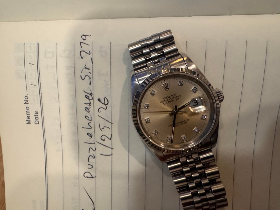 Rolex Datejust ref. 16234, featuring a factory diamond-set silver dial that has developed a beautiful, subtle patina over time. In changing light, the dial takes on warm tones that give it depth and character—something photos only partially capture. Paired with the iconic 18k white gold fluted bezel, this example blends classic Rolex elegance with just the right amount of vintage charm. ⸻ 💰 Price $5,750 + shipping ⸻ 📦 What’s Included • Rolex Datejust 36mm ref. 16234 • Jubilee bracelet • Watch only (no box or papers) ⸻ 📝 Condition Very good vintage condition • Dial: Factory diamond-set silver dial with attractive patina • Bezel: White gold fluted bezel in excellent shape • Crystal: Clean with no scratches • Case: Light handling marks consistent with age • Bracelet: Presents well for its age • Movement: Running strong ⸻ 🕰 Watch Details • Reference: 16234 • Case size: 36mm • Bezel: 18k white gold fluted • Dial: Factory diamond-set silver • Movement: Automatic Rolex caliber ⸻ 📍 Location & Shipping • Located in the U.S. • Fully insured shipping available • Signature required • Local meetups welcome ⸻ 💳 Payment Accepted • Bank wire • Zelle • Venmo • Cash (local meetups) ⸻ 🧾 About Me (Casetowrist) I’ve been buying, selling, and trading watches for 10+ years, focusing on transparency, accurate condition descriptions, and smooth transactions. Authentication at a local watchmaker is always welcome (buyer covers fee). Instagram: @casetowrist Website: Casetowrist.com