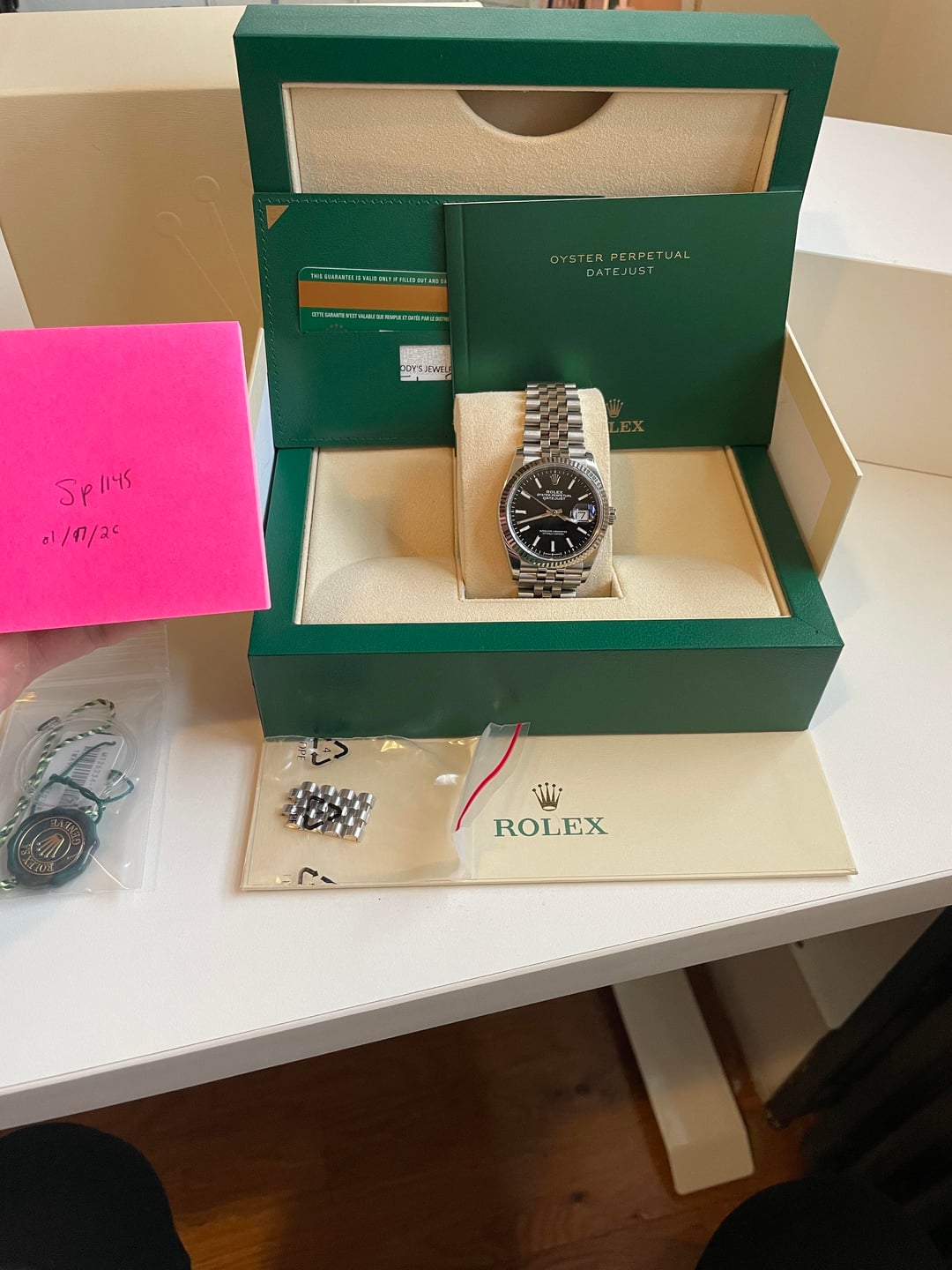 Looking to sell my 2019 Rolex Datejust for $8.5K to put toward my next watch. Full set. Solid condition. Clasp on the bracelet shows wear from a few years in rotation. Purchased from a reputable gray market dealer (email receipt and correspondence, provided upon request) in Dec 2022. Strong preference toward in person deal in NYC. Offers that are local will be strongly favored. No trades. Thanks for looking. Send me a message and we can chat / FaceTime.