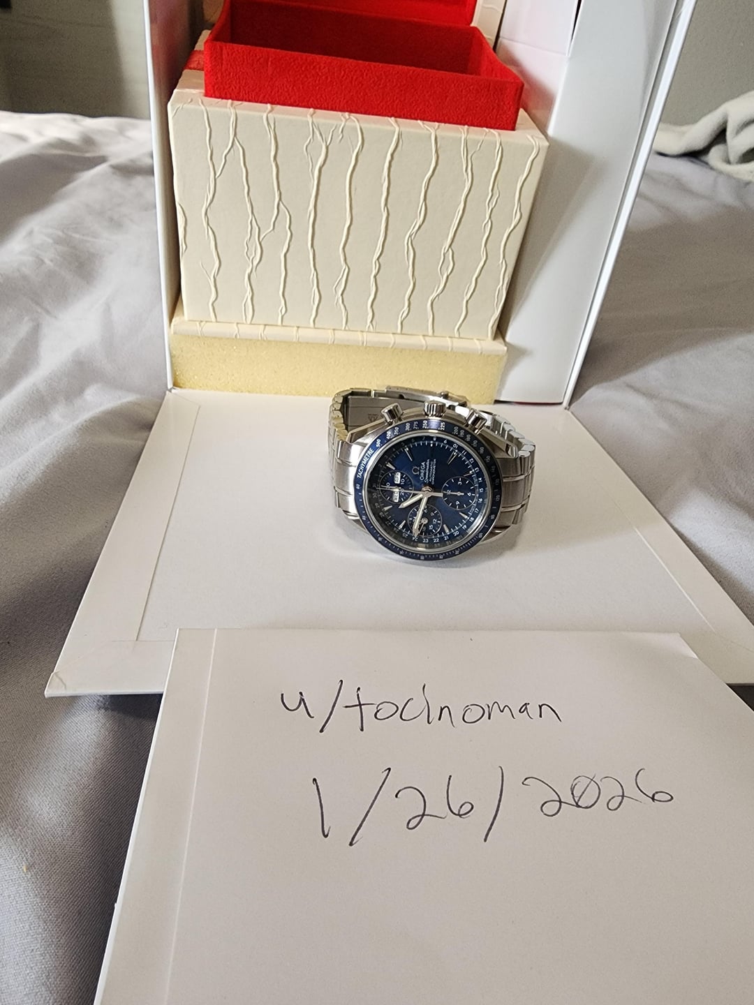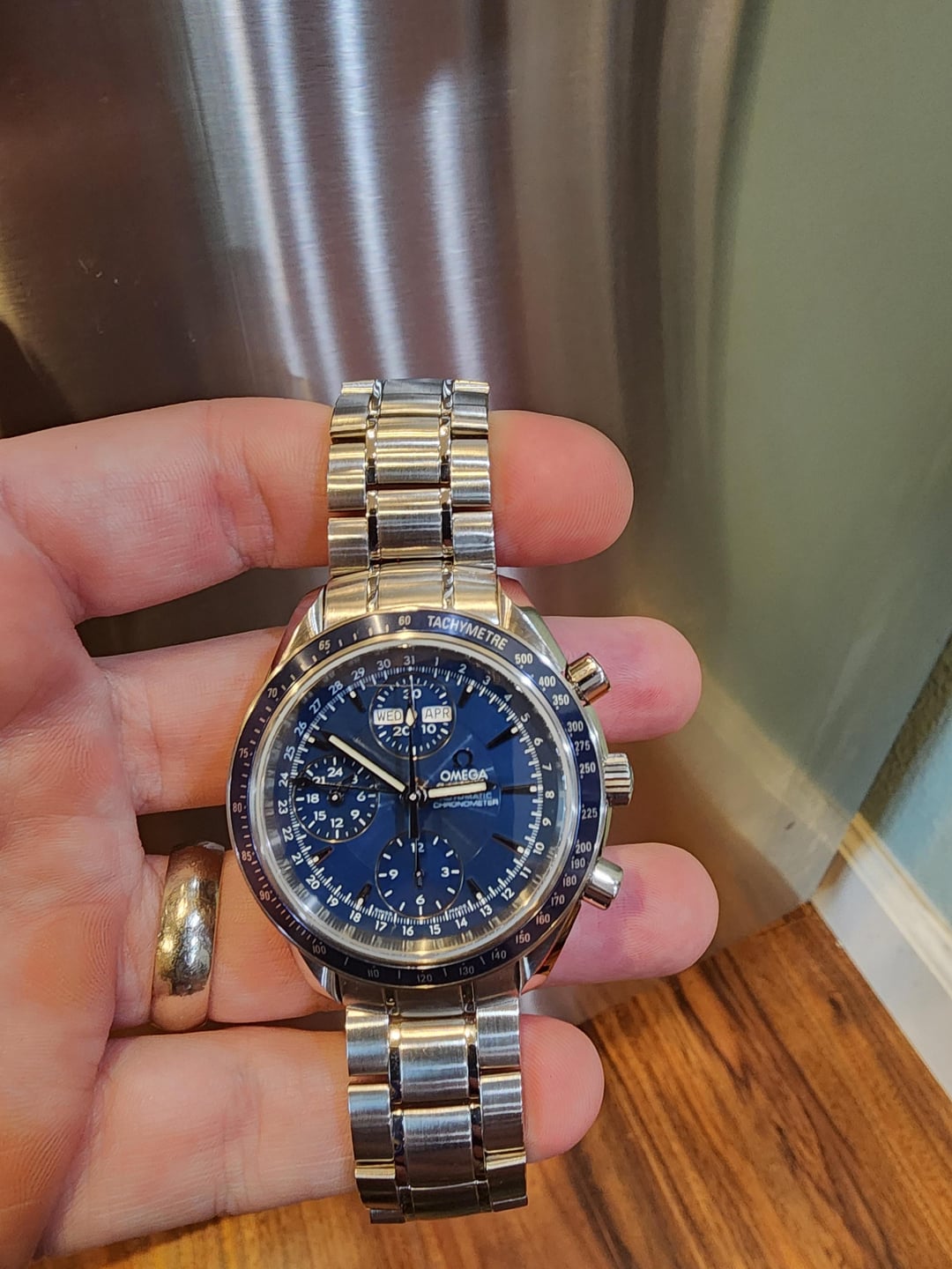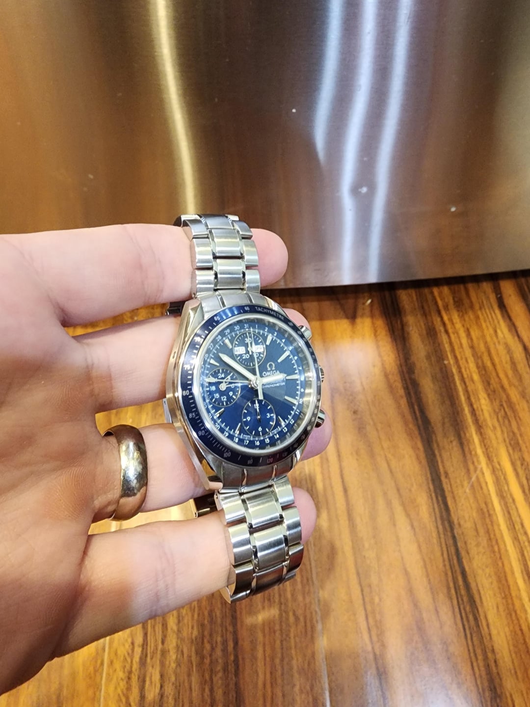 I'm a first-time seller with one purchase under my belt and trying my hand with a couple of watches for sale, so if there is something off about my listing, please provide some constructive feedback so I can adjust it and future listings. Reposting this piece with a price drop! This is a stunning example of the Omega Speedmaster Day-Date ref 3222.80.00 in like new condition. This is the reduced model featuring day, date, month, chronograph, and 24-hour indicators with a vibrant blue dial and stainless steel bracelet, with full links attached. Original box, serialized warranty card, and operating manual are also included. Crystal, dial, bezel, case, and bracelet are all impeccably clean with no chips, dings, cracks, or scratches. Ships from San Diego, CA. Local pickup is available. Price: negotiable $3,350 USD, fully insured shipping within CONUS included. I can accept PayPal F&F, G&S (buyer pays fee), Zelle, or Venmo. OCONUS shipping will add label cost, buyer pays any applicable tariffs/duties/import costs. Happy to video call and provide any requested additional pictures and information. DM me with questions!