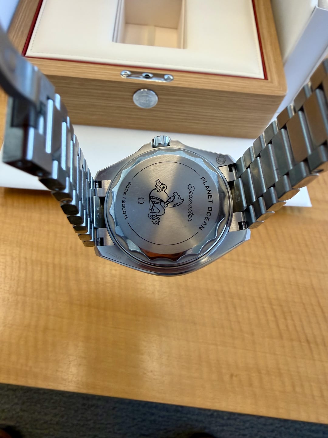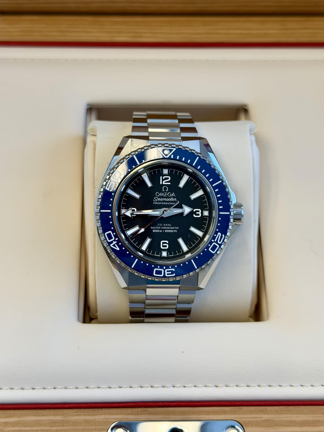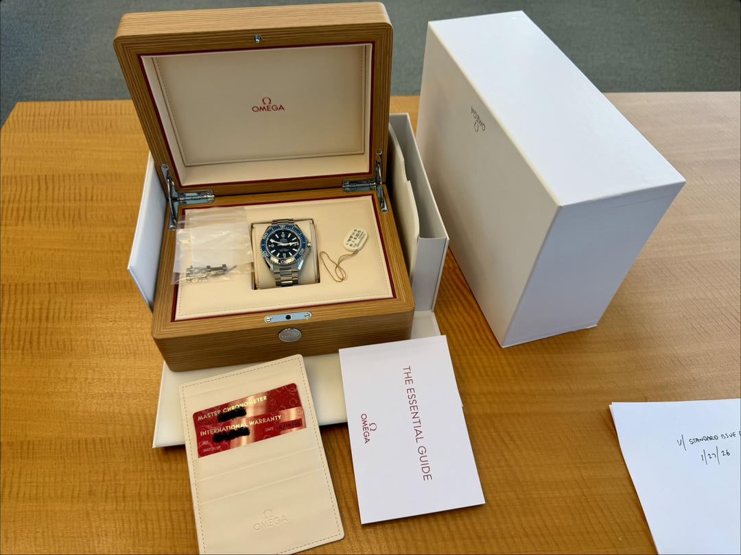New generation Omega Seamaster Planet Ocean. Blue ceramic bezel and metal bracelet – Model Reference 217.30.42.21.01.002 Bought new by me on December 10, 2025. Warranty card dated that same day. **Asking $7,600.** Paypal F&F or Venmo. Will ship fully insured via FedEx, to be held at your nearest FexEx location for you to pick it up. Includes everything you get when the watch is new. Box, papers, warranty cards, hang tag, extra links, etc. Watch is currently sized for a 7.1-inch (18 cm) wrist. Also includes original receipt and an insurance appraisal from the AD setting the replacement value at $9,200. Has been worn. There are a few very minor marks on the clasp and a few of the links (seen in the photos). These could easily be polished out. There are no marks whatsoever on the watch body itself. The watch body, bezel, crystal, and watch back are as new. The bracelet has never been removed so there are no tool marks on the lugs. Imgur link to photo album: [https://imgur.com/a/6x6d2FK](https://imgur.com/a/6x6d2FK) Timestamp: [https://i.imgur.com/ZUuiOKQ.jpeg](https://i.imgur.com/ZUuiOKQ.jpeg) I am located in Kansas City. DM me and we can set up a zoom call to discuss, or whatever makes you feel comfortable. I am not a watch dealer but have bought and sold watches on watchexchange before. Here are some of my prior sales: * Seiko Willard: [https://www.reddit.com/r/Watchexchange/comments/1o5o8zt/wts\_seiko\_spb151\_willard\_reissue\_with\_rubber/](https://www.reddit.com/r/Watchexchange/comments/1o5o8zt/wts_seiko_spb151_willard_reissue_with_rubber/) * Omega 300m “Seaweed”: [https://www.reddit.com/r/Watchexchange/comments/1i3jlyp/wts\_omega\_seamaster\_300m\_seaweed\_includes\_omega/](https://www.reddit.com/r/Watchexchange/comments/1i3jlyp/wts_omega_seamaster_300m_seaweed_includes_omega/) * Omega 300 165.024: [https://www.reddit.com/r/Watchexchange/comments/1i3ina3/wts\_omega\_seamaster\_300\_165024\_nodate\_watchco/](https://www.reddit.com/r/Watchexchange/comments/1i3ina3/wts_omega_seamaster_300_165024_nodate_watchco/) * Tudor Pelagos FXD MN: [https://www.reddit.com/r/Watchexchange/comments/1gm64cf/wts\_tudor\_pelagos\_fxd\_marine\_nationale\_22\_box/](https://www.reddit.com/r/Watchexchange/comments/1gm64cf/wts_tudor_pelagos_fxd_marine_nationale_22_box/)