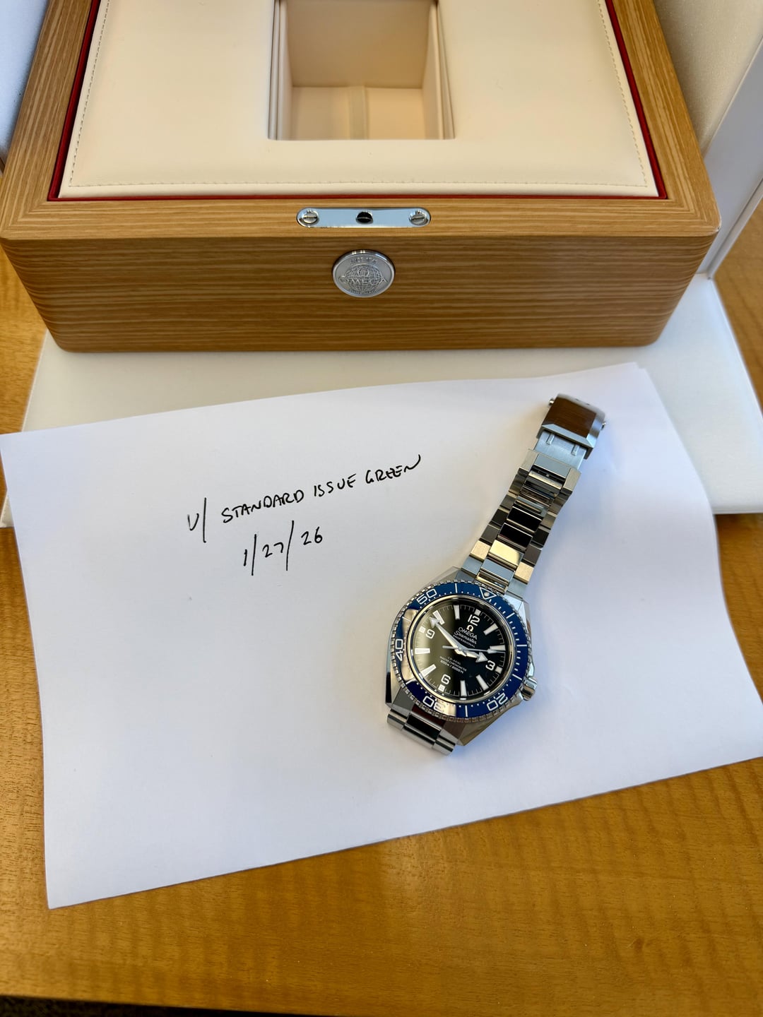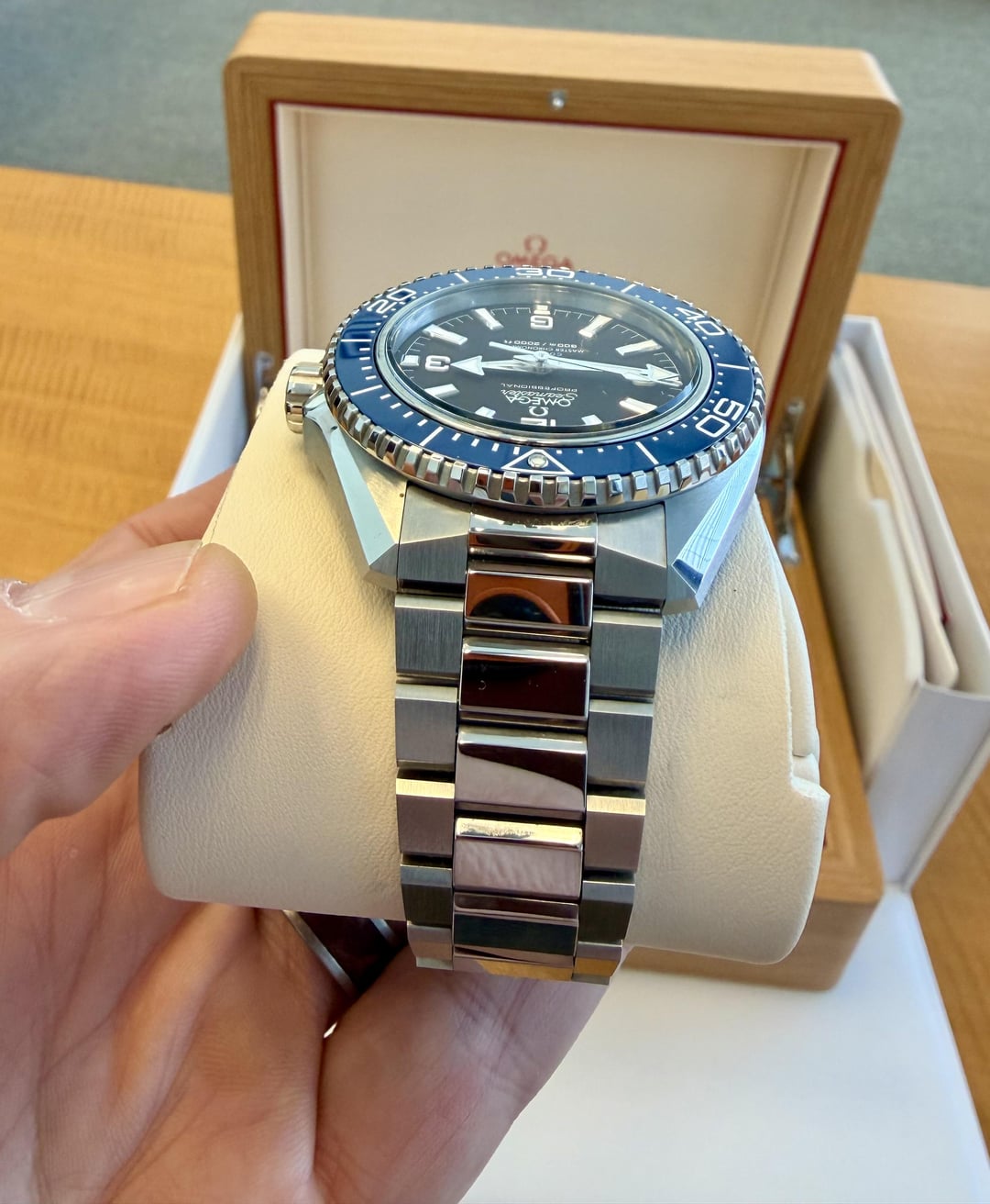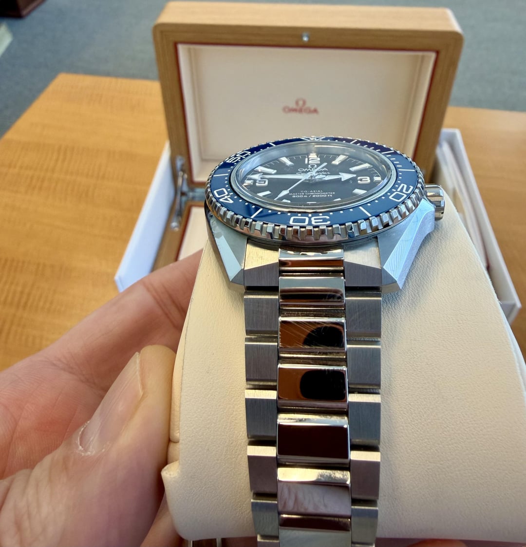 New generation Omega Seamaster Planet Ocean. Blue ceramic bezel and metal bracelet – Model Reference 217.30.42.21.01.002 Bought new by me on December 10, 2025. Warranty card dated that same day. **Asking $7,600.** Paypal F&F or Venmo. Will ship fully insured via FedEx, to be held at your nearest FexEx location for you to pick it up. Includes everything you get when the watch is new. Box, papers, warranty cards, hang tag, extra links, etc. Watch is currently sized for a 7.1-inch (18 cm) wrist. Also includes original receipt and an insurance appraisal from the AD setting the replacement value at $9,200. Has been worn. There are a few very minor marks on the clasp and a few of the links (seen in the photos). These could easily be polished out. There are no marks whatsoever on the watch body itself. The watch body, bezel, crystal, and watch back are as new. The bracelet has never been removed so there are no tool marks on the lugs. Imgur link to photo album: [https://imgur.com/a/6x6d2FK](https://imgur.com/a/6x6d2FK) Timestamp: [https://i.imgur.com/ZUuiOKQ.jpeg](https://i.imgur.com/ZUuiOKQ.jpeg) I am located in Kansas City. DM me and we can set up a zoom call to discuss, or whatever makes you feel comfortable. I am not a watch dealer but have bought and sold watches on watchexchange before. Here are some of my prior sales: * Seiko Willard: [https://www.reddit.com/r/Watchexchange/comments/1o5o8zt/wts\_seiko\_spb151\_willard\_reissue\_with\_rubber/](https://www.reddit.com/r/Watchexchange/comments/1o5o8zt/wts_seiko_spb151_willard_reissue_with_rubber/) * Omega 300m “Seaweed”: [https://www.reddit.com/r/Watchexchange/comments/1i3jlyp/wts\_omega\_seamaster\_300m\_seaweed\_includes\_omega/](https://www.reddit.com/r/Watchexchange/comments/1i3jlyp/wts_omega_seamaster_300m_seaweed_includes_omega/) * Omega 300 165.024: [https://www.reddit.com/r/Watchexchange/comments/1i3ina3/wts\_omega\_seamaster\_300\_165024\_nodate\_watchco/](https://www.reddit.com/r/Watchexchange/comments/1i3ina3/wts_omega_seamaster_300_165024_nodate_watchco/) * Tudor Pelagos FXD MN: [https://www.reddit.com/r/Watchexchange/comments/1gm64cf/wts\_tudor\_pelagos\_fxd\_marine\_nationale\_22\_box/](https://www.reddit.com/r/Watchexchange/comments/1gm64cf/wts_tudor_pelagos_fxd_marine_nationale_22_box/)