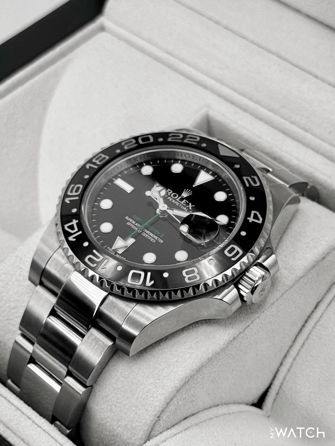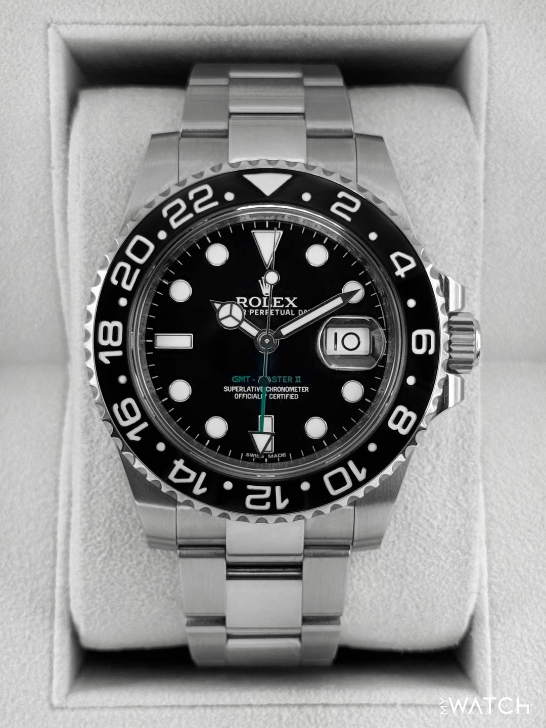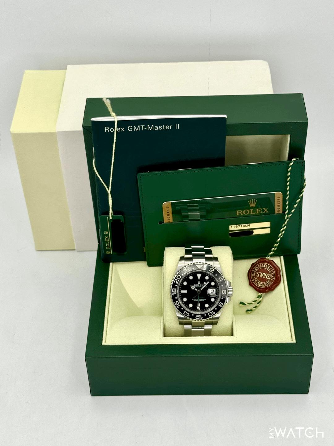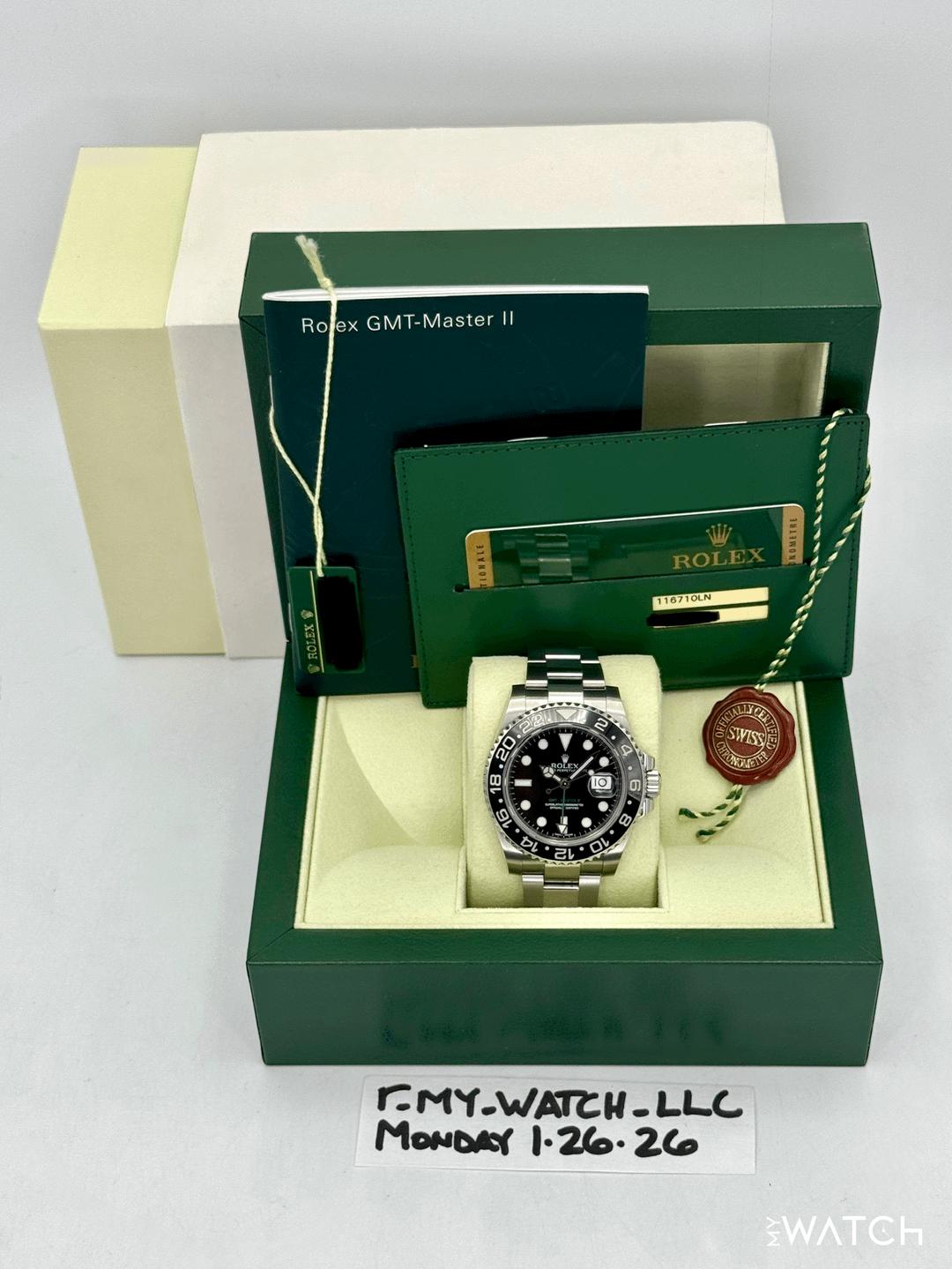 🔵**2014 Rolex GMT-Master II 40mm 116710LN Stainless Steel Oyster Bracelet Black Dial** 🔵**TRADE or SELL us your luxury watch, all brands considered. Message me details.** **Includes the following:** **✔️Original Rolex Double Boxed** **✔️Box and Papers - Yes** **✔️Warranty card dated 2014** **✔️Manual and Warranty booklets** **✔️Green and Red Hang Tags included** **✔️Size: 8.0inch wrist (Full Links)** **✔️Watch is in excellent overall condition. Please see photos for details.** **✔️**[**Trades**](https://mywatchllc.com/pages/sell-rolex-watch) **welcome** Business Name: **My Watch LLC** LOCATION: Oak Park, Michigan ✔️[MyWatchLLC.com](http://mywatchllc.com/) for current inventory ✔️Google Business Listing [https://g.co/kgs/Cmd6FPW](https://g.co/kgs/Cmd6FPW) ✔️Business Hours M-F 9-6 ✔️Facetime/Video chat/calls welcome to view the watch interested. ✔️Contact: 248-422-0909 via text or call for quickest response. 🟢TERMS: Visit [MyWatchLLC.Com](http://mywatchllc.com/) for payments accepted 🟢REFERENCES/REVIEWS: We are well reviewed on all platforms from google, trust pilot, rolexforums, additionally we have 300+ reference in multiple FaceBook watch groups, reference checks welcome. 🟢SHIPPING: If you are not local, we offer Fully Insured FedEx overnight shipping in the USA for a fee. International shipping available. [https://mywatchllc.com/products/2014-rolex-gmt-master-ii-40mm-116710ln-stainless-steel-black-dial-7](https://mywatchllc.com/products/2014-rolex-gmt-master-ii-40mm-116710ln-stainless-steel-black-dial-7)