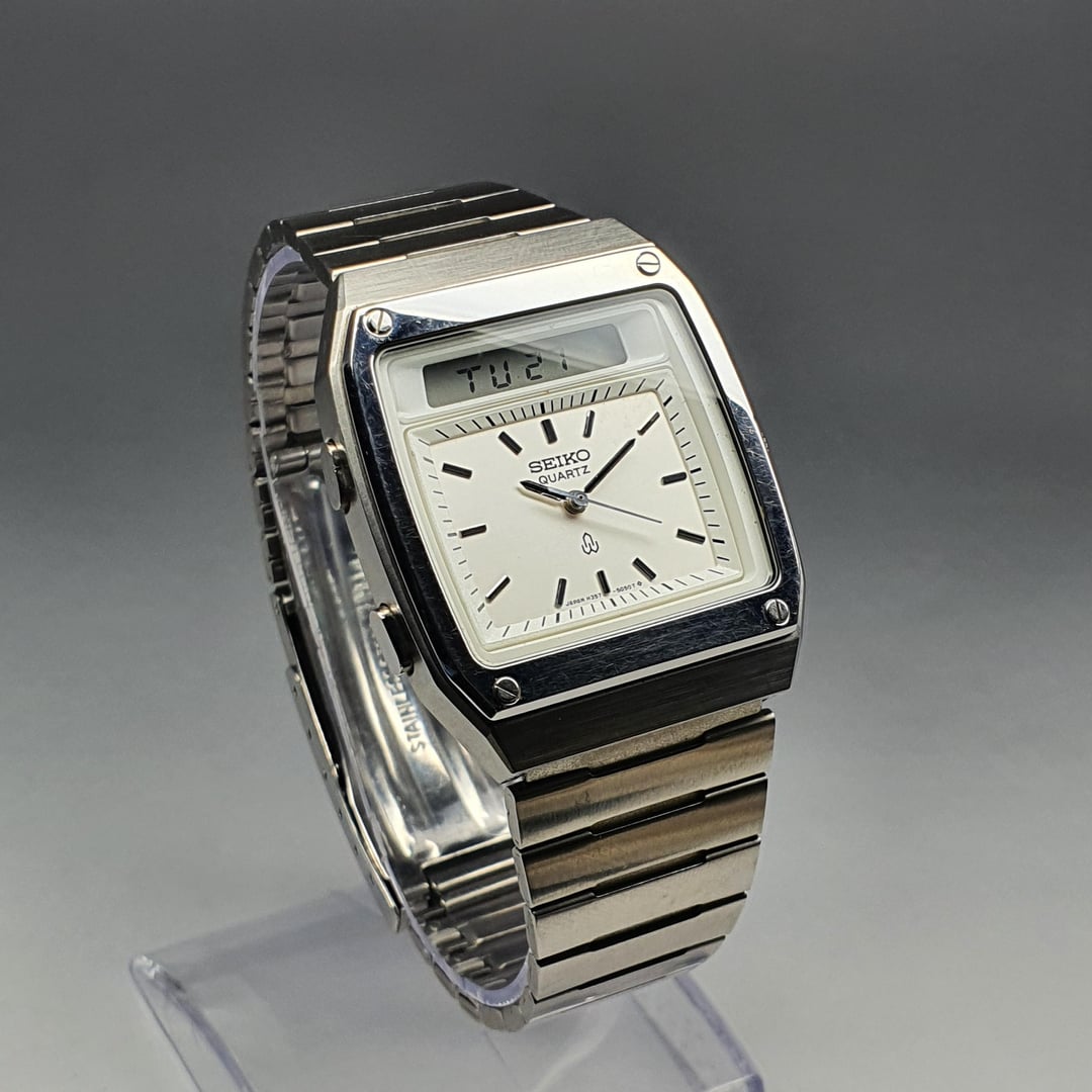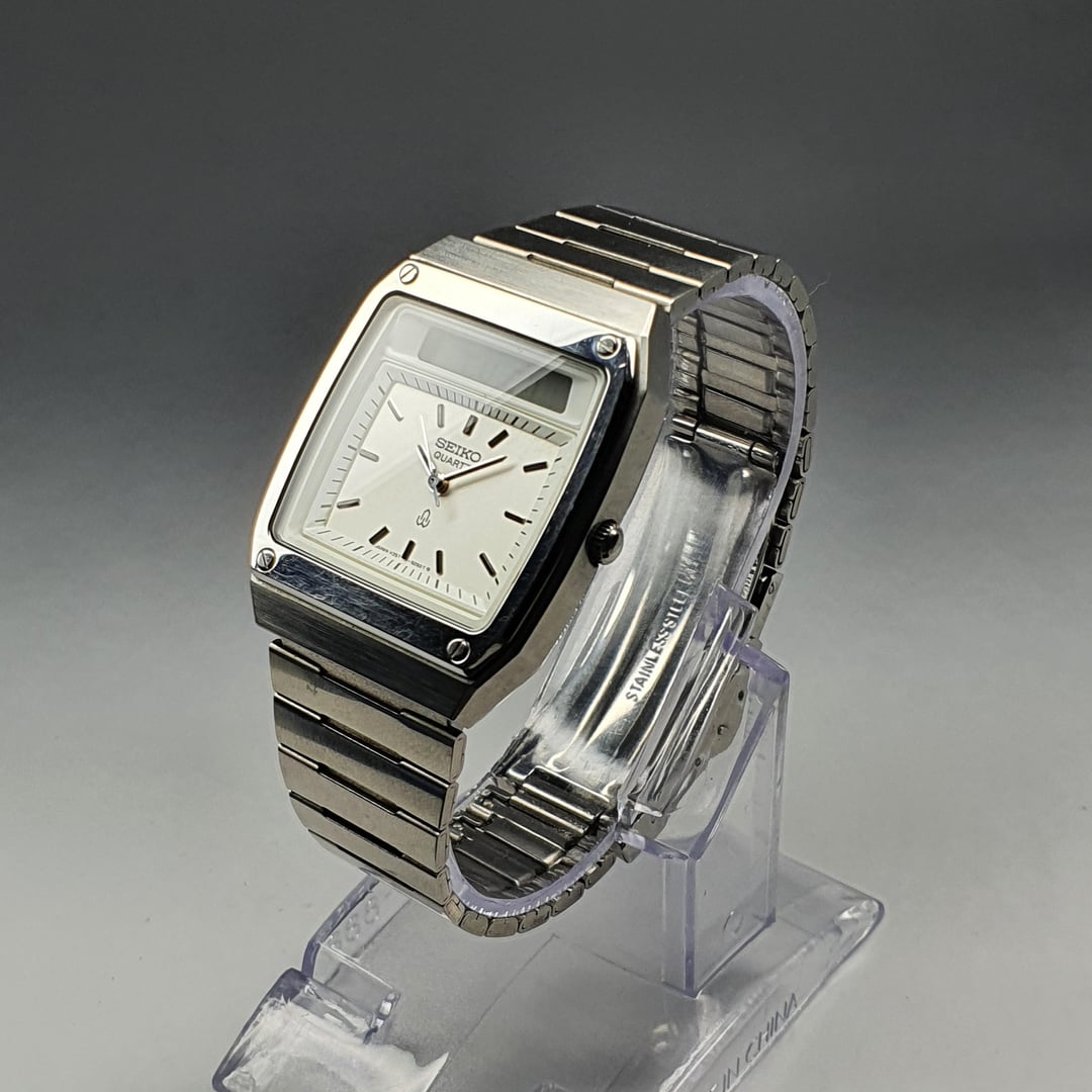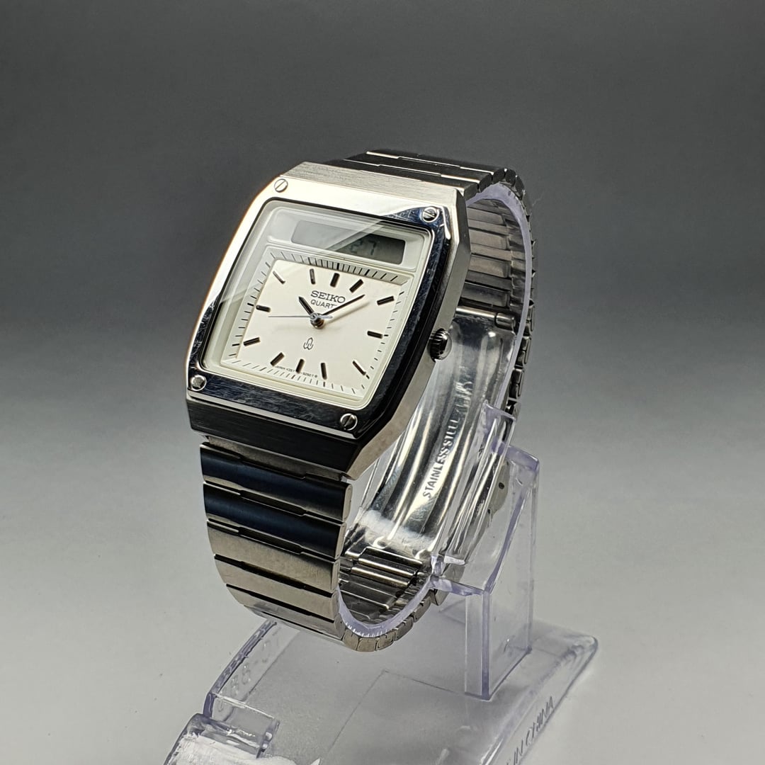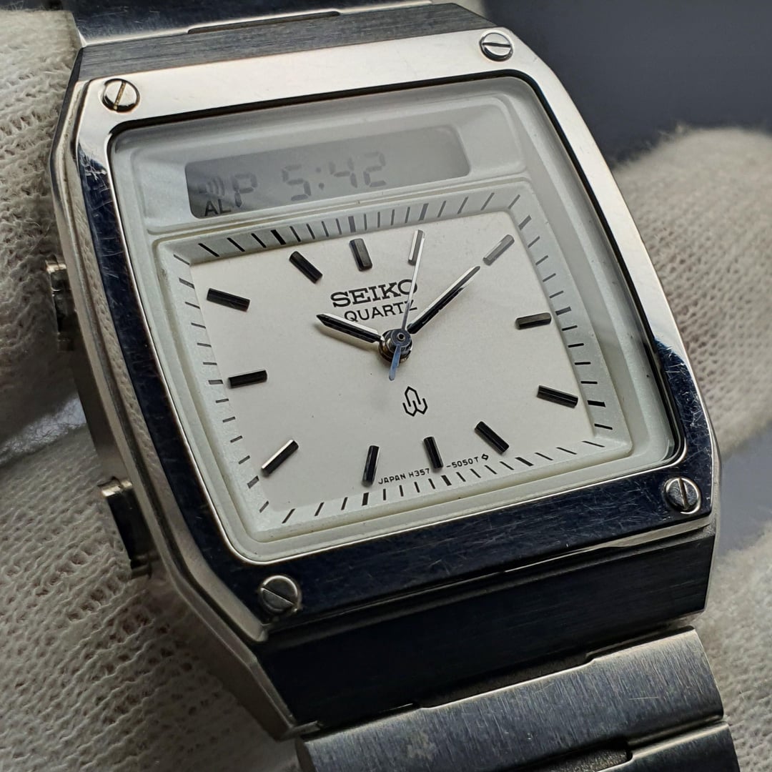 Hey WatchEx! For sale is this vintage Seiko "Hybrid Duo Display" (H357-5030), made in Japan in June of 1980. This watch is the white version of the watch that Roger Moore wore as James Bond in the film "For Your Eyes Only" released in 1981. The actual watch he wore is a modified version of this watch, which had a red digital display and an extra Seiko logo and vents on the top lug but was never released for the public, so this one and the black version are the closest available examples. Strangely, the black version has the Seiko logo on the bottom of the bezel instead of on the dial.  This example, with a very cool reference number JET030, is a beautiful offering from Seiko combining sport and elegance in a very '80s that makes it the obvious choice for James Bond. The mini dial has a pearly satin finish and applied stick baton markers that have black top surfaces and high polish sides that catch the light. The square design of the watch allows the digital LCD display to integrate nicely, being sunken into the dial. The dial has the single crystal quartz symbol being Seiko's pride at the time as the lead innovator in quartz technology. The swirl symbol at the bottom of the dial and the case back indicate that the watch was designed and manufactured by the Suwa factory during its fierce rivalry with the Daini factory. The high-polish bezel with screws gives the watch an industrial look to contradict the elegance of the rest of the watch and reminds me of the AP Royal Oak. The rest of the watch case is finely brushed.  It houses the calibre H357 movement that features the following functions: \- Perpetual Day/Date Calendar \- Second Time Zone \- Daily Alarm \- Hourly Chime \- Stop Watch/Chronograph Message me for instructions on how to use the functions. Comes on the original Seiko stainless steel bracelet, which has some great '80s flair, and can accommodate up to a 18.5cm wrist. Condition is amazing considering it was made 46 years ago with only minor general wear mostly on the bracelet and bezel. The original finishing is very much intact and the crystal and dial are basically spotless. All the functions work as they should. Looking for $245 net (buyer pays Paypal or Wise fee) + shipping Fitted with a brand new battery.  Dimensions are: 33.3mm x 39mm x 8.6mm Lug Width 19mm (according to my callipers) Bought in Japan. \*Returns accepted but all return postage costs are the buyer's responsibility in all circumstances and any fees that I have to pay when re-importing the watch will be deducted from the refund amount.