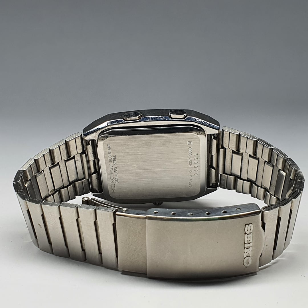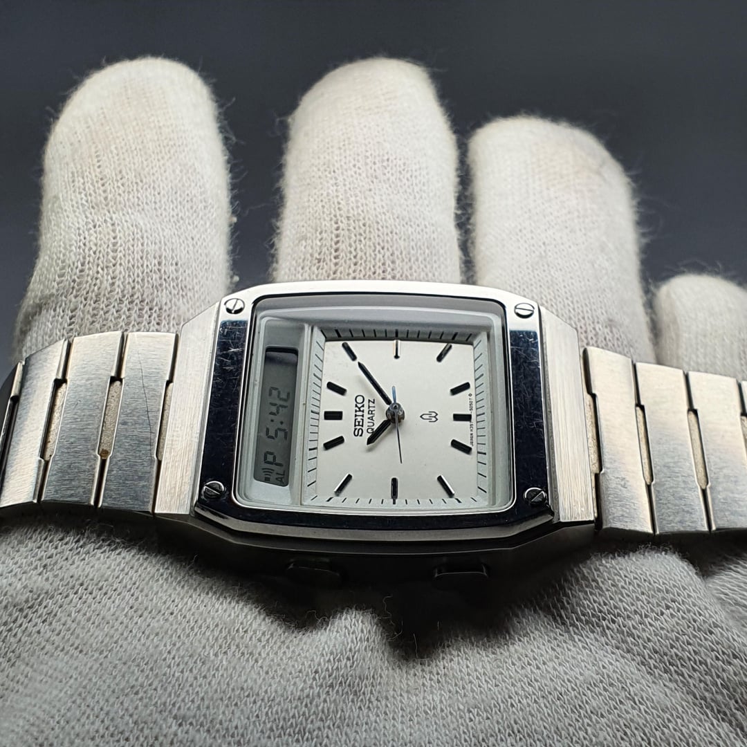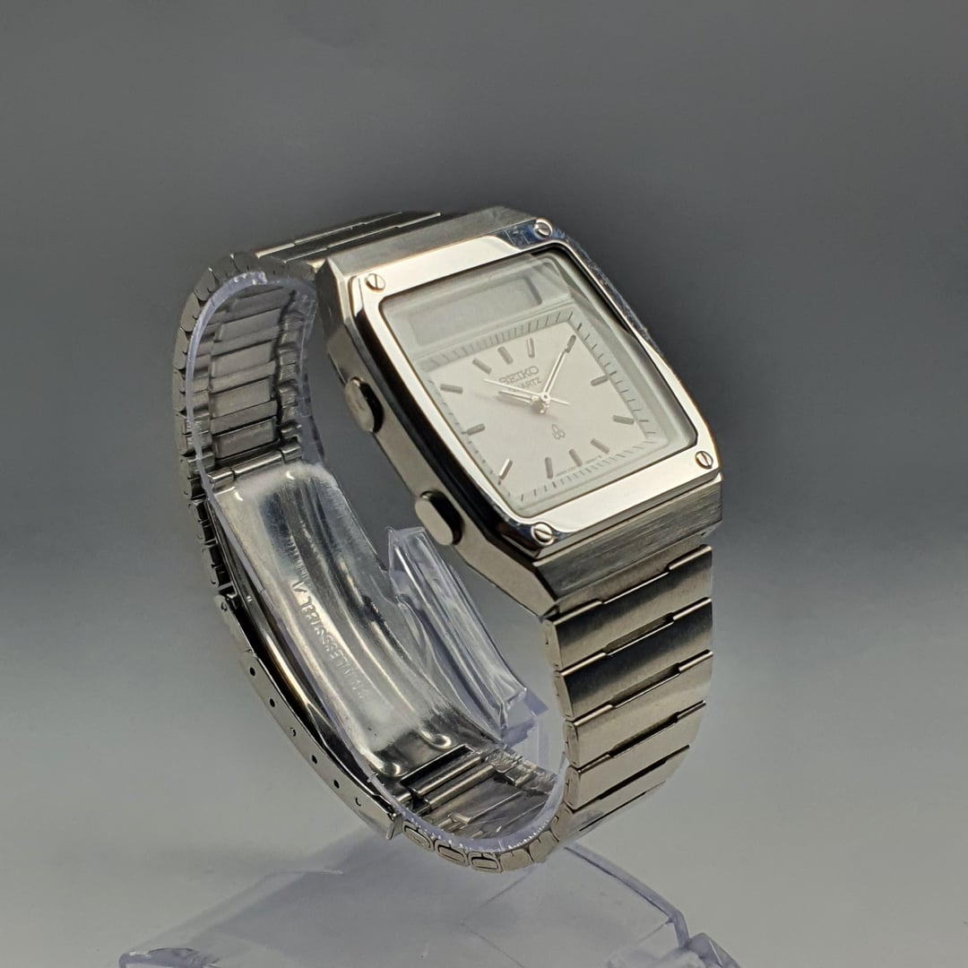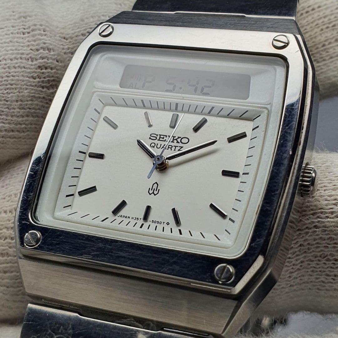 Hey WatchEx! For sale is this vintage Seiko "Hybrid Duo Display" (H357-5030), made in Japan in June of 1980. This watch is the white version of the watch that Roger Moore wore as James Bond in the film "For Your Eyes Only" released in 1981. The actual watch he wore is a modified version of this watch, which had a red digital display and an extra Seiko logo and vents on the top lug but was never released for the public, so this one and the black version are the closest available examples. Strangely, the black version has the Seiko logo on the bottom of the bezel instead of on the dial.  This example, with a very cool reference number JET030, is a beautiful offering from Seiko combining sport and elegance in a very '80s that makes it the obvious choice for James Bond. The mini dial has a pearly satin finish and applied stick baton markers that have black top surfaces and high polish sides that catch the light. The square design of the watch allows the digital LCD display to integrate nicely, being sunken into the dial. The dial has the single crystal quartz symbol being Seiko's pride at the time as the lead innovator in quartz technology. The swirl symbol at the bottom of the dial and the case back indicate that the watch was designed and manufactured by the Suwa factory during its fierce rivalry with the Daini factory. The high-polish bezel with screws gives the watch an industrial look to contradict the elegance of the rest of the watch and reminds me of the AP Royal Oak. The rest of the watch case is finely brushed.  It houses the calibre H357 movement that features the following functions: \- Perpetual Day/Date Calendar \- Second Time Zone \- Daily Alarm \- Hourly Chime \- Stop Watch/Chronograph Message me for instructions on how to use the functions. Comes on the original Seiko stainless steel bracelet, which has some great '80s flair, and can accommodate up to a 18.5cm wrist. Condition is amazing considering it was made 46 years ago with only minor general wear mostly on the bracelet and bezel. The original finishing is very much intact and the crystal and dial are basically spotless. All the functions work as they should. Looking for $245 net (buyer pays Paypal or Wise fee) + shipping Fitted with a brand new battery.  Dimensions are: 33.3mm x 39mm x 8.6mm Lug Width 19mm (according to my callipers) Bought in Japan. \*Returns accepted but all return postage costs are the buyer's responsibility in all circumstances and any fees that I have to pay when re-importing the watch will be deducted from the refund amount.