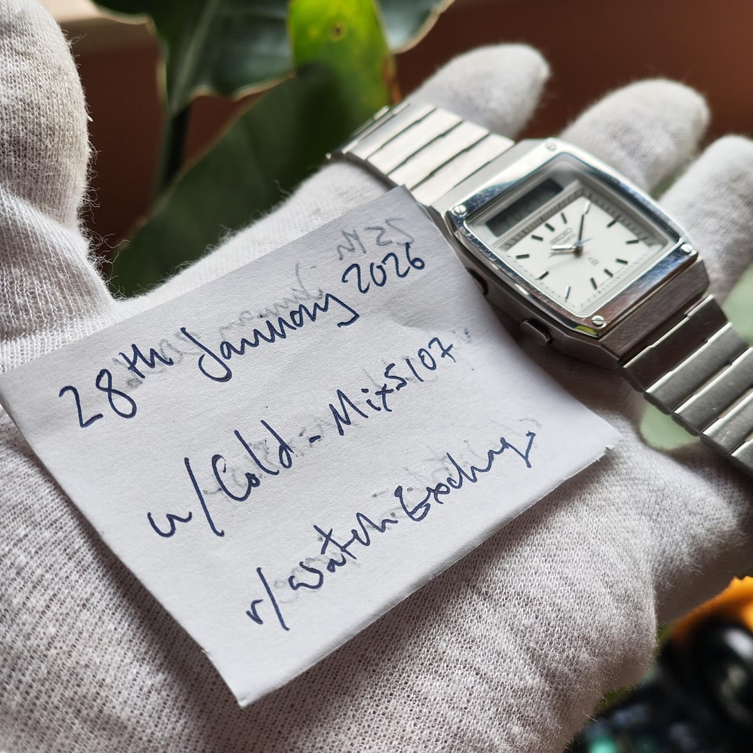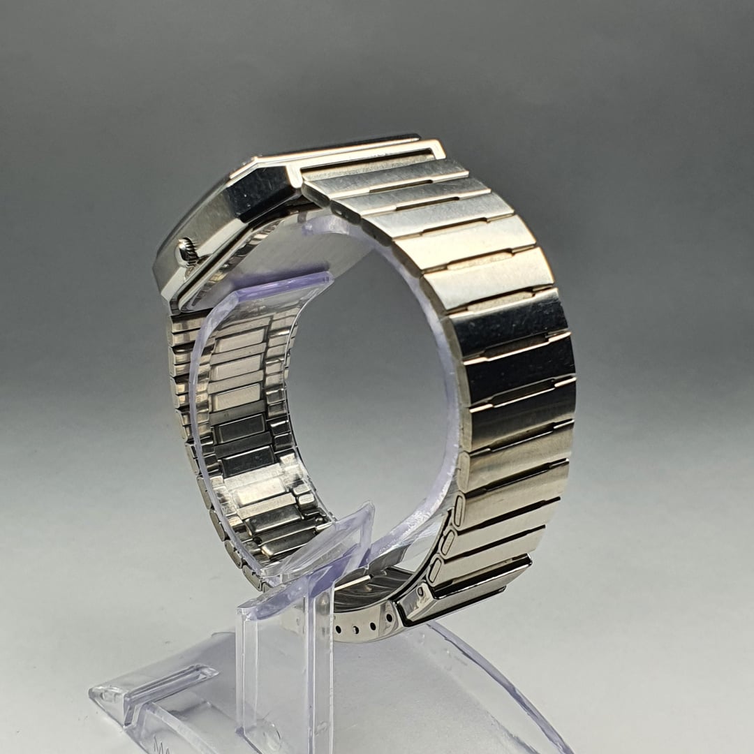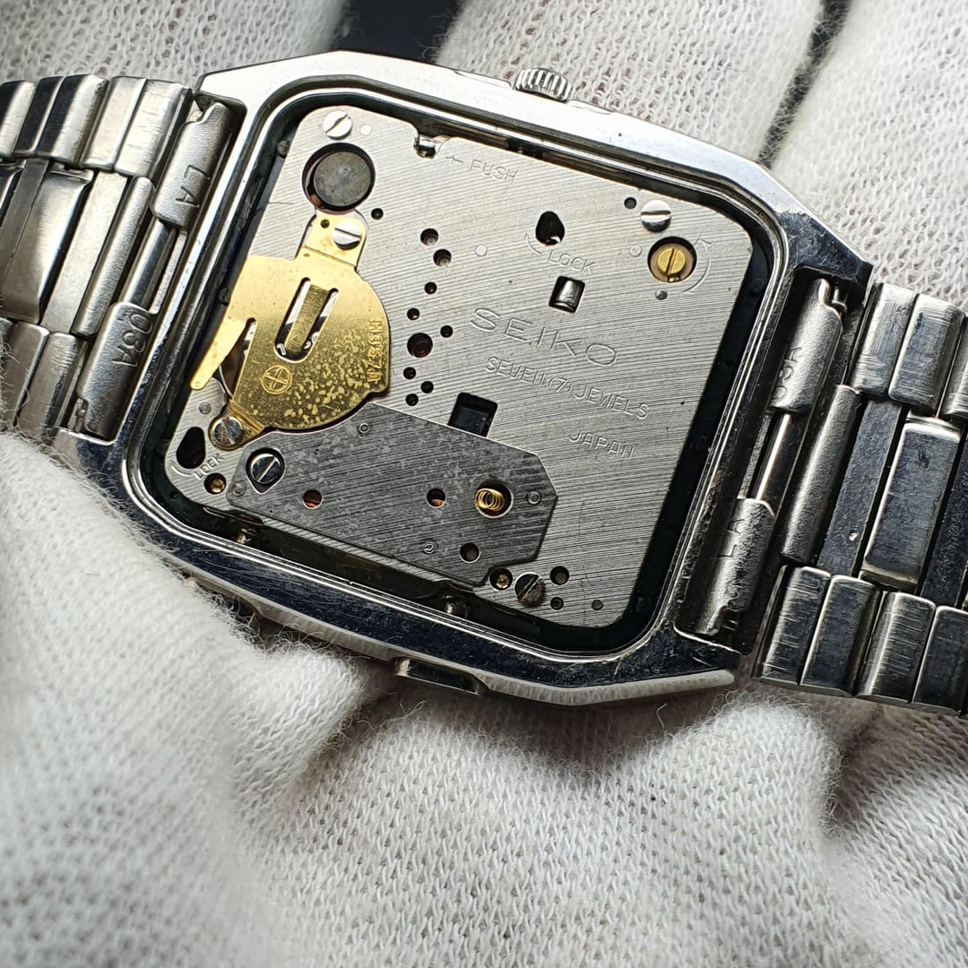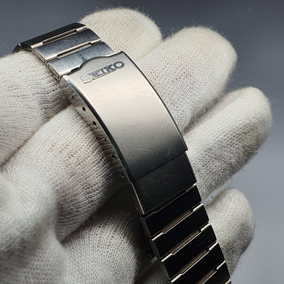 Hey WatchEx! For sale is this vintage Seiko "Hybrid Duo Display" (H357-5030), made in Japan in June of 1980. This watch is the white version of the watch that Roger Moore wore as James Bond in the film "For Your Eyes Only" released in 1981. The actual watch he wore is a modified version of this watch, which had a red digital display and an extra Seiko logo and vents on the top lug but was never released for the public, so this one and the black version are the closest available examples. Strangely, the black version has the Seiko logo on the bottom of the bezel instead of on the dial.  This example, with a very cool reference number JET030, is a beautiful offering from Seiko combining sport and elegance in a very '80s that makes it the obvious choice for James Bond. The mini dial has a pearly satin finish and applied stick baton markers that have black top surfaces and high polish sides that catch the light. The square design of the watch allows the digital LCD display to integrate nicely, being sunken into the dial. The dial has the single crystal quartz symbol being Seiko's pride at the time as the lead innovator in quartz technology. The swirl symbol at the bottom of the dial and the case back indicate that the watch was designed and manufactured by the Suwa factory during its fierce rivalry with the Daini factory. The high-polish bezel with screws gives the watch an industrial look to contradict the elegance of the rest of the watch and reminds me of the AP Royal Oak. The rest of the watch case is finely brushed.  It houses the calibre H357 movement that features the following functions: \- Perpetual Day/Date Calendar \- Second Time Zone \- Daily Alarm \- Hourly Chime \- Stop Watch/Chronograph Message me for instructions on how to use the functions. Comes on the original Seiko stainless steel bracelet, which has some great '80s flair, and can accommodate up to a 18.5cm wrist. Condition is amazing considering it was made 46 years ago with only minor general wear mostly on the bracelet and bezel. The original finishing is very much intact and the crystal and dial are basically spotless. All the functions work as they should. Looking for $245 net (buyer pays Paypal or Wise fee) + shipping Fitted with a brand new battery.  Dimensions are: 33.3mm x 39mm x 8.6mm Lug Width 19mm (according to my callipers) Bought in Japan. \*Returns accepted but all return postage costs are the buyer's responsibility in all circumstances and any fees that I have to pay when re-importing the watch will be deducted from the refund amount.
