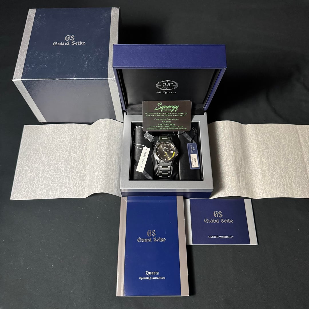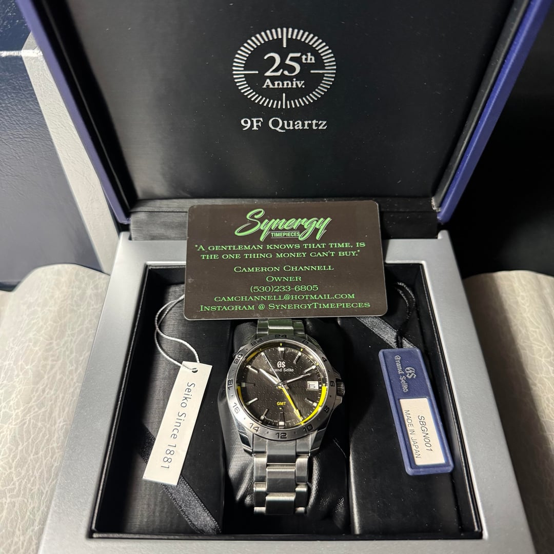 FOR SALE: Grand Seiko 9F Quartz GMT Ref# SBGN001 Offered for sale is a Grand Seiko SBGN001, the debut model of Grand Seiko’s celebrated 9F86 Quartz GMT series. This example is dated 2018, comes as a complete set with all boxes, papers, and booklets, and remains in excellent to good overall condition. The SBGN001 marked a milestone as Grand Seiko’s first-ever quartz GMT — a perfect fusion of precision engineering, impeccable finishing, and functional travel-ready design. Details Model: Grand Seiko SBGN001 Reference: SBGN001 / Caliber 9F86 Year: 2018 Movement: Grand Seiko 9F86 high-accuracy quartz (±10 sec/year) Functions: Hours, minutes, seconds, date, GMT (independent local hour hand) Case Size: 39mm Case Material: Stainless steel, Zaratsu polished Crystal: Dual-curved sapphire with anti-reflective coating Dial: Matte black with applied indexes and red GMT hand Bezel: Fixed 24-hour scale Water Resistance: 100m Bracelet: Stainless steel with push-button folding clasp Condition Watch Head: Excellent condition — light handling marks only, no deep scratches or dents. Crystal: Perfect, no marks or chips. Bracelet: Good condition with visible desk-diving marks consistent with regular wear; no significant dings or deformation. Functionality: All features operate correctly. Timekeeping and GMT functions perform within Grand Seiko specifications. Included ✅ Original Grand Seiko presentation box ✅ Outer box ✅ Warranty booklet (dated 2018) ✅ Instruction manual and booklets ✅ Original hang tag Key Features 9F86 Quartz GMT Movement: ±10 seconds per year accuracy and independent hour hand adjustment make this a true traveler’s GMT. Zaratsu Finishing: The case reflects Grand Seiko’s unmatched mirror polishing, normally reserved for their high-end mechanicals. Perfect Dimensions: 39mm case and 12mm thickness wear comfortably and elegantly. Historic Model: The very first Grand Seiko quartz GMT — Baselworld 2018 debut release. $3,100 shipped CONUS I’m a full time dealer with TONS of references across eBay, The Rolex Forum, WatchUSeek, and Instagram. All under the username: camchannell I’m more than happy to FaceTime anyone interested so you can see the watch in detail.