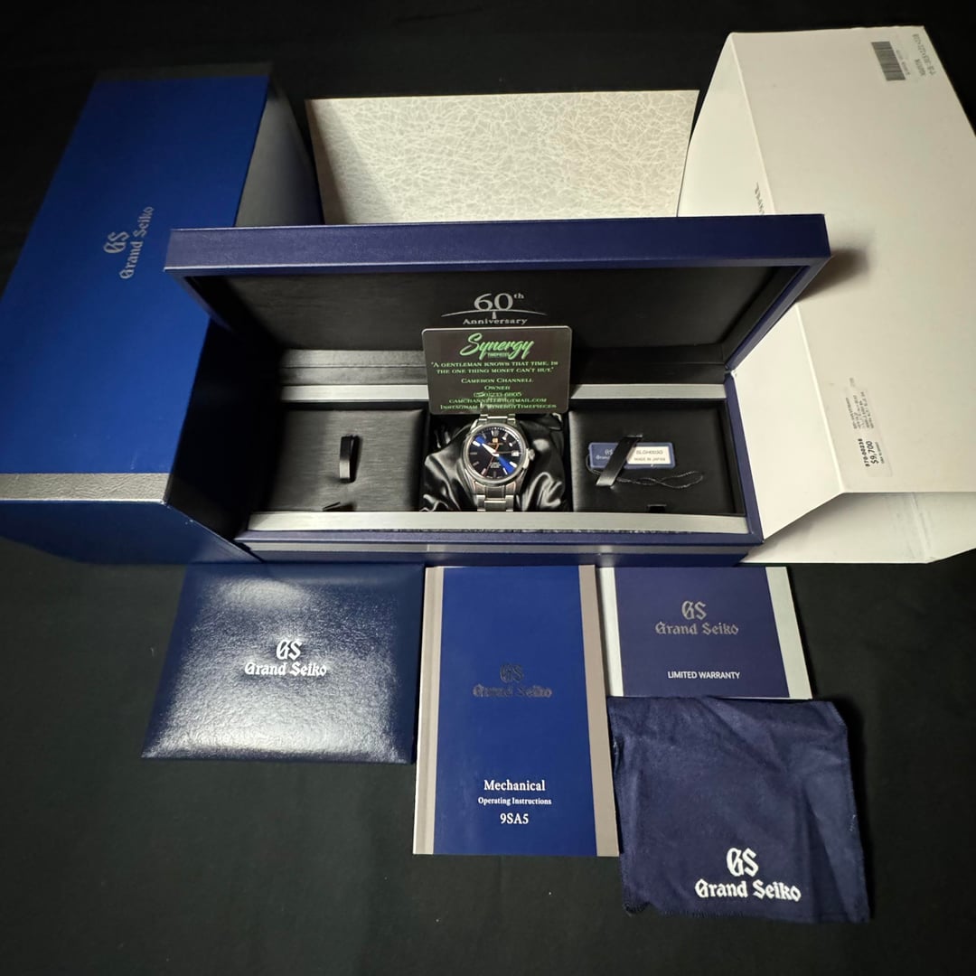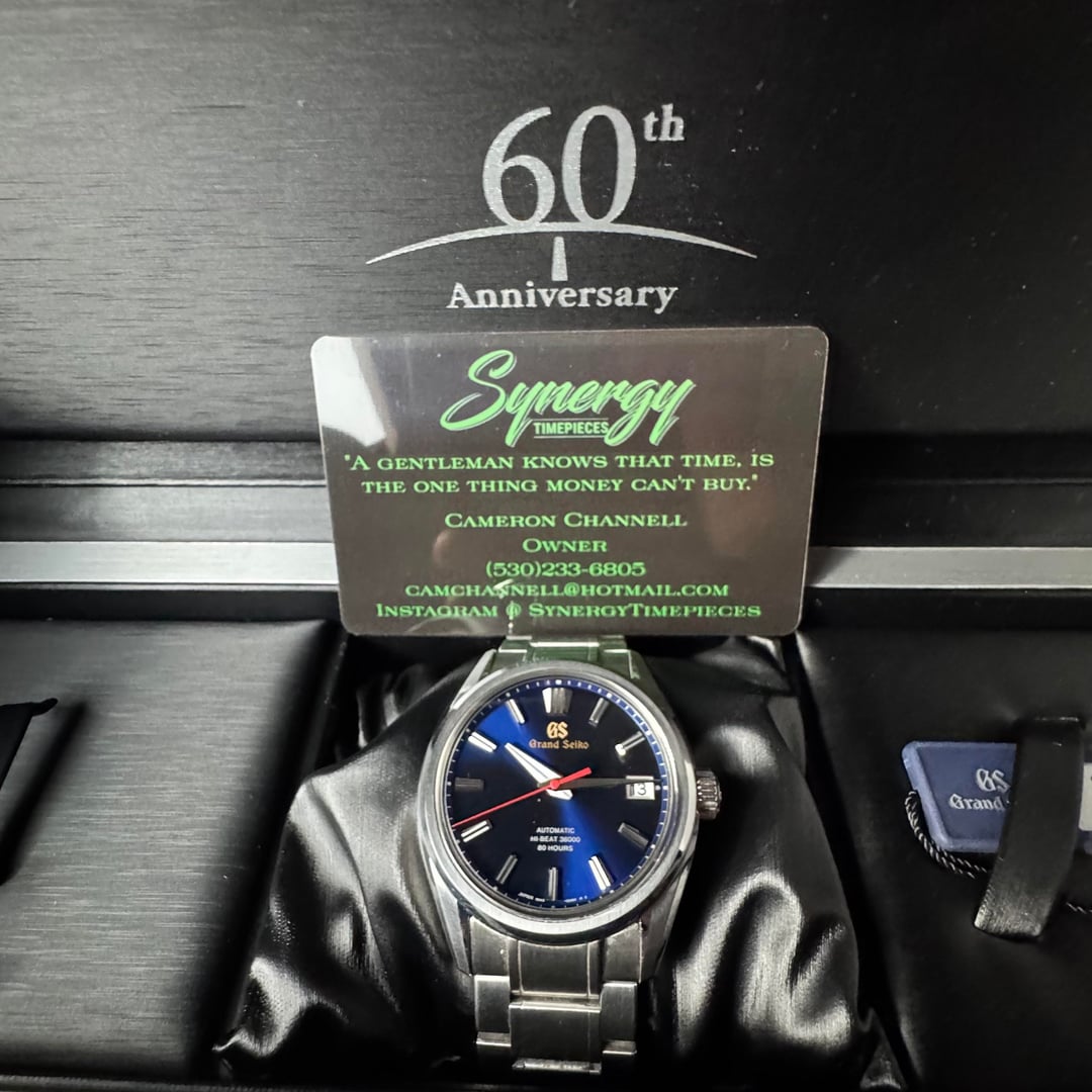FOR SALE: Grand Seiko SLGH003G – 60th Anniversary Limited Edition – Complete Set Reference #: SLGH003G Limited Edition: 1,000 pieces worldwide Case Size: 40mm stainless steel Movement: Hi-Beat 36,000 Caliber 9SA5 (80-hour power reserve, dual impulse escapement) Dial: Blue sunburst with gilt GS logo Water Resistance: 100m Crystal: Sapphire front & back Condition: Case is in excellent condition. The bracelet is in good used condition with light wear consistent with regular use, no deep scratches or dents. Crystal is clean. Runs strong and keeps excellent time. Set: Complete with original Grand Seiko box, papers, manuals, hangtags, and warranty book (dated 2021). Notes: This was the first model to debut Grand Seiko’s groundbreaking 9SA5 movement. Anniversary piece celebrating 60 years of Grand Seiko. Collectors’ item with future significance. $5,300 shipped CONUS I’m a full time dealer with TONS of references across eBay, The Rolex Forum, WatchUSeek, and Instagram all under the username: camchannell I’m more than happy to FaceTime anyone interested to see the watch in detail.