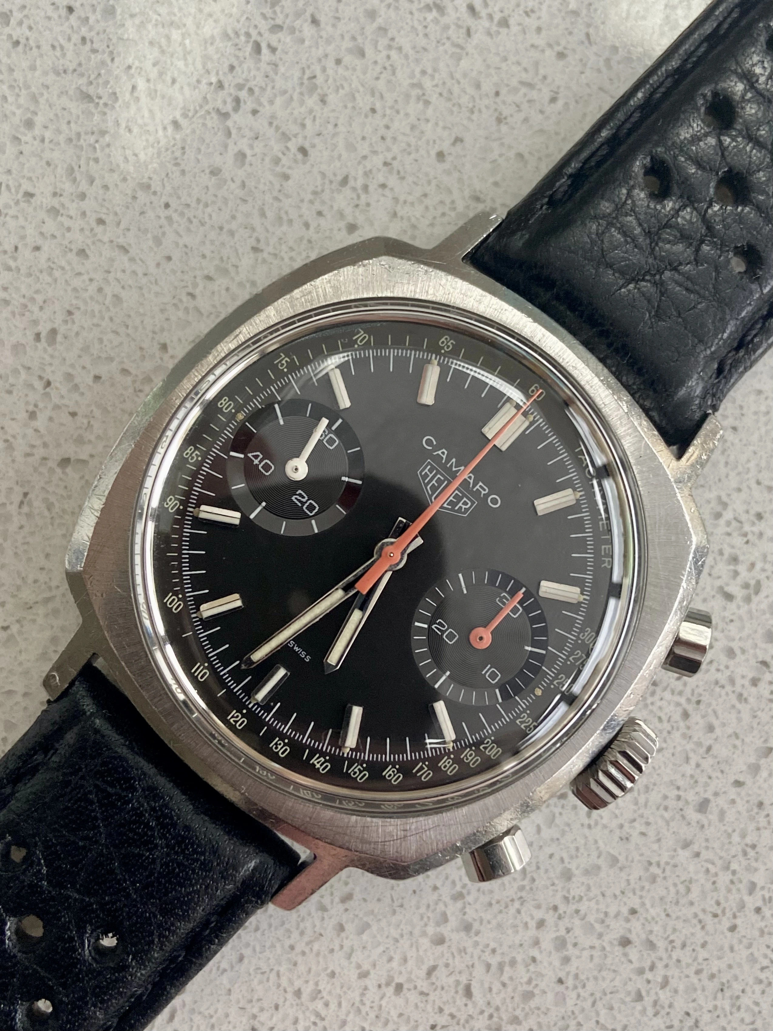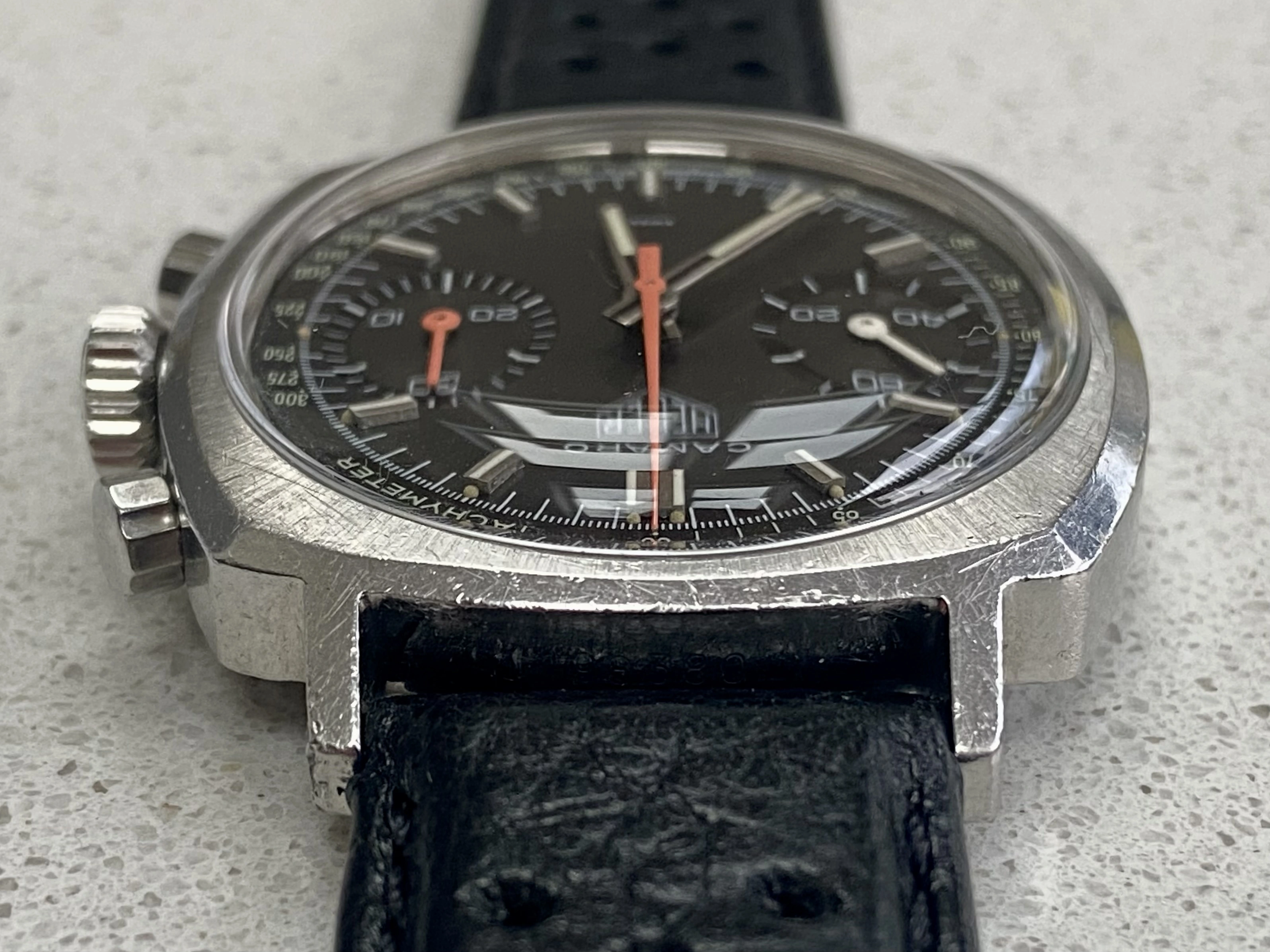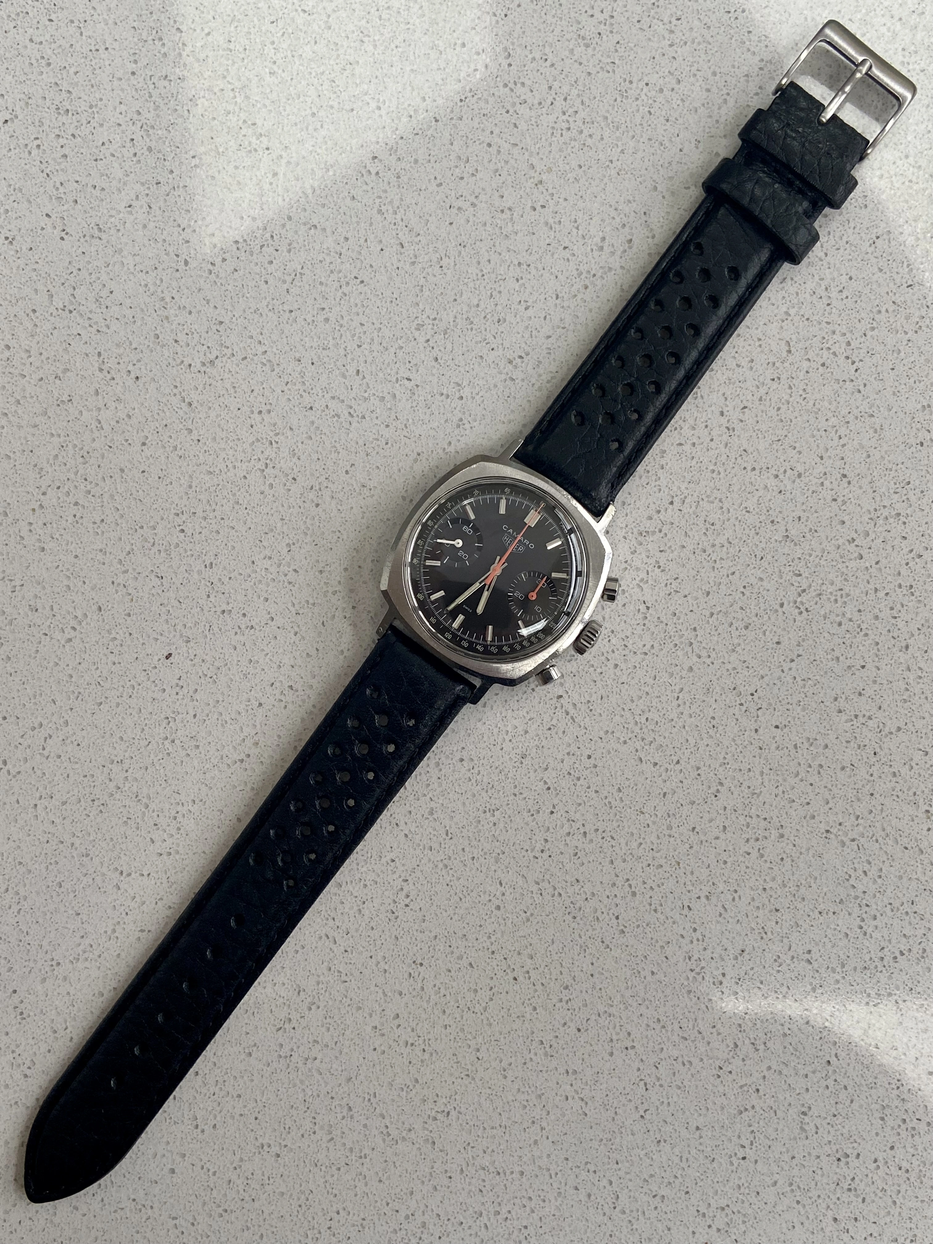 So, offering for sale a stunning late 60’s Heuer Camaro in excellent condition and fully correct. I bought this last year in true barn find condition and it’s been away for several months having a full restoration and service. As such it’s now running perfectly and is in excellent condition. The service included a new crystal, new and correct fluted pushers, new seals and a full movement service along with ultrasonic clean of the case. As you can see the result is outstanding. I don’t think a finer Camaro is currently offered for sale, certainly not at this price.
