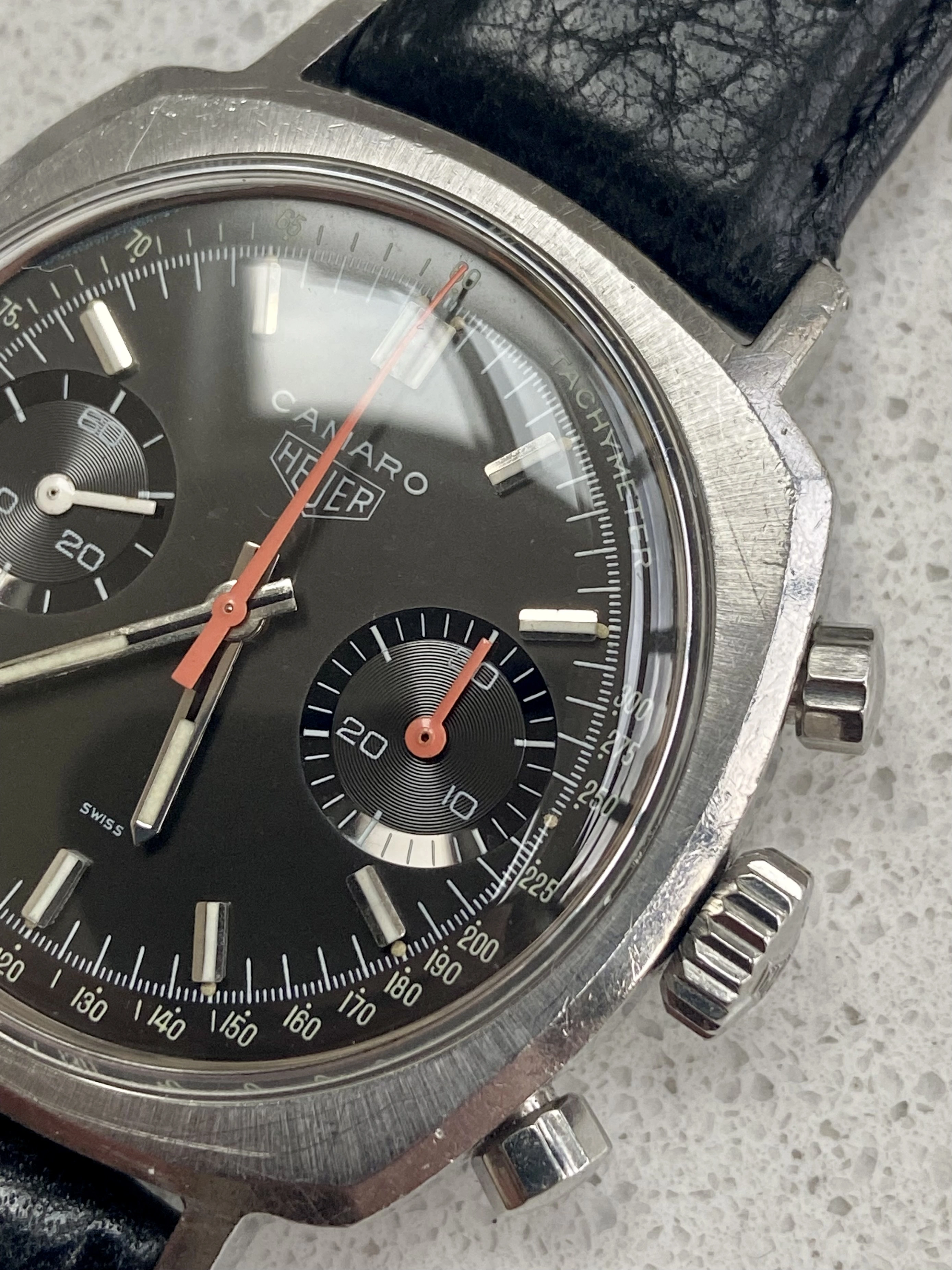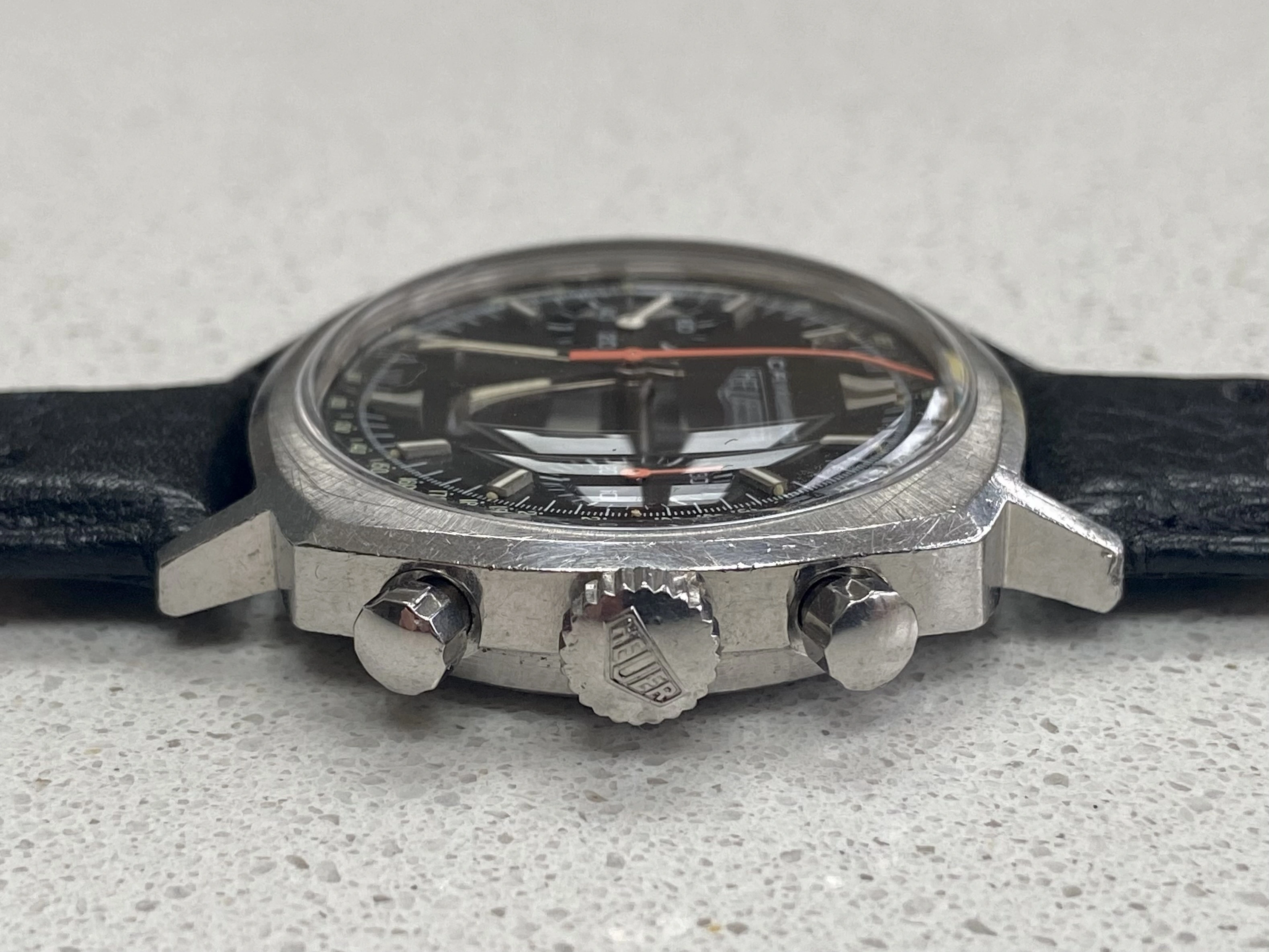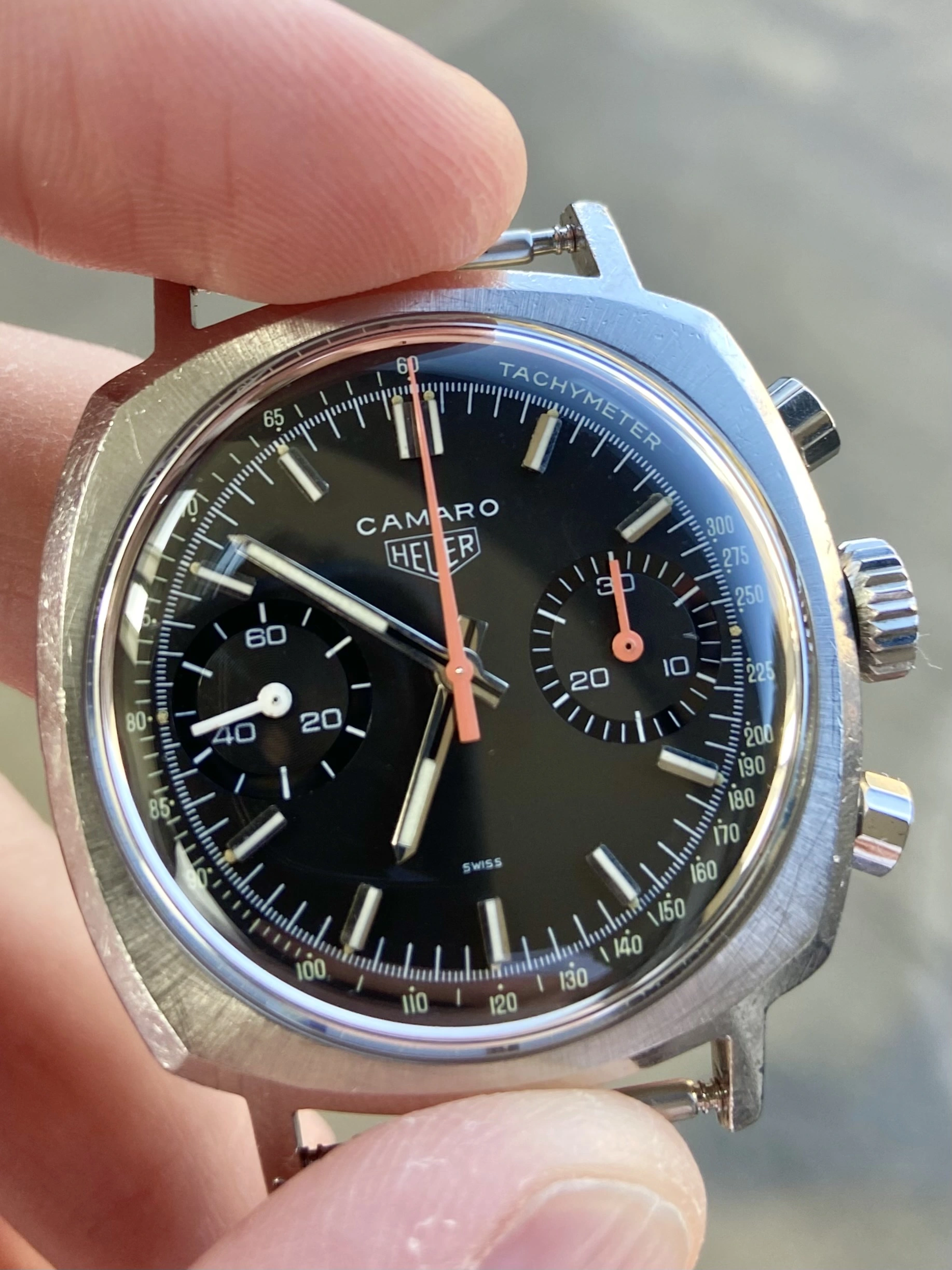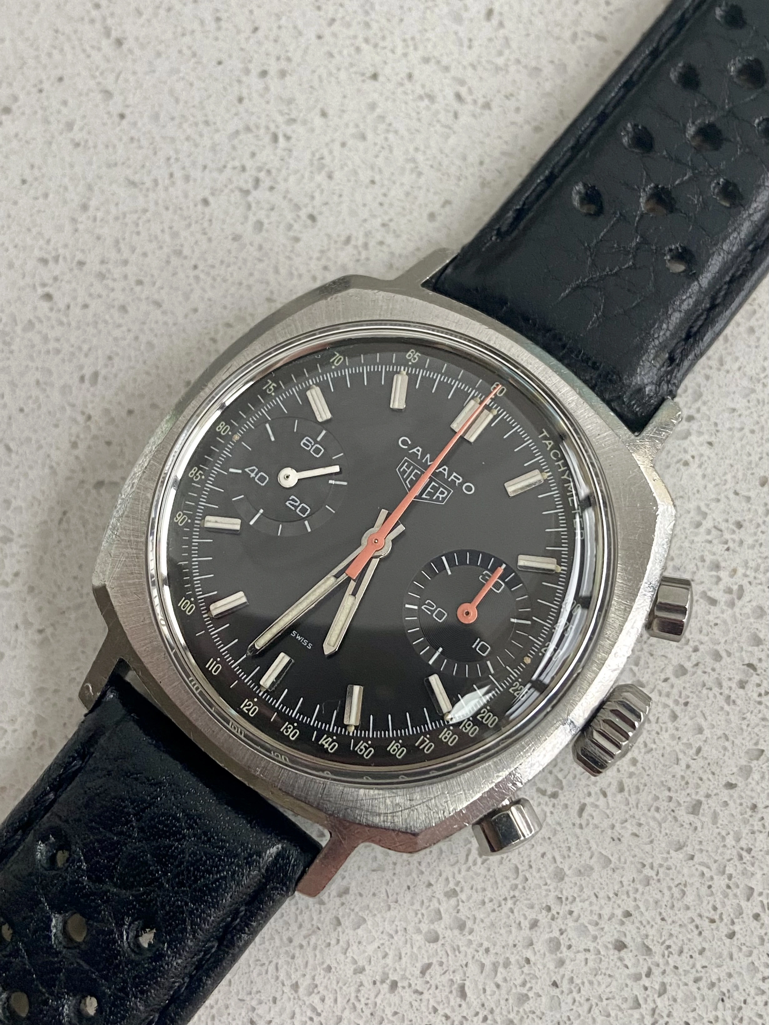 So, offering for sale a stunning late 60’s Heuer Camaro in excellent condition and fully correct. I bought this last year in true barn find condition and it’s been away for several months having a full restoration and service. As such it’s now running perfectly and is in excellent condition. The service included a new crystal, new and correct fluted pushers, new seals and a full movement service along with ultrasonic clean of the case. As you can see the result is outstanding. I don’t think a finer Camaro is currently offered for sale, certainly not at this price.