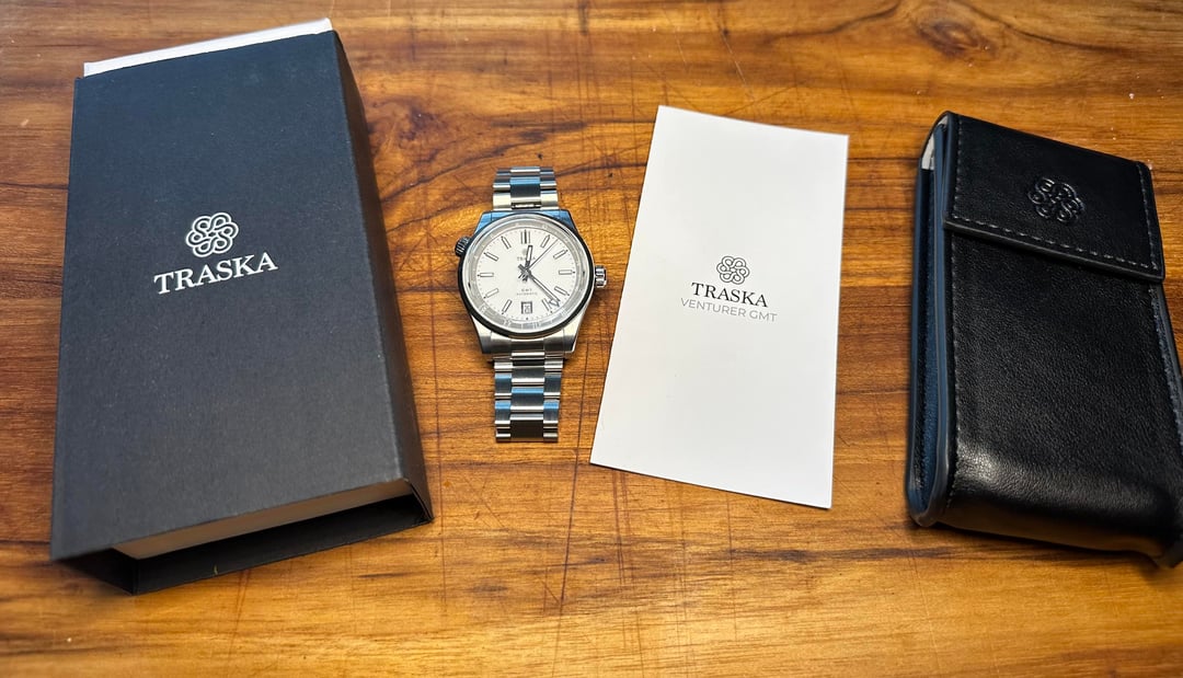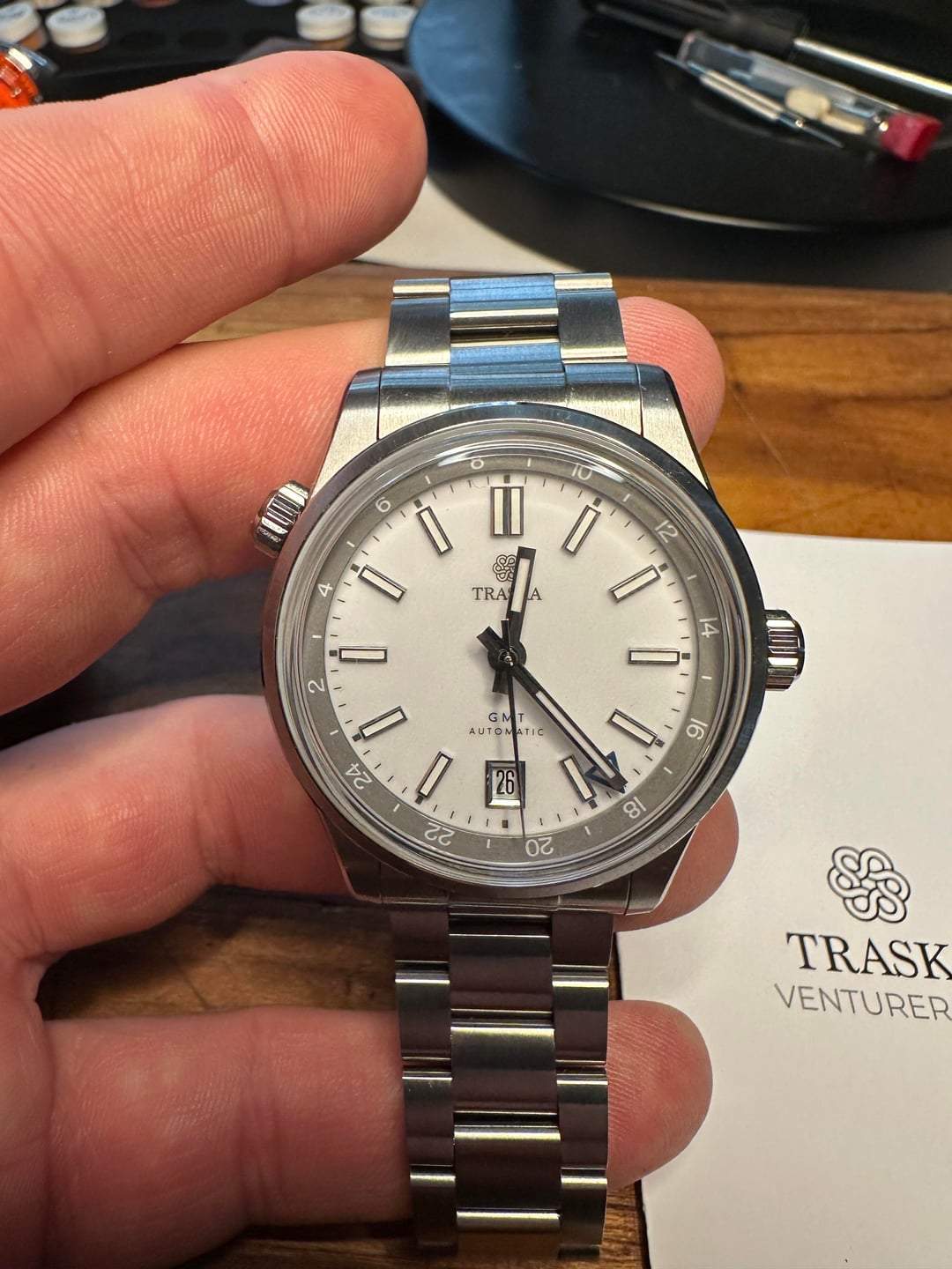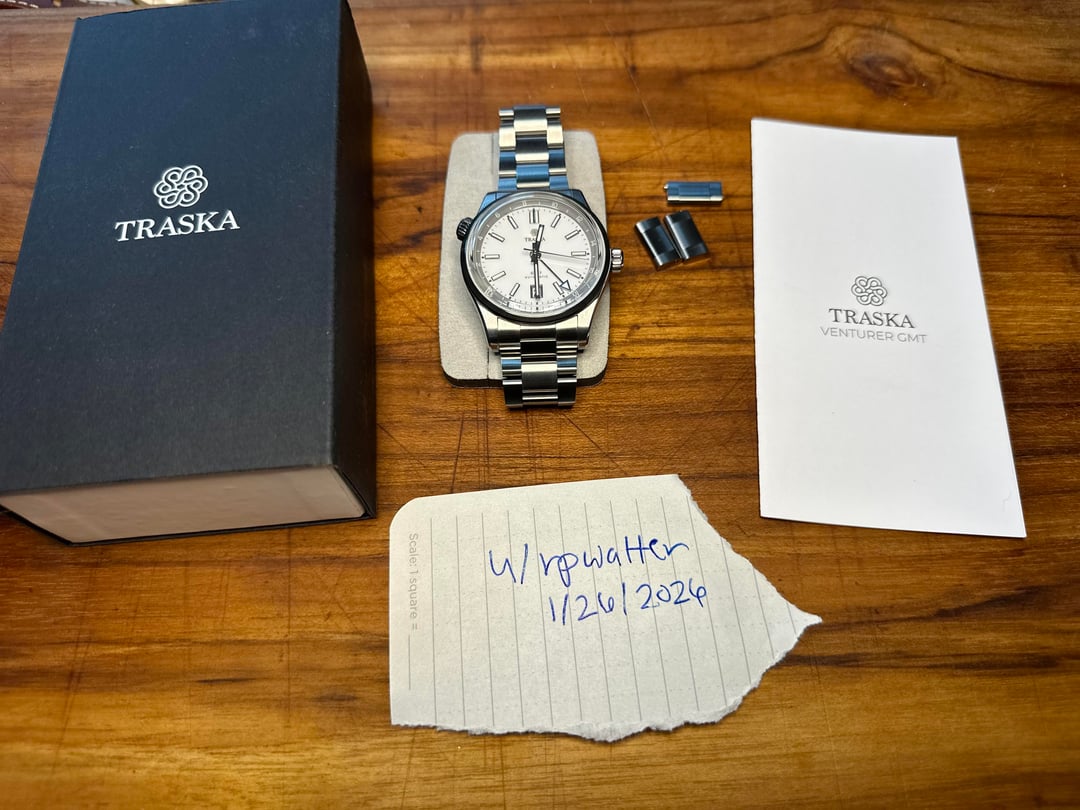 For sale is my new Traska Venturer GMT. This is the most recent model from the most recent release. It was delivered on 1/23/2026. I have only worn it twice, so it is in nearly new condition. Asking $825 plus CONUS shipping. Beautiful watch!