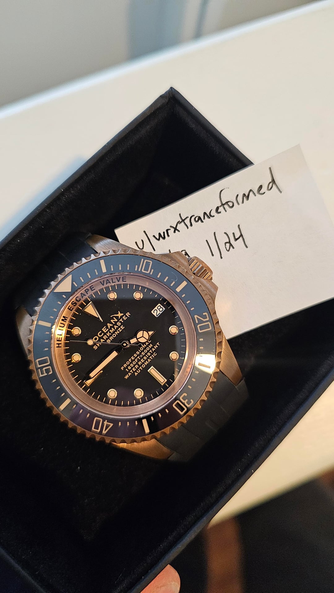 Hi folks! I have available yet another limited edition OceanX model, the Sharkmaster Bronze! This 44mm x 51.6mm x 15.6mm beast has an impressive 500M water resistance rating in part because of its screw down crown and helium release valve. It is powered by the reliable Seiko NH35 movement and the CuSn8 bronze case and buckle have developed a beautiful patina that can either be left by the new owner or chemically reset. The indices, chapter ring and handset share the same bronze color scheme and really set it off with an awesome vintage vibe. With a ceramic insert, this thing is ready for any adventure you throw at it. Condition wise I would put this at 97%. There are only a few very light marks on the case under very close inspection – the bronze patina hides any imperfections pretty well. There may be one or two tiny flaws in the anti reflective coating in the crystal, but that is really nitpicking. This thing looks nearly flawless on the wrist! The watch will come with its inner and outer boxes, a hang tag and manual with warranty card dated October 2019. Timestamp for Reddit: [https://preview.redd.it/wts-oceanx-sharkmaster-bronze-v0-hq67l4p3nogg1.jpg?width=1080&crop=smart&auto=webp&s=b80e48999e537894b18d110d4f24b6a173fc0089](https://preview.redd.it/wts-oceanx-sharkmaster-bronze-v0-hq67l4p3nogg1.jpg?width=1080&crop=smart&auto=webp&s=b80e48999e537894b18d110d4f24b6a173fc0089) FINAL PRICE DROP to $405 which includes fully insured shipping to the US. Not accepting Paypal or Venmo due to platform security issues. Not interested in trades at this time, trade offers will be ignored. Please message me with any questions or interest and thanks for looking!