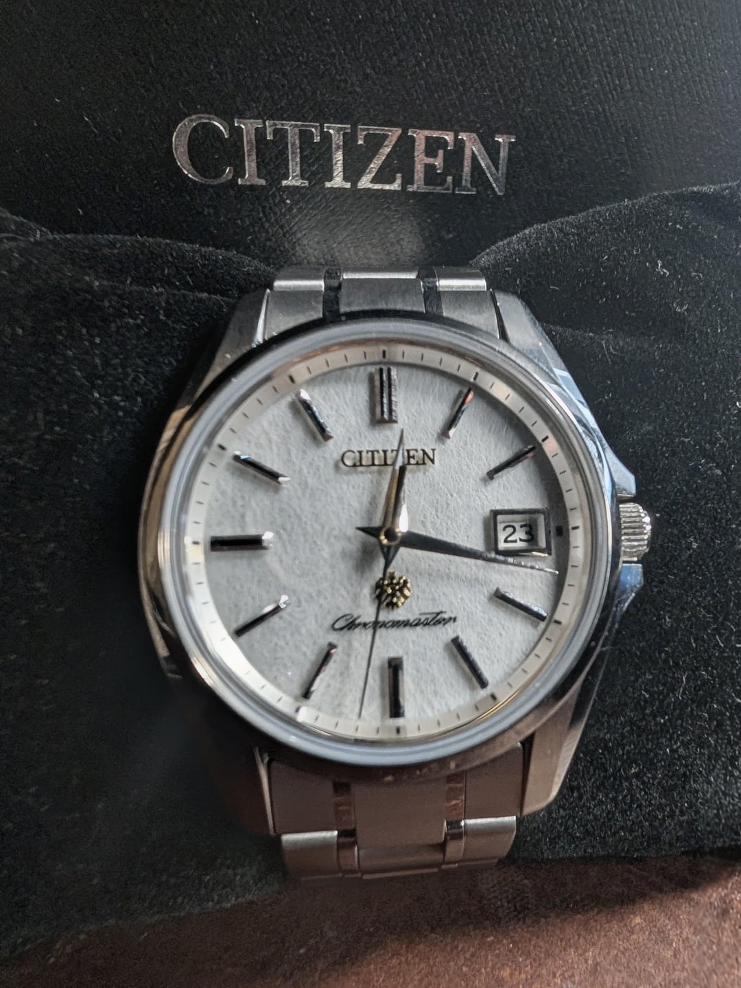 Up for sale is The Citizen Chronometer washi paper dial. Ref.AQ4021-51W Limited Edition 300pcs in excellent condition The Citizen Chronomaster AQ4021-51W is true high-end Japanese watchmaking, where technical precision and restraint take priority over flash. It’s part of The Citizen line, a range built around long-term accuracy, durability, and finishing rather than trends or marketing cycles. The case and bracelet are made from Citizen’s Super Titanium with DuraTCT hard coating. At just under 38mm in diameter and around 10.6mm thick, it wears light and exceptionally comfortable on the wrist, while remaining far more scratch-resistant than traditional steel. Water resistance is rated at 100 meters, making it perfectly capable as an everyday watch despite its refined appearance. The dial is one of the highlights. Made from traditional Japanese Washi paper, it has a subtle linen-like texture that shifts gently under different lighting. Applied indices and sharply finished hands add depth without clutter. It’s a quiet, considered design that rewards closer inspection rather than immediate impact. Inside is Citizen’s flagship Eco-Drive A060 movement, accurate to ±5 seconds per year. It’s solar powered, eliminating battery changes, and includes a perpetual calendar, power reserve indicator, automatic hand correction, and magnetic resistance. This is a movement designed to run accurately for decades with minimal intervention, assembled and regulated by certified The Citizen Meisters in Japan. The watch is in excellent condition with little scratches and no dents. Crystal is nice and clean, and dial is flawless. Watch is featured on OEM bracelet with full links that fits up to 23 cm (9.5 inches). Watch is currently running correctly and doesn’t need service anytime soon. Watch comes with original box and papers, and OEM Citizen straps. Price: $2650+ shipping Video call and local pick up are welcome 📍 New Haven CT