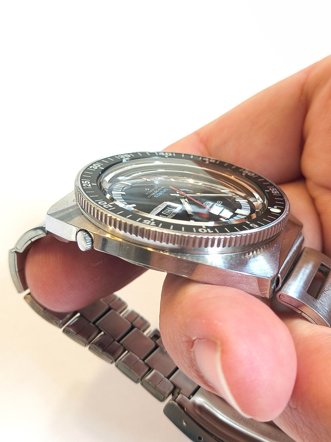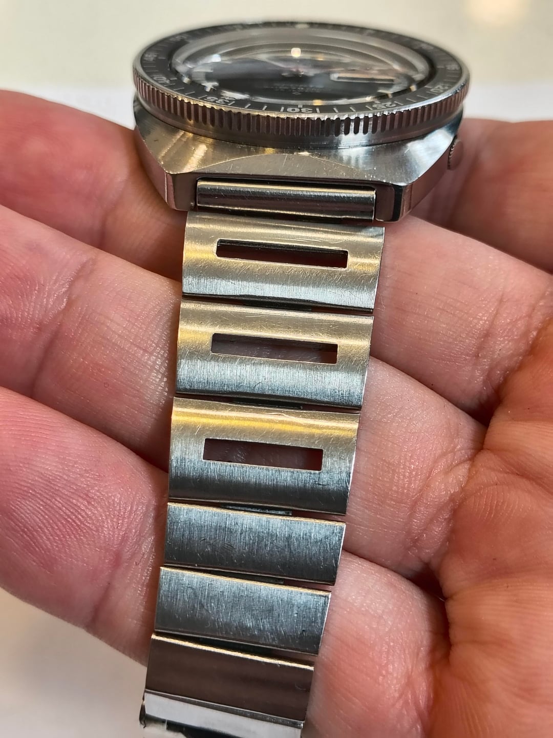 This appeared on the cover of the 1968 catalog. It was marketed as a sport diver for young people in the Japanese catalog. I believe the case is 39mm. The bracelet has a spring loaded extension and will fit up to a 7.5" wrist at least.