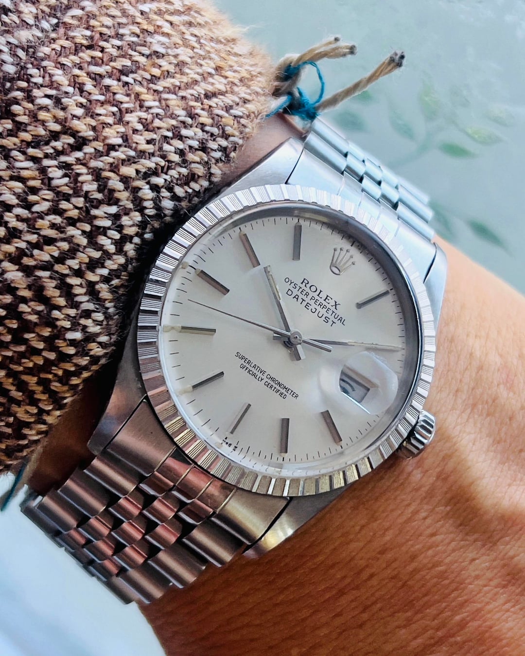 The Datejust is quintessential Rolex. It was introduced in the 1940s in solid gold with the reference 4467 and is still an industry icon today. This watch is a fine example of a classy timepiece that has never gone out of style and probably never will as it can be wore, casually professionally as well as formally. The silky sunburn silver dial is forever sharp and pairs with everything. In this era: The 16014 variation points to a white gold fluted bezel. The 16000 is a smooth steel one and 16030 sports an engine turned steel bezel. Today, the Oyster Perpetual series is hands down the most popular of the crown and the OP is some one the original dna. We subjectively love the cohesive look of the rippled steel bezel matching the jubilee—as well as the oyster paired with a smooth bezel. While service history is unknown, the automatic quickset caliber 3035 movement is both healthy and smooth on timegrapher—quickest snaps like it should. The case and bracelet are also clean with minimal signs of wear just a bit on sides of case and just light signs of polish—no notable damage. The dial has some oxidation near 12 and light marks on crystal. The bracelet has typical stretch for a 1979 but not noticeable on wrist and quite comfortable.