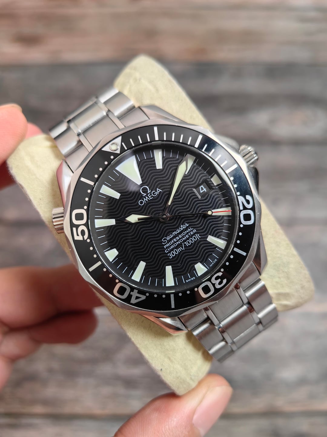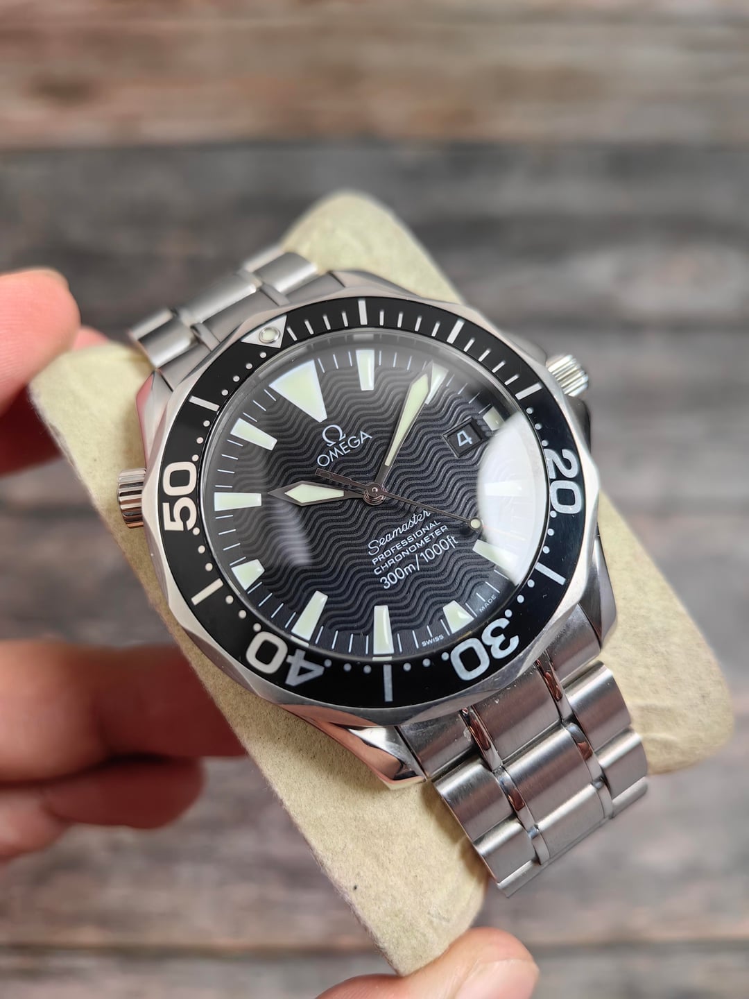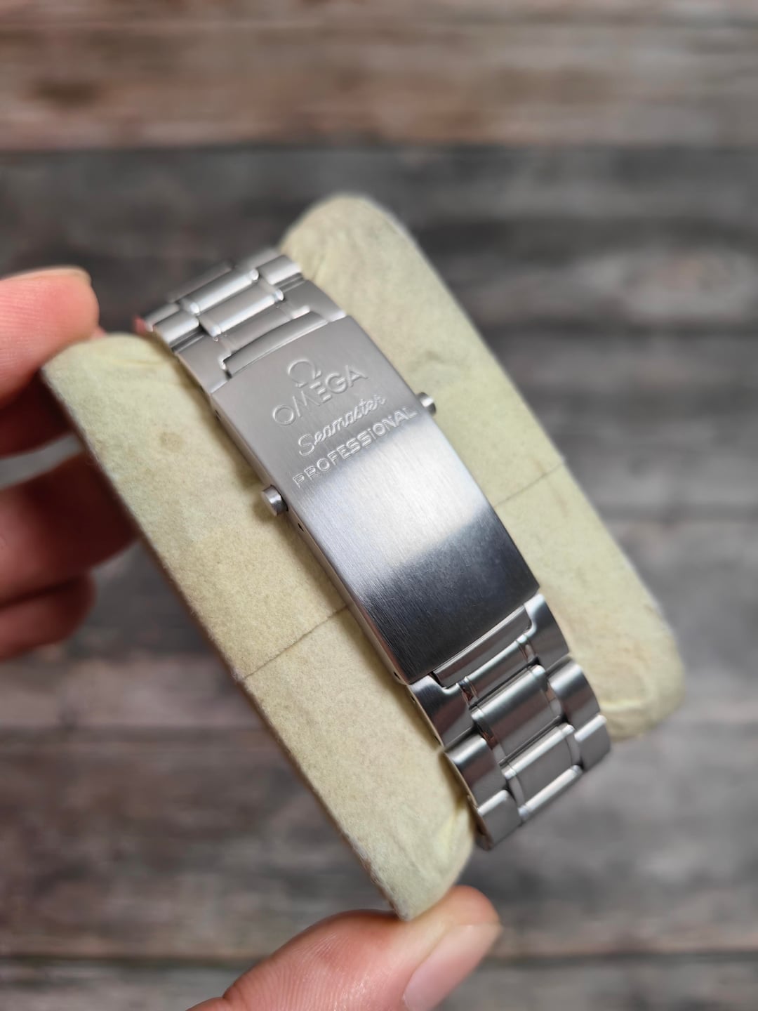Watch on original Omega bracelet (can fit up to 7-7.25 inch wrists depending on wrist shape), and replacement box.