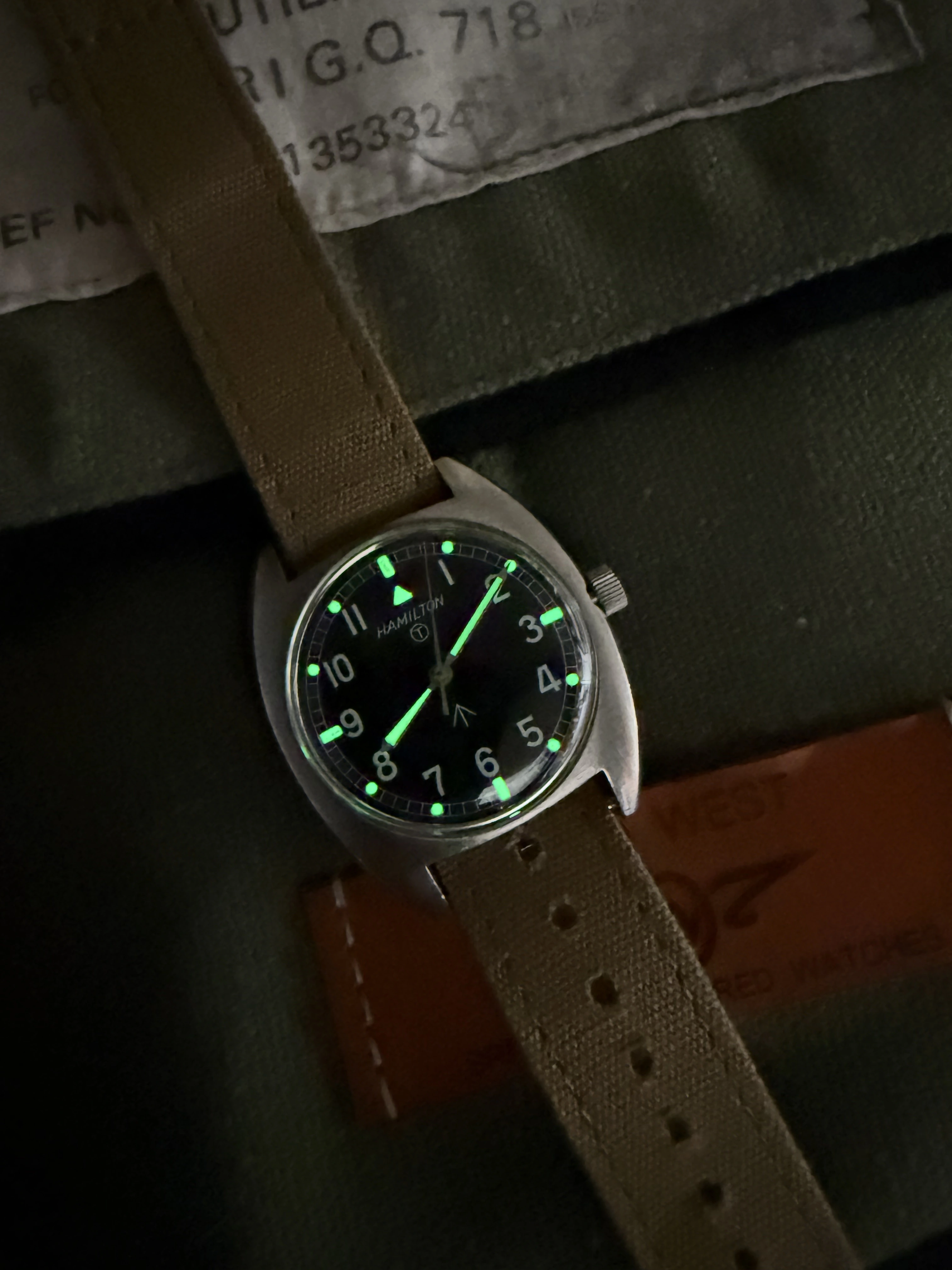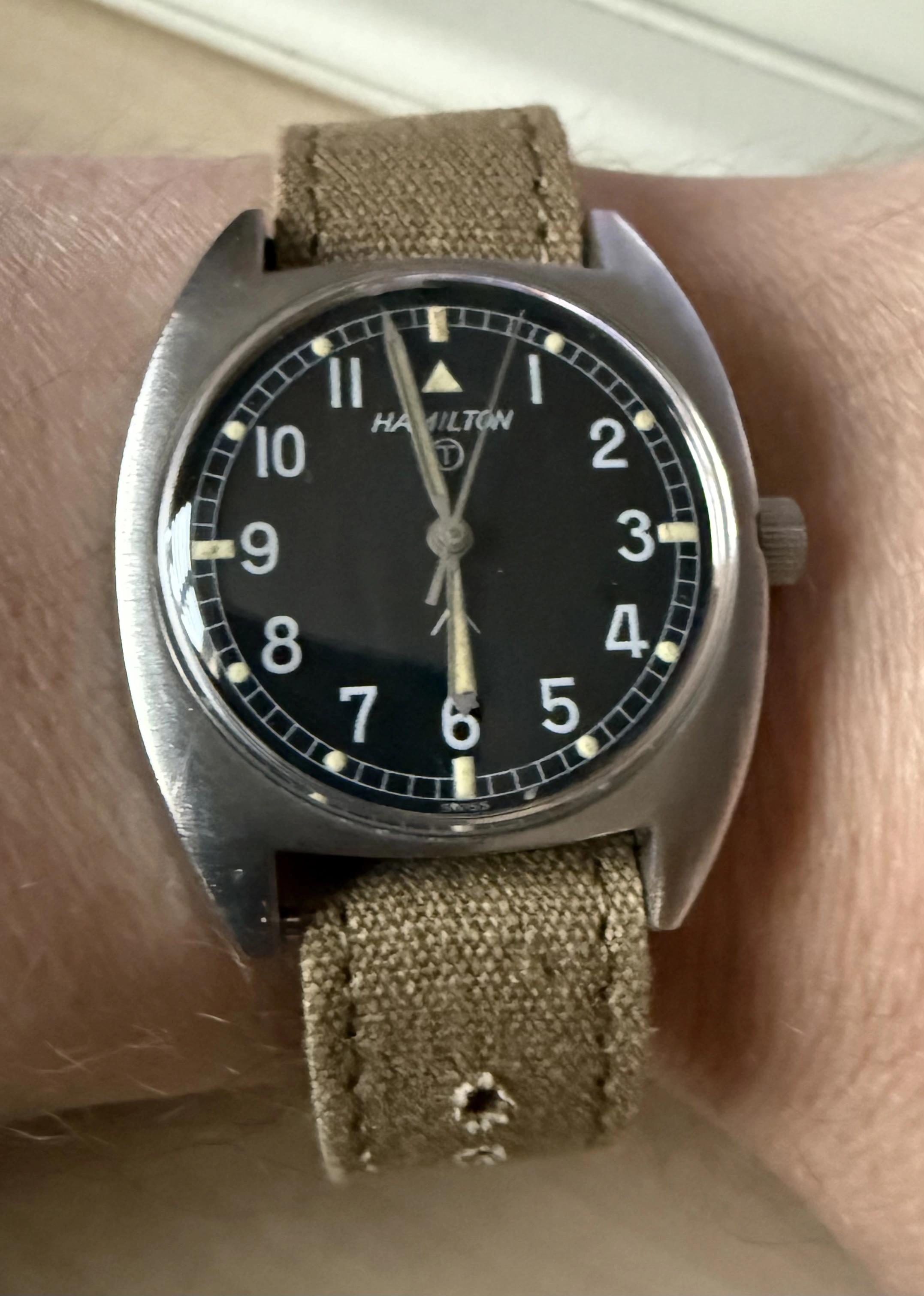British military issue Hamilton W10 (W10-6645-99) circa 1973. Supplied on khaki canvas DEF-3 / A.F.0210 / Type 37 pattern strap, manufactured by ‘Revo’ on the Military Watch Forum