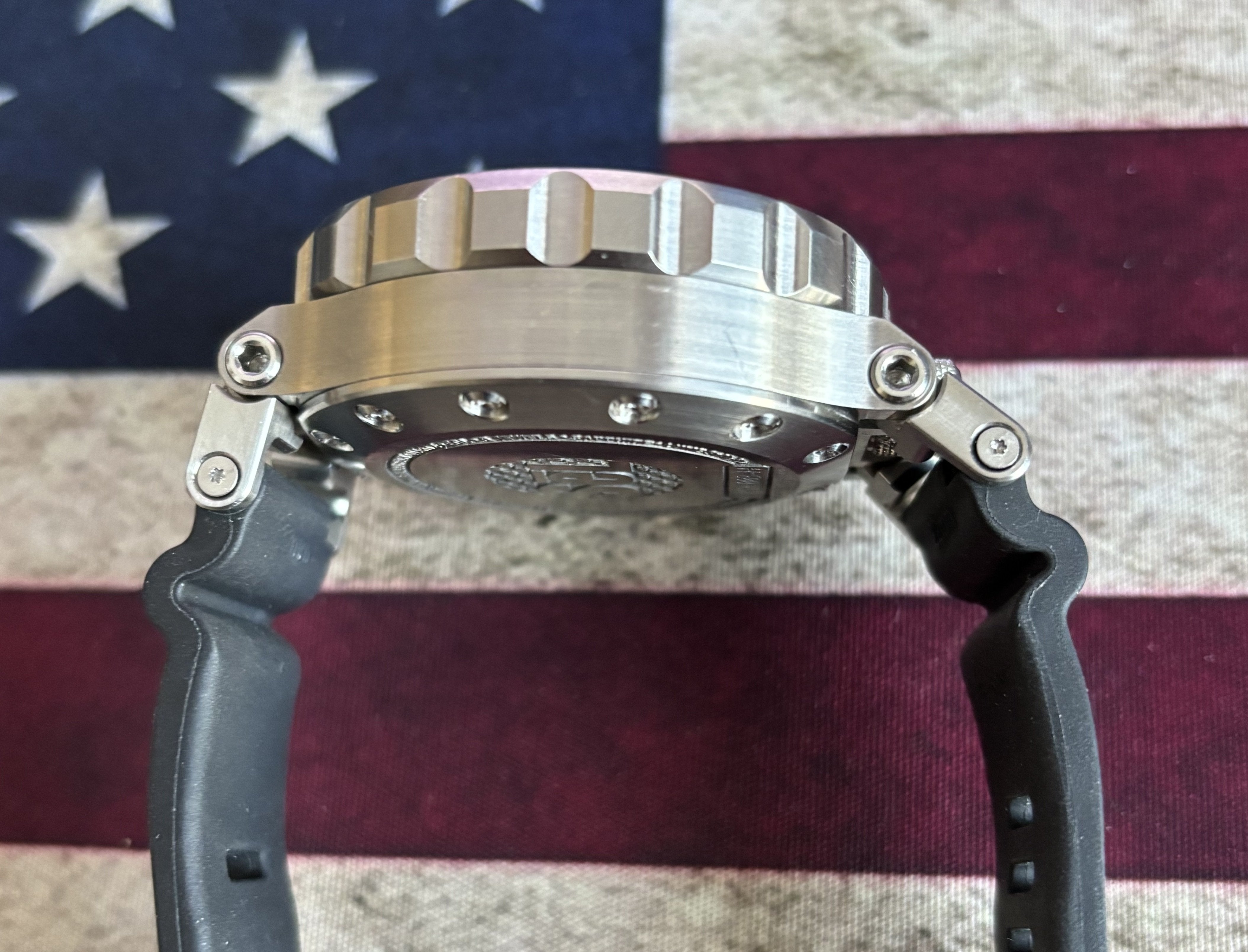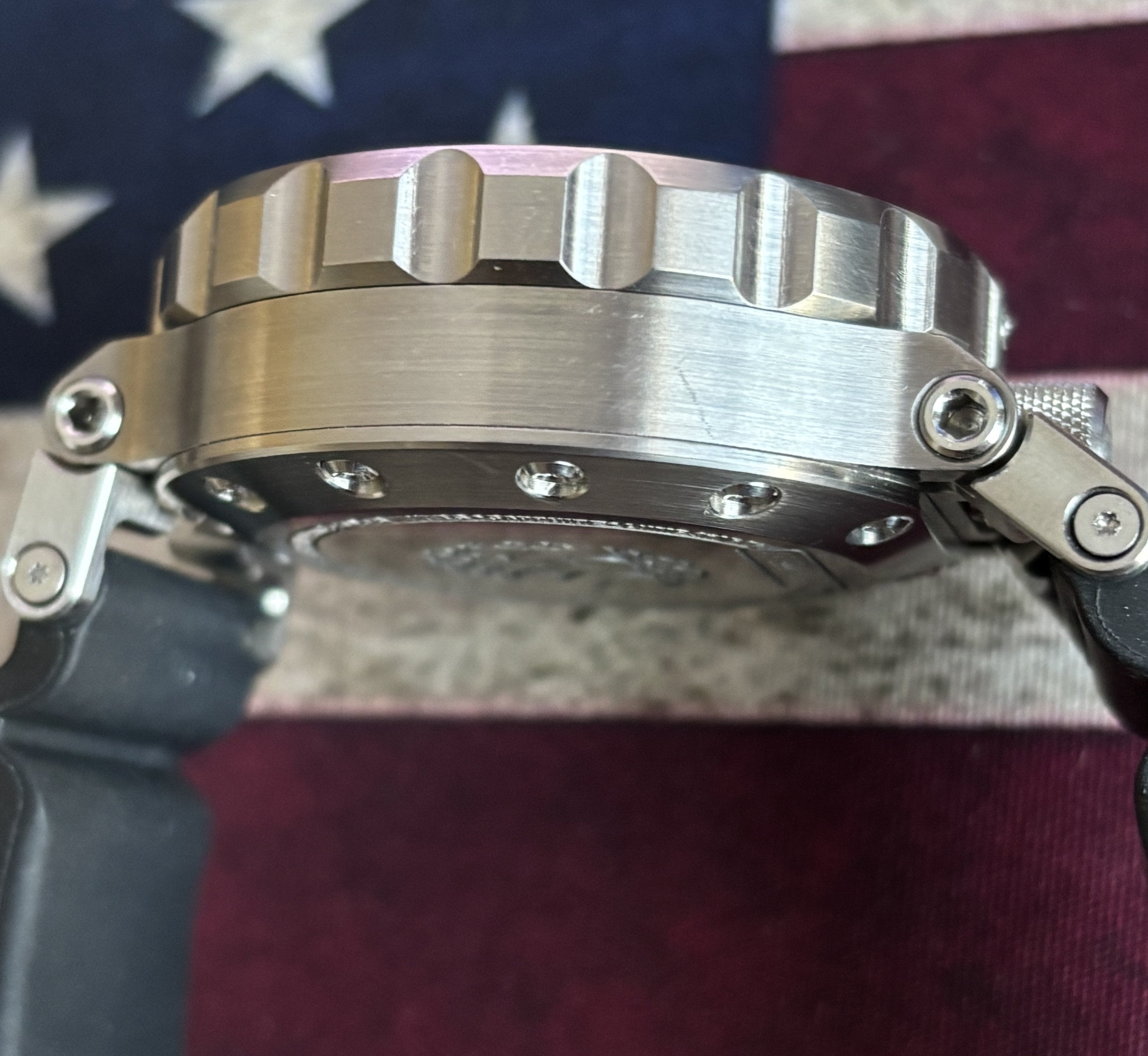 Comes with mounted lug adapters on a Divecore strap along with tools & wood box.