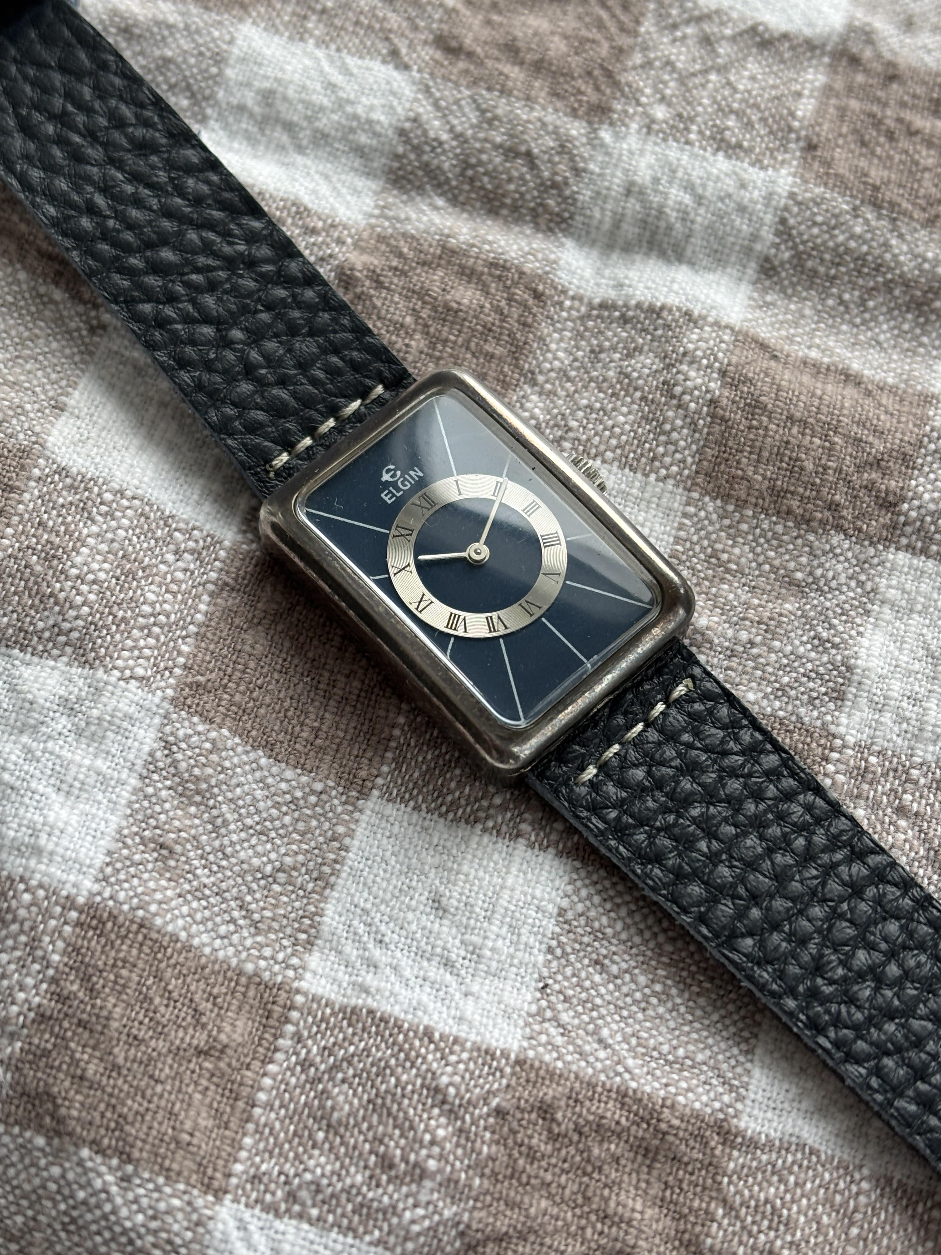 Hello everyone! For your consideration is this unique tank by Elgin. Its solid silver case measures in at 24mm. It features a lovely blue dial with an applied Roman numeral ring. Elgin was definitely paying homage to the stylings of the big players of the time with this one. [Photos](https://imgur.com/a/CnPukda) [Timestamp](https://i.imgur.com/4bMYdct.jpeg) * Case: 24mm Solid Silver * Dial: Original * Crown: Original * Movement: Swiss Manual **I’m asking $275 for this watch. I’m not looking to trade at this time, thanks.** If interested, please consider following [Crooked River Vintage](http://www.instagram.com/crookedrivervintage) on Instagram for other vintage watch offerings. I will respond more quickly to inquiries via Instagram, Reddit can be difficult for me to check during the day. Please don't hesitate to DM me with specific questions or pic requests! **I will consider all offers.** Asking price includes shipping CONUS via USPS Priority Mail. Alternative carriers and International shipping can be negotiated. I prefer PayPal F&F for payment (add 4% if Goods and Services with good feedback). As will all vintage watches, exposure to water is not recommended and total accuracy and duration cannot be guaranteed. Unless otherwise noted service history is unknown. [Please check my profile for my other offerings!](https://www.reddit.com/user/farkasvirag/submitted/) Thanks and take care everyone!