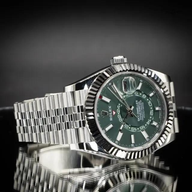 The Sky-Dweller (336934) boasts a 42mm steel case with a white-gold fluted bezel. Its mint green dial features luminous hour markers and hands, along with an off-center 24-hour GMT disc and a date window magnified by a Cyclops lens at 3 o’clock. Red luminous indicators above the hour markers indicate the month. The watch is paired with the iconic Jubilee bracelet, renowned for its comfort and durability.