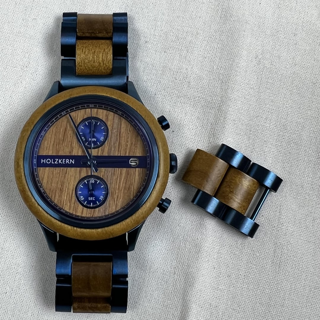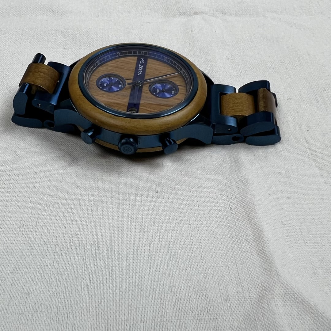 [Timestamp/Proof](https://imgur.com/a/YHmrkM3) **BRAND** : *Holzkern* **MODEL** : *VERRAZZANO* **CASE SIZE** : *42mm* **CASE MATERIAL** : *All Stainless Steel* **MOVEMENT** : *Citizen Miyota 6S11 Quartz* **CRYSTAL** : *Hardened Mineral Crystal* **CASEBACK** : *4-Screw Engraved* **STRAP** : *20mm Blue Stainless/Koa Wood* **INDEXES/HANDS** : *Non-Luminous* Contents: **This comes WATCH ONLY, no box, papers, etc.** **Condition** : Overall condition is great outside of a small barely noticeable scratch on the bezel near 11 o’clock (See Pics) The watch is designed for men with a maximum wrist size of 7.6-8 inches (sized for my 6” wrist but extra links are included) and a lug width of 20mm. It is a dress/formal style watch that can also be worn casually. 100% fully functional without any issues. The watch was barely worn and almost new condition. Feel free to reach out to me with any questions or concerns of interest.