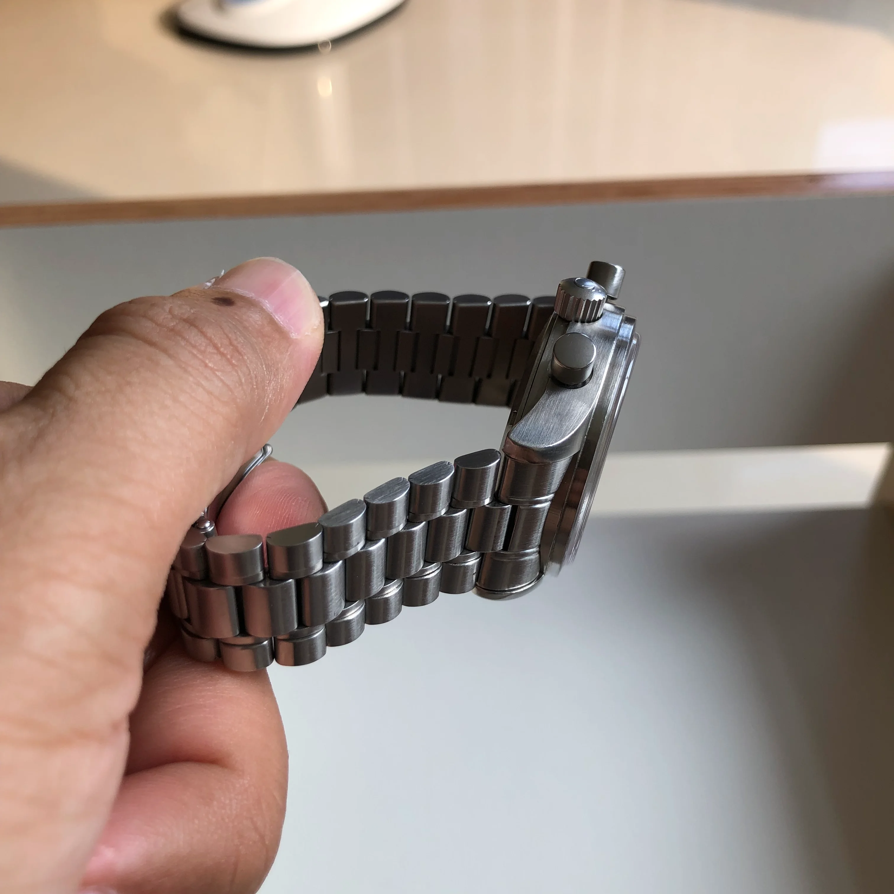 - Case: The diameter is 38mm without the crown. Original case with hairline scratches. Original big screw down crown and two pushers.