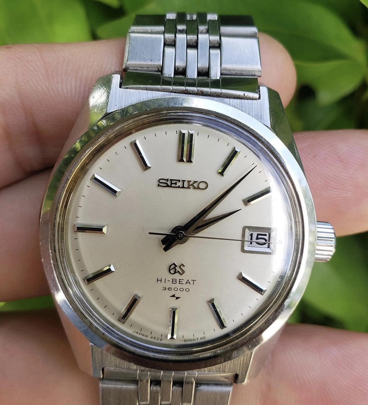 Bracelet is a Seiko SS LordMatic bracelet which fits the watch very well, but is not the original GS bracelet for this reference. Fits my 7 3/4" wrist comfortably. If buyer prefers I can change to a nice leather strap.