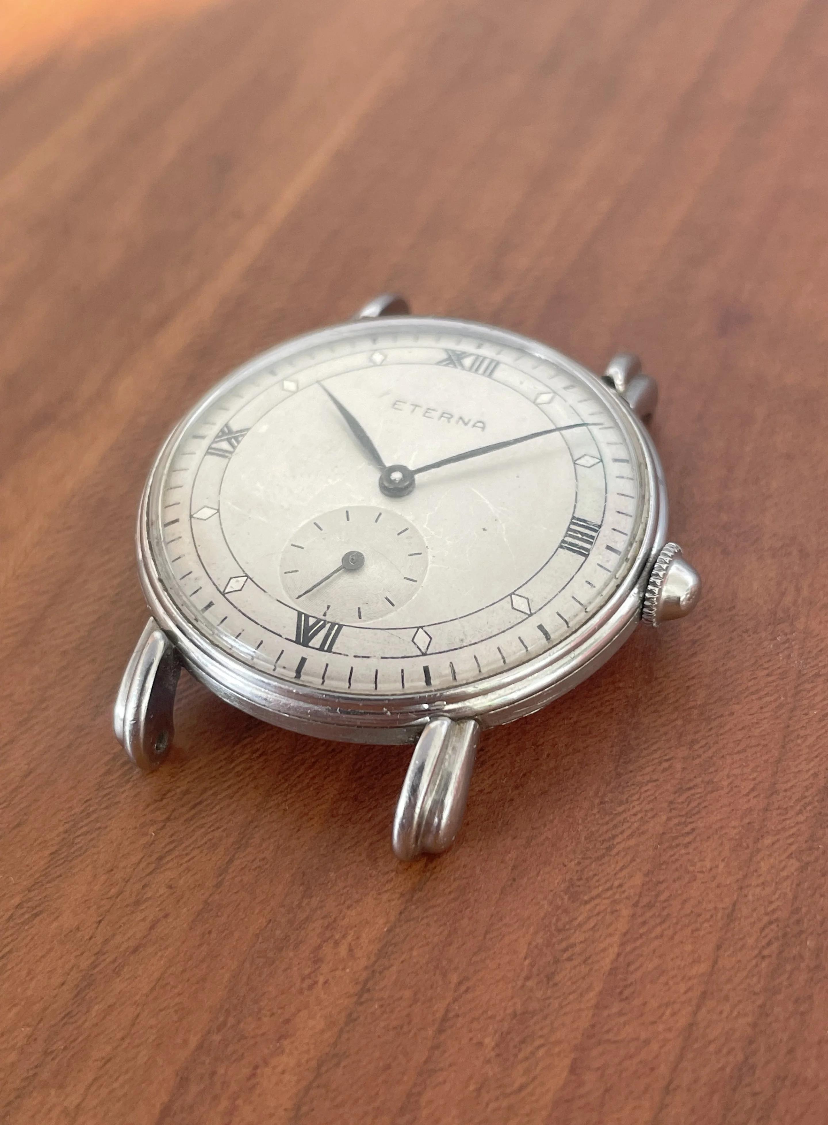 For sale is this 1940s Eterna with a fancy case and a nice dial design.