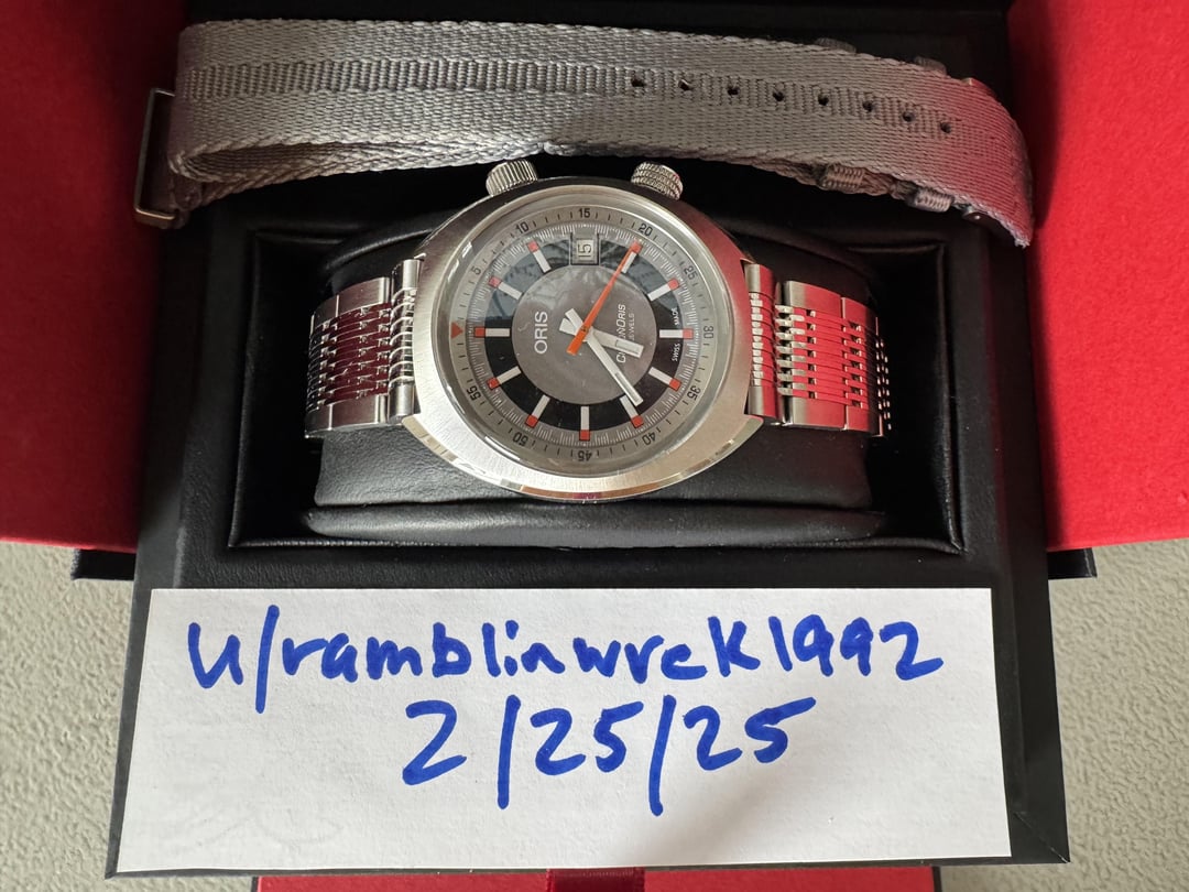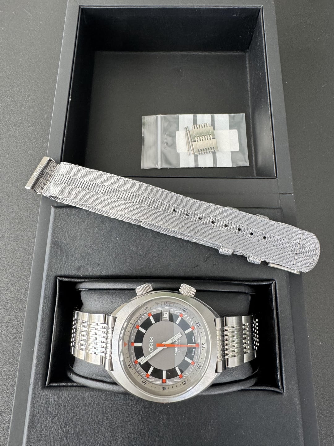I'm selling this Oris Chronoris 39mm to fund another purchase. The watch is in excellent condition. A few desk diving marks on the bracelet clasp. Comes with full kit. Also comes with the Oris Nato strap. You can find details of the watch here - [Oris Chronoris](https://www.oris.ch/en-US/product/watch/chronoris/chronoris-date/01-733-7737-4053-07-5-19-23) The retail price is $1750. I'm asking **$725** shipped CONUS. Zelle, PayPal F&F, and Venmo with good transaction history. No trades so no need to ask! Let me know if you have any questions. Happy to do FaceTime or provide more pics upon request.