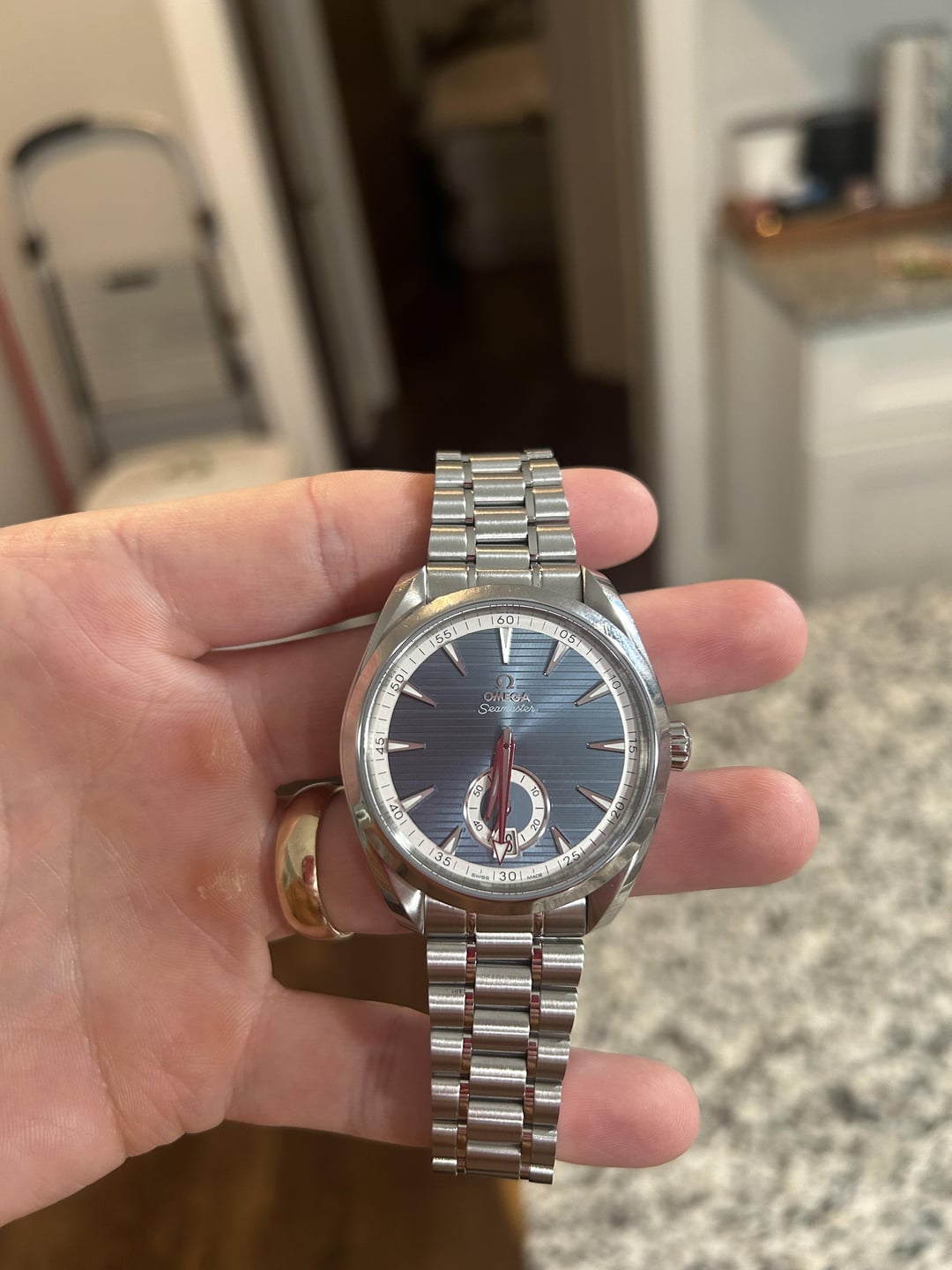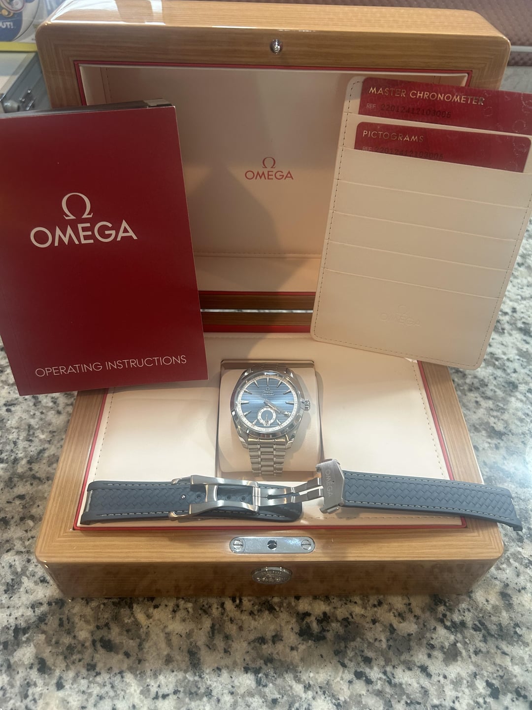 Up for sale is my Omega Seamaster Aquaterra small seconds blue-grey dial! This is a great Spring/Summer time watch, both of which are right around the corner.  Of course, as with any Omega, this watch is performing well within its expected standards.  I’m getting about +3.5sec/day, which is right where Omega’s testing put it at when verified through Omega’s website. The overall condition is great. This watch was originally purchased online from Prestige Time in Feb 2024, and it comes with a Prestige Time warranty (pics included). Original Omega box, Master Chronometer card, and Pictogram card included.  This watch comes original with Omega Blue Rubber strap with deployant clasp.  I put an Uncle Straps stainless steel bracelet on it as well to give it a different feel, and this will be included ($160 value) in the sale! The extra links and spring bars will be included as well. Specs: This watch is a Co-Axial Master Chronometer caliber 8916 with METAS certification. 41mm, self-winding, 60 hours power reserve, screw-down crown, 500ft water resistance, exhibition caseback. **PRICE\*\*: $4200 OBO\*\*** Shipped via FedEx. I prefer payment with Zelle or Paypal. As soon as I confirm payment, I will get it shipped to you ASAP! If you live in Southwest Ohio or within an hour or so, we can always meet up to do an in-person transaction. If you want to Facetime, or call me, I am more than welcome to do that. Please comment on the post before messaging. Thank you!