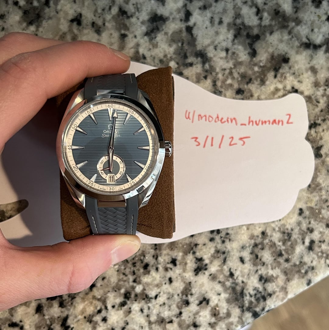 Up for sale is my Omega Seamaster Aquaterra small seconds blue-grey dial! This is a great Spring/Summer time watch, both of which are right around the corner. Of course, as with any Omega, this watch is performing well within its expected standards. I’m getting about +3.5sec/day, which is right where Omega’s testing put it at when verified through Omega’s website. The overall condition is great. This watch was originally purchased online from Prestige Time in Feb 2024, and it comes with a Prestige Time warranty (pics included). Original Omega box, Master Chronometer card, and Pictogram card included. This watch comes original with Omega Blue Rubber strap with deployant clasp. I put an Uncle Straps stainless steel bracelet on it as well to give it a different feel, and this will be included ($160 value) in the sale! The extra links and spring bars will be included as well. Specs: This watch is a Co-Axial Master Chronometer caliber 8916 with METAS certification. 41mm, self-winding, 60 hours power reserve, screw-down crown, 500ft water resistance, exhibition caseback. **PRICE\*\*: $4200 OBO\*\*** Shipped via FedEx. I prefer payment with Zelle or Paypal. As soon as I confirm payment, I will get it shipped to you ASAP! If you live in Southwest Ohio or within an hour or so, we can always meet up to do an in-person transaction. If you want to Facetime, or call me, I am more than welcome to do that. Please comment on the post before messaging. Thank you!