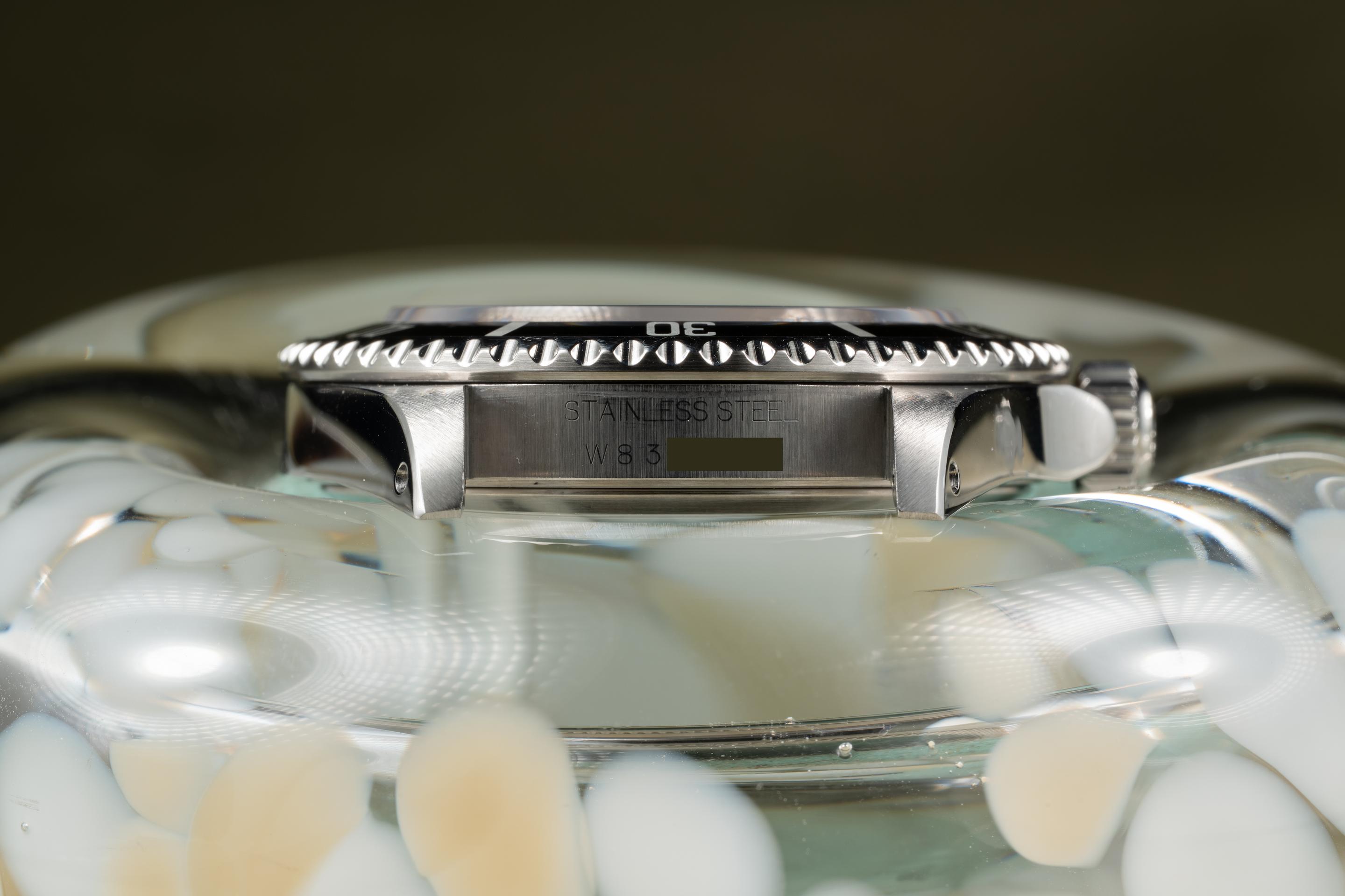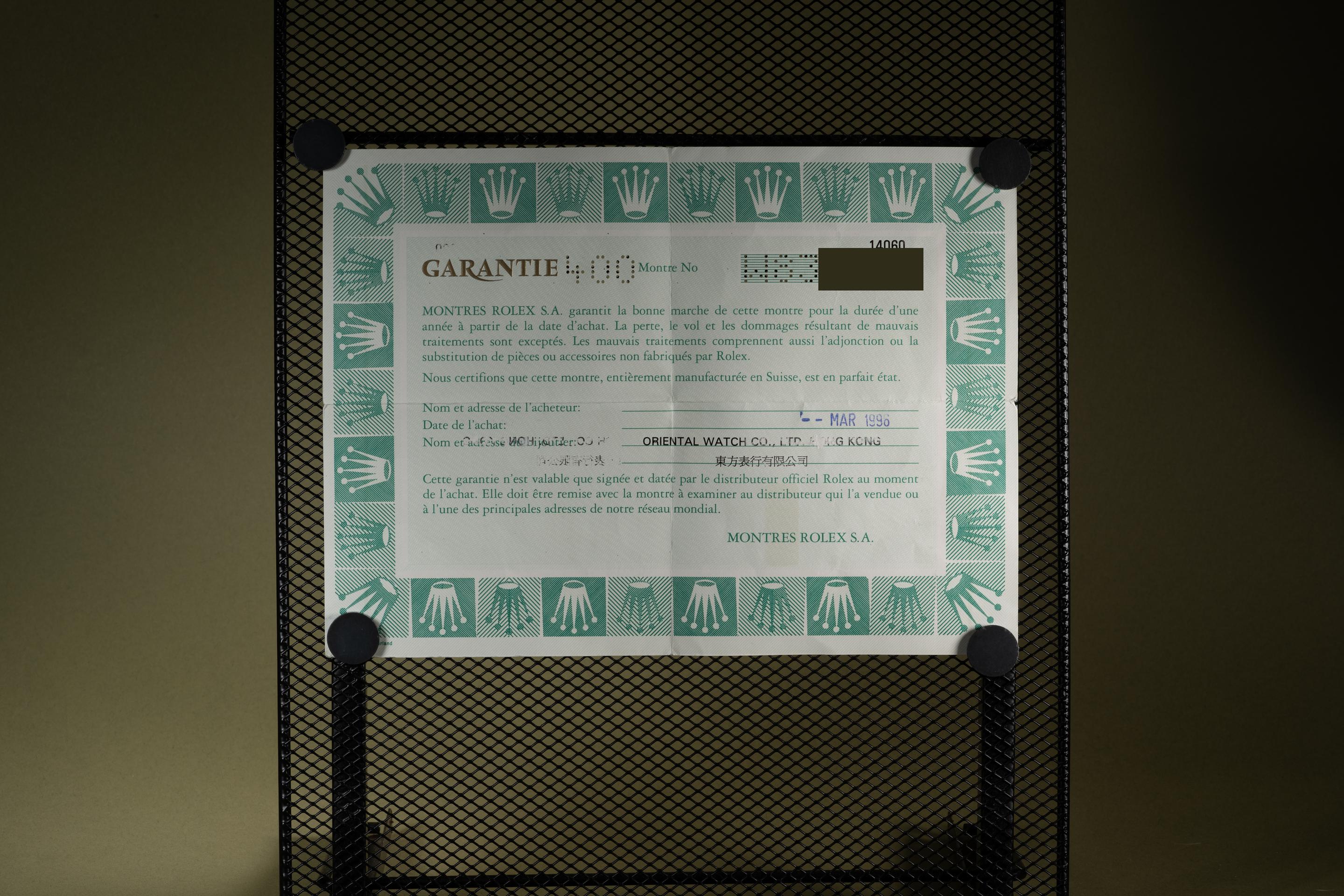 Description: Case: The recently polished case is excellent, showing only light wear from use. The black bezel insert is also in excellent condition, showing only light wear from use. Dial: The glossy black dial is excellent, showing only very light wear for its age. The lume has aged to a clean creamy hue, and the hands match perfectly. Bracelet: The 11 link oyster bracelet is excellent showing only very light stretch for its age. The clasp is stamped with a matching 1995 date code. Accessories: Papers.