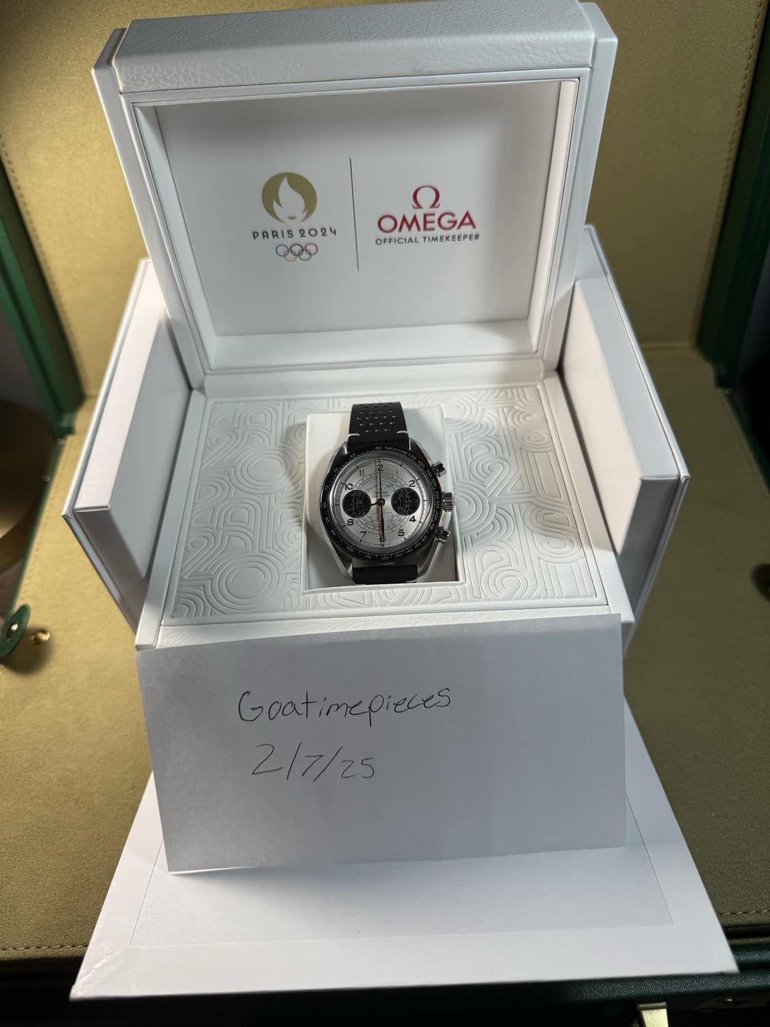 Hello r/watchexchange family! Every watch comes with FREE CONSUS SHIPPING as long as you are following me on Reddit! Check out my profile daily so you don't miss out! I have a 2024 Paris Olympics chronoscope speedmaster. This stunner is a 43mm and has Arabic numerals in a moonshine gold. The dial is printed with 3 dark grey timing scales in a 1940’s “snail” design, including a tachymeter scale, a pulsometer scale, and a telemeter scale. Comes with: Inner & outer box Card holder Pictograms card Master chronometer card International warranty card Operation manual VERY VERY CLEAN🧼🧼 🔥STEAL the Paris for only $7300 shipped!🔥 Be quick and don’t miss it! More pics and details upon request