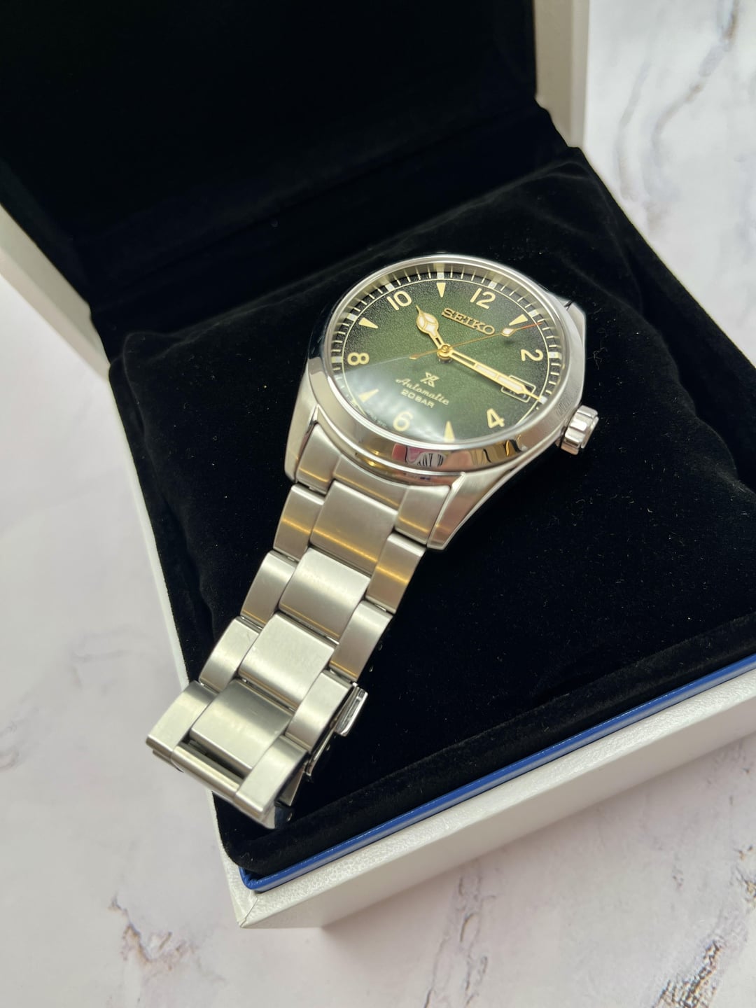 more or less a catch & release for me- was a daily wearer for a couple months, but got a new watch as a gift and paring down thanks to the recent delivery of a tiny child into our lives (will be posting more in the coming days... sigh) Actually quite like this watch. Good weight, solid size. boxes, and papers all there. some wear is visible, light scuffing, specifically on some of bracelet and clasp (check photos), but crystal is clear and gorgeous. screw down crown, everything working as it should. 4 extra links included in box- currently sized for a smaller wrist. Reference is SPB155 38 mm 6R35 Automatic, with Date $450, tracked continental US Venmo or Paypal ideal. (! If you would like to use G&S for paypal, please cover the fees)