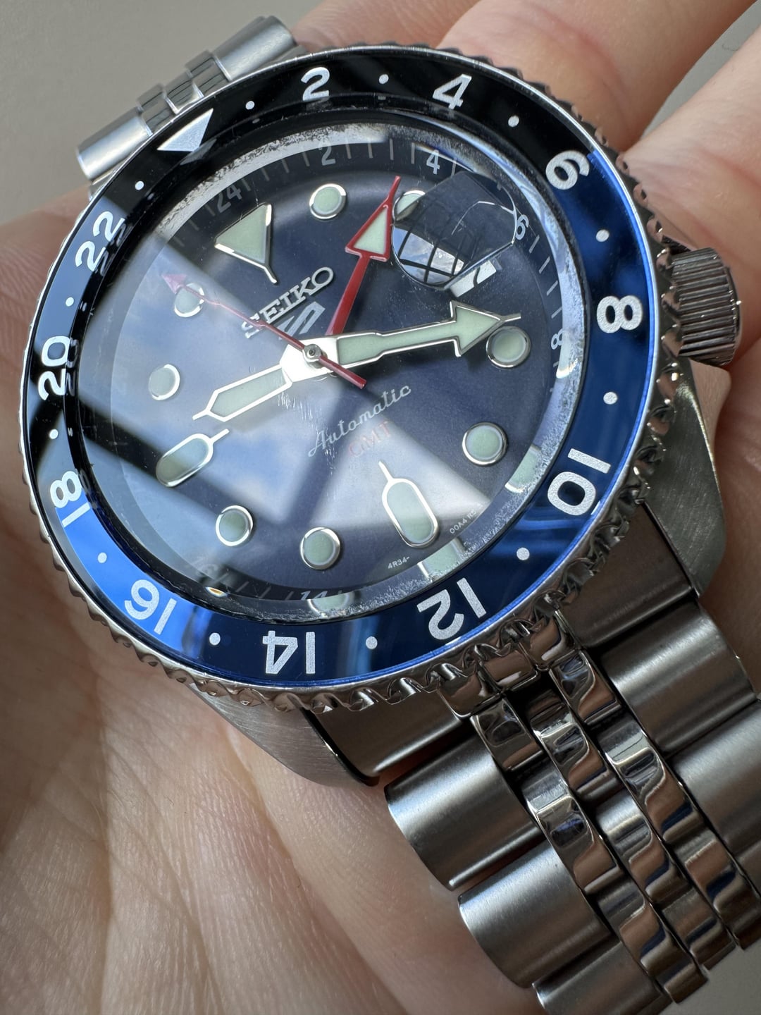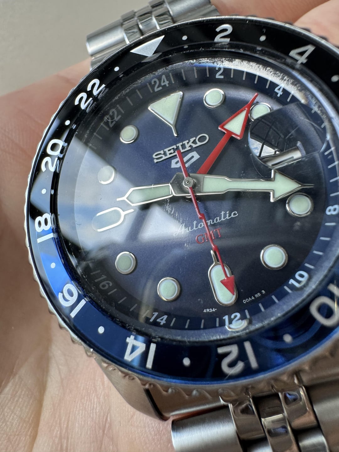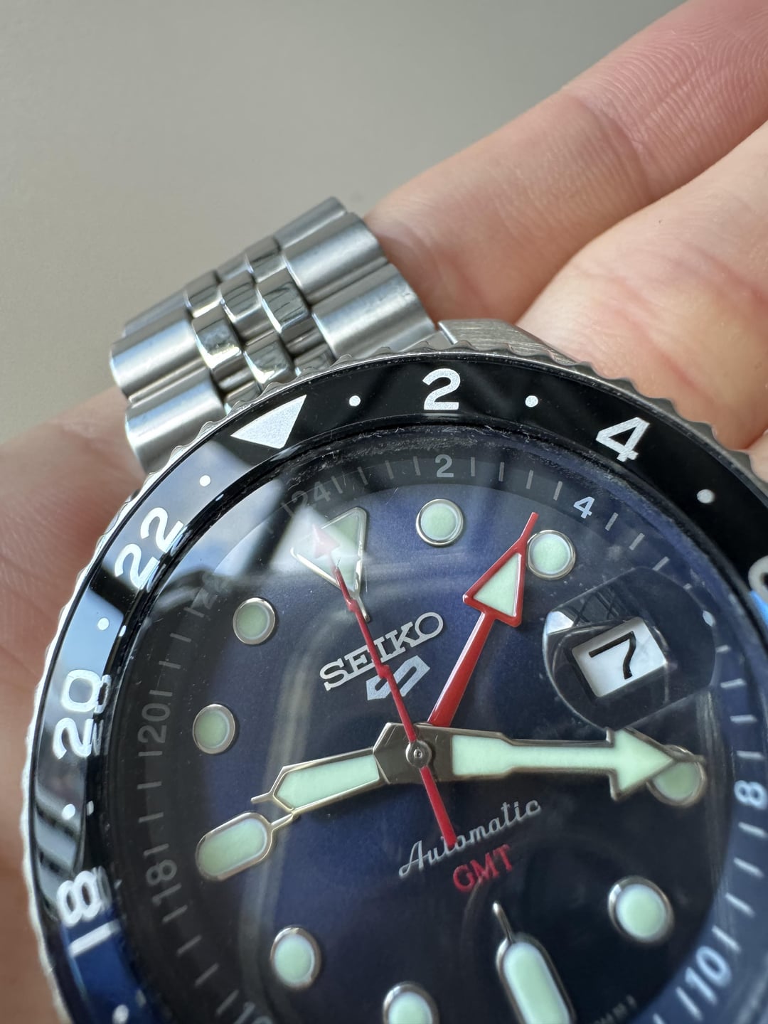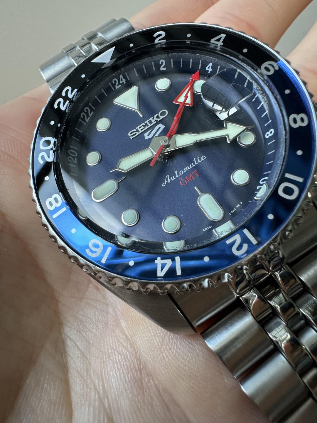 Selling my well used Seiko 5 GMT SSK003 Blueberry. Watch only, with links that fit up to 7.5” wrist snugly. Watch is in used condition, with a couple of scuffs on the crystal. Hairlines on the watch and bracelet as well - see photos for more clarity. Asking for $199 + shipping (~$20 to most parts of the world). Shipping from Singapore, so it will take 2-3 weeks to USA/Europe/Africa, 1-2 weeks to Asia/Australia. Priority shipping available at additional cost. Payment methods: Wise / Revolut (no fees), Crypto, PayPal G&S (+4.5%) or PayPal F&F Do comment before starting a chat or sending a PM, cheers!
