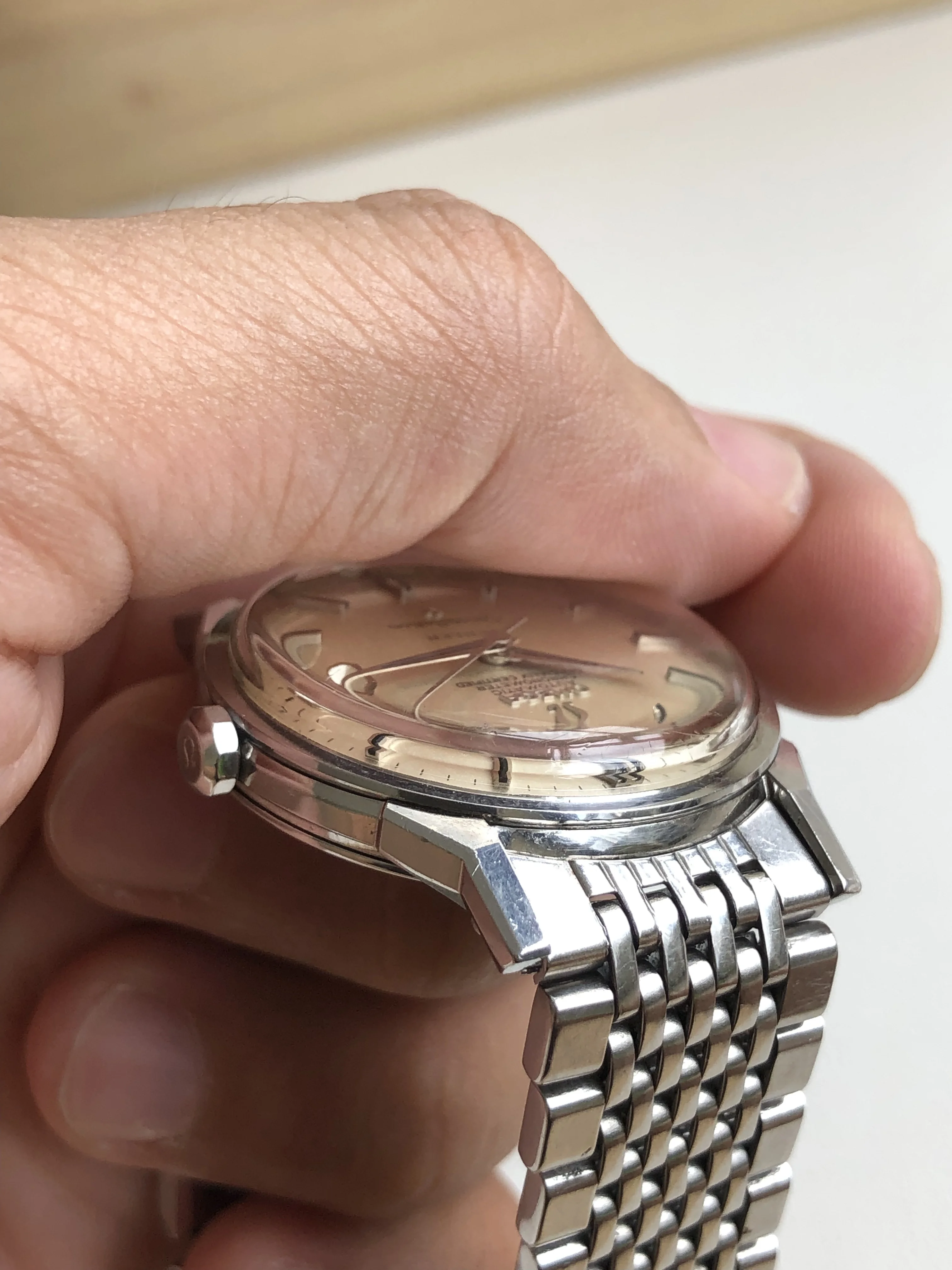 - Case: The diameter is 34.5mm without the crown. Original case in good condition with hairline scratches. Original thin Omega ten-sides crown.